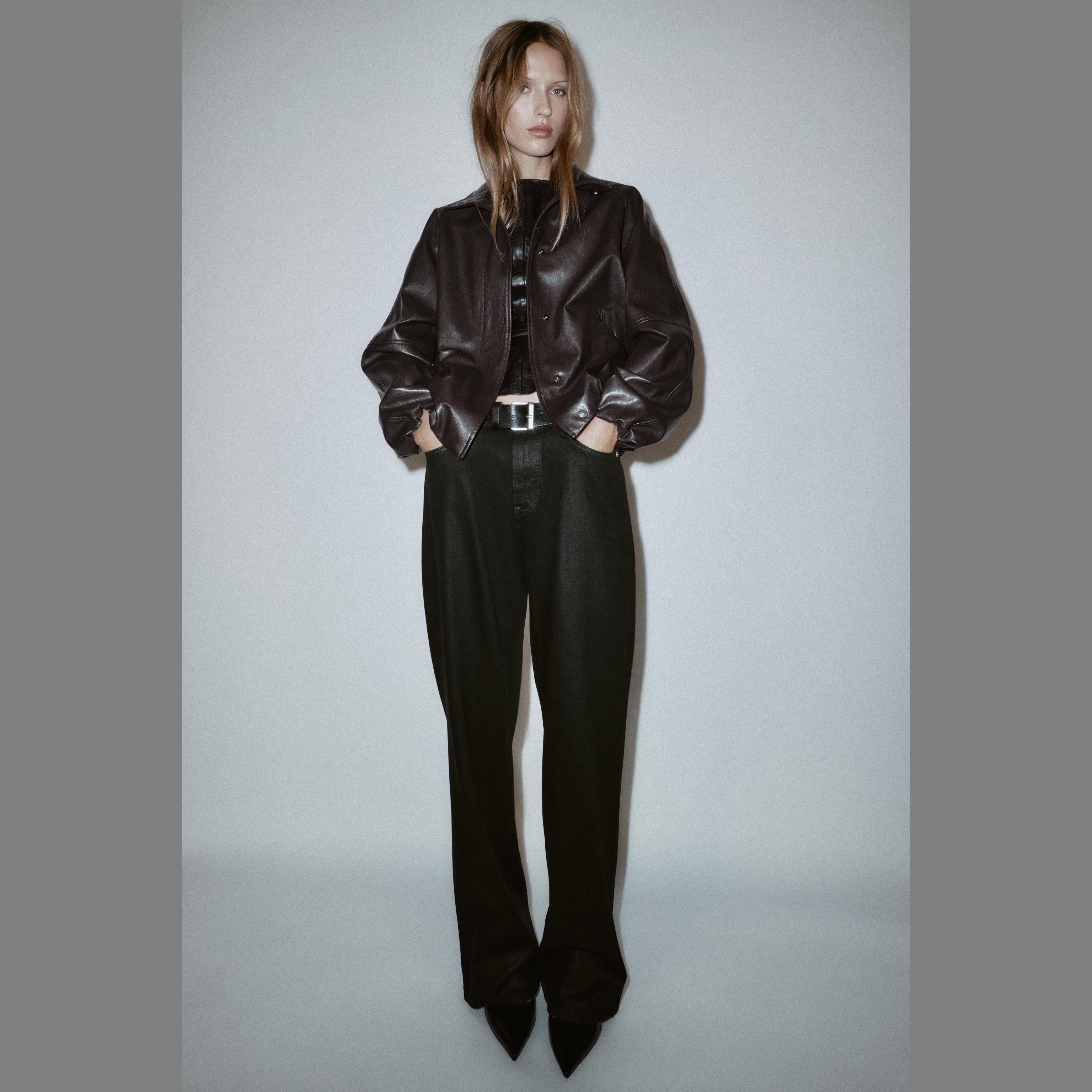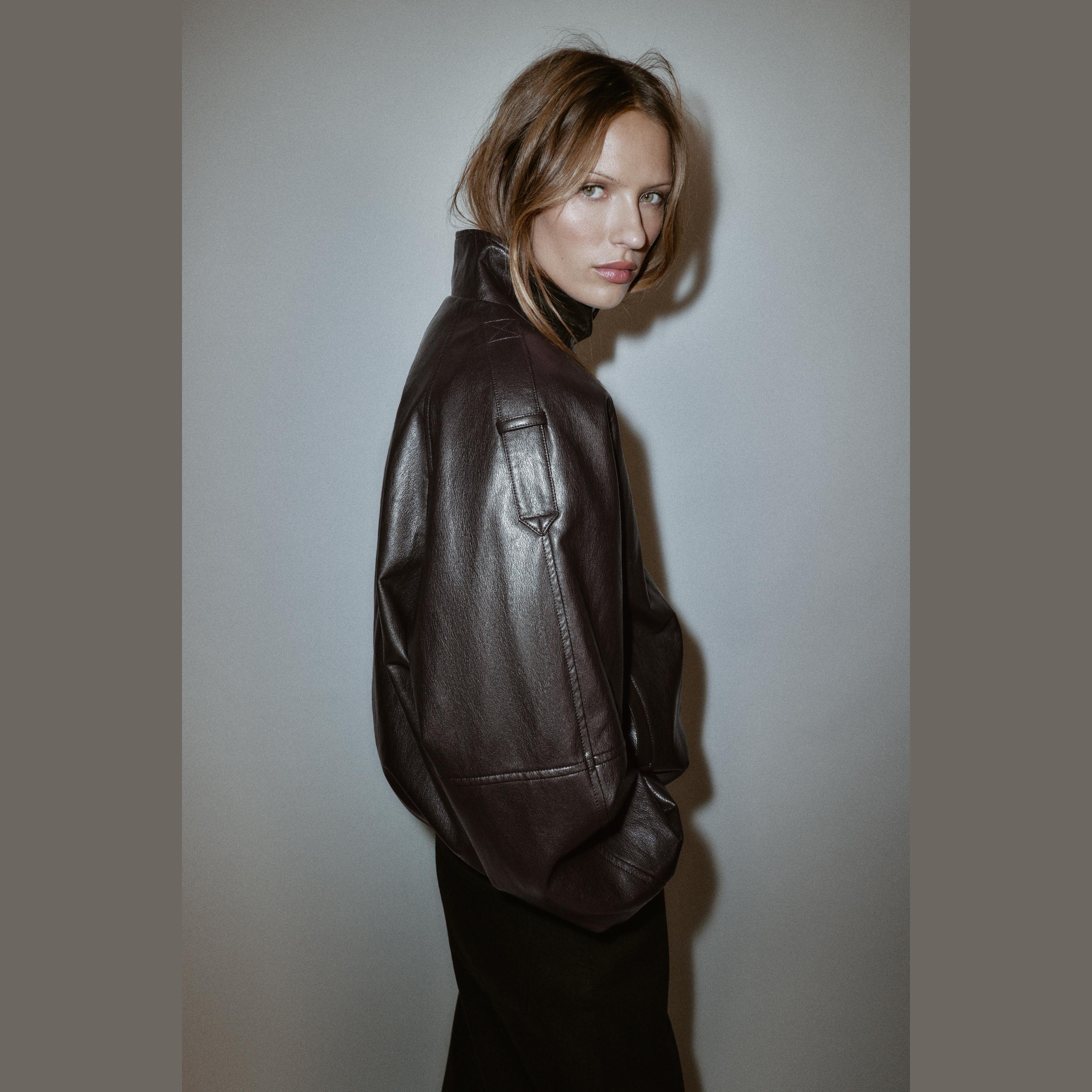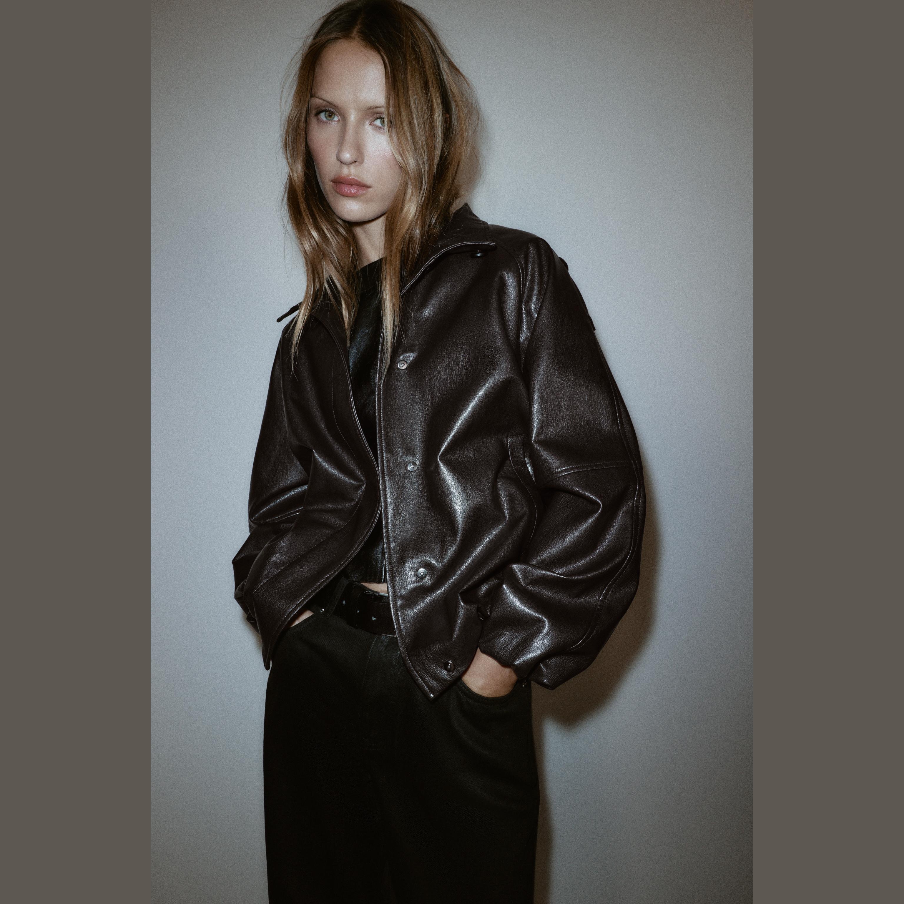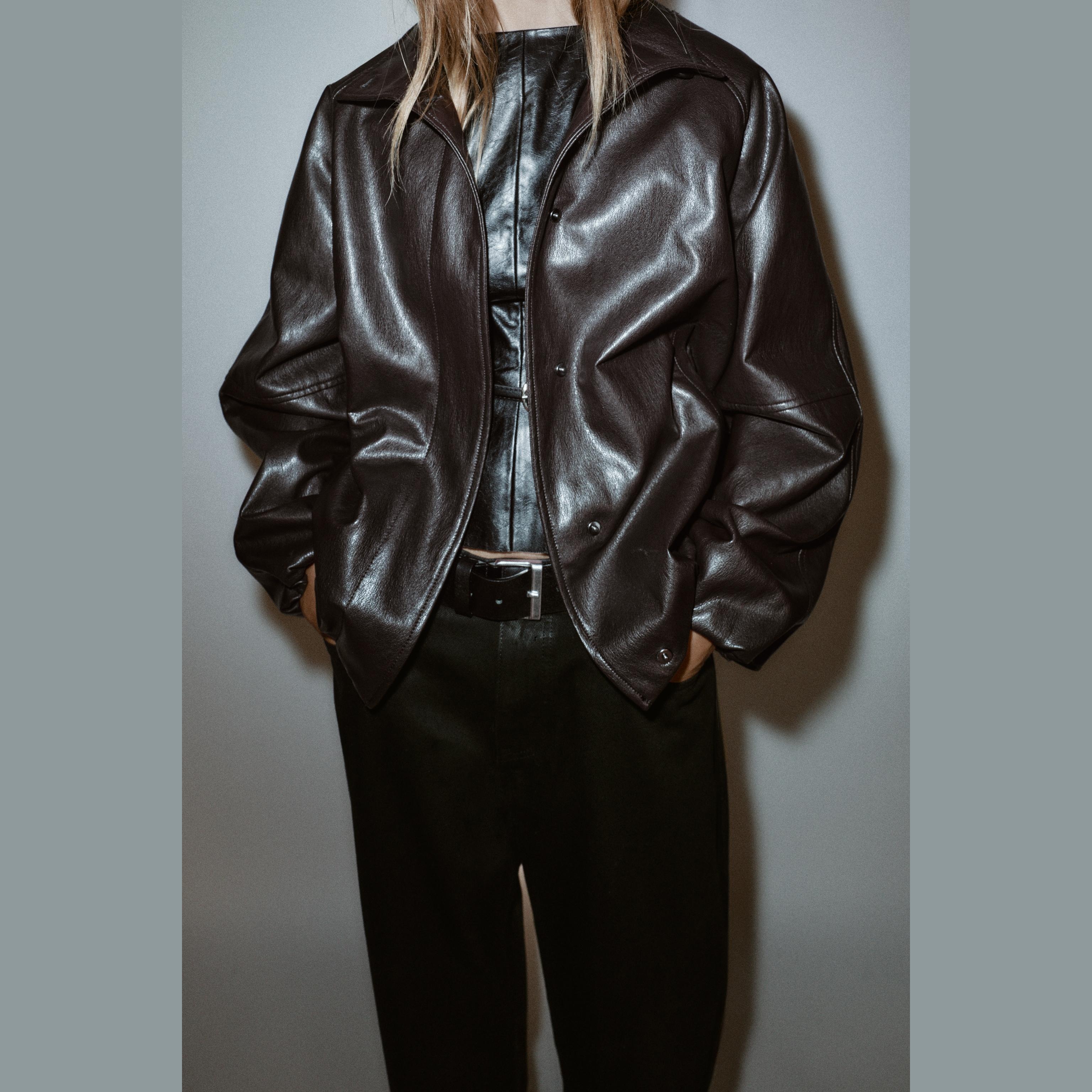 - التصميم: جاكيت جلد صناعي بياقة عالية (Faux Leather High-Neck Jacket)