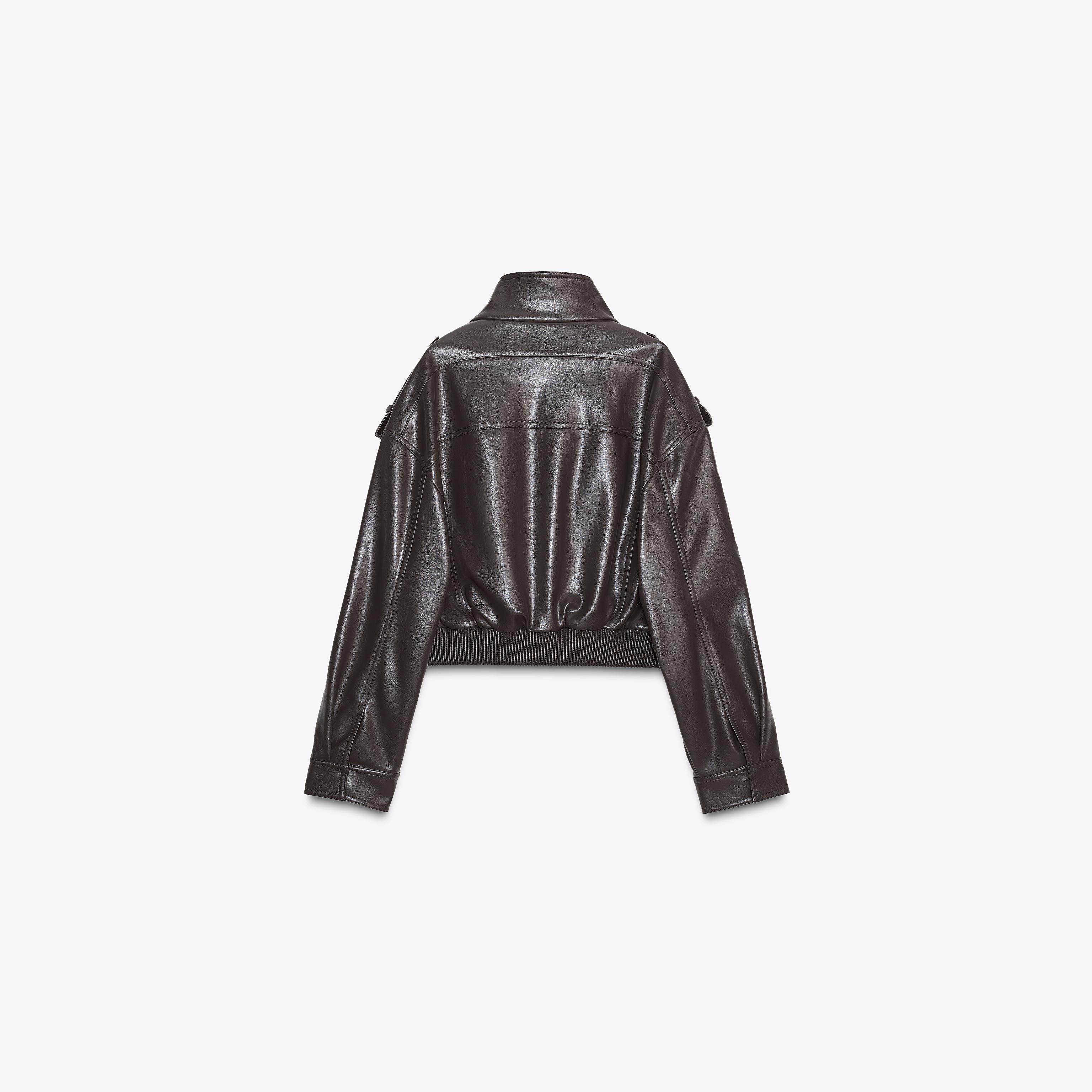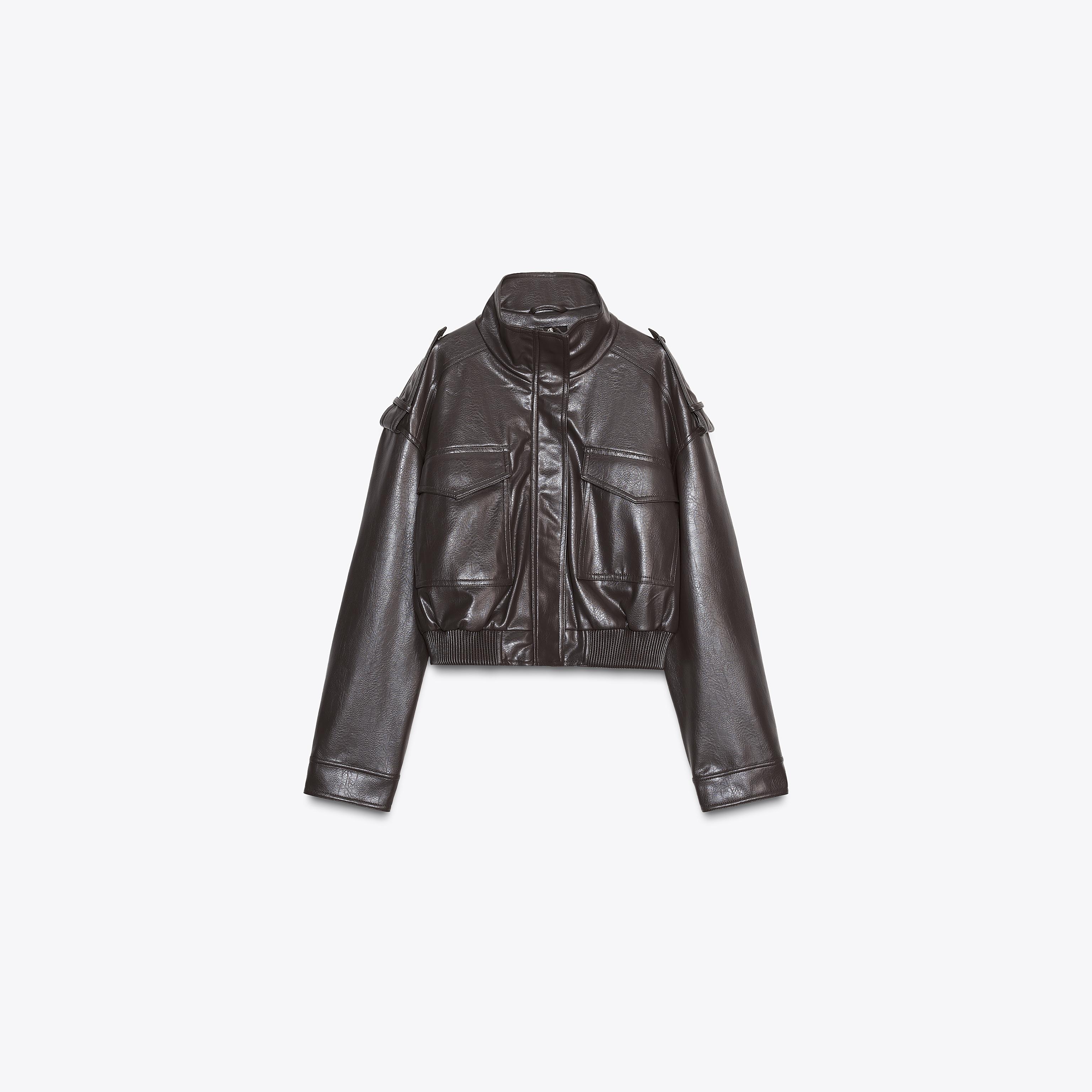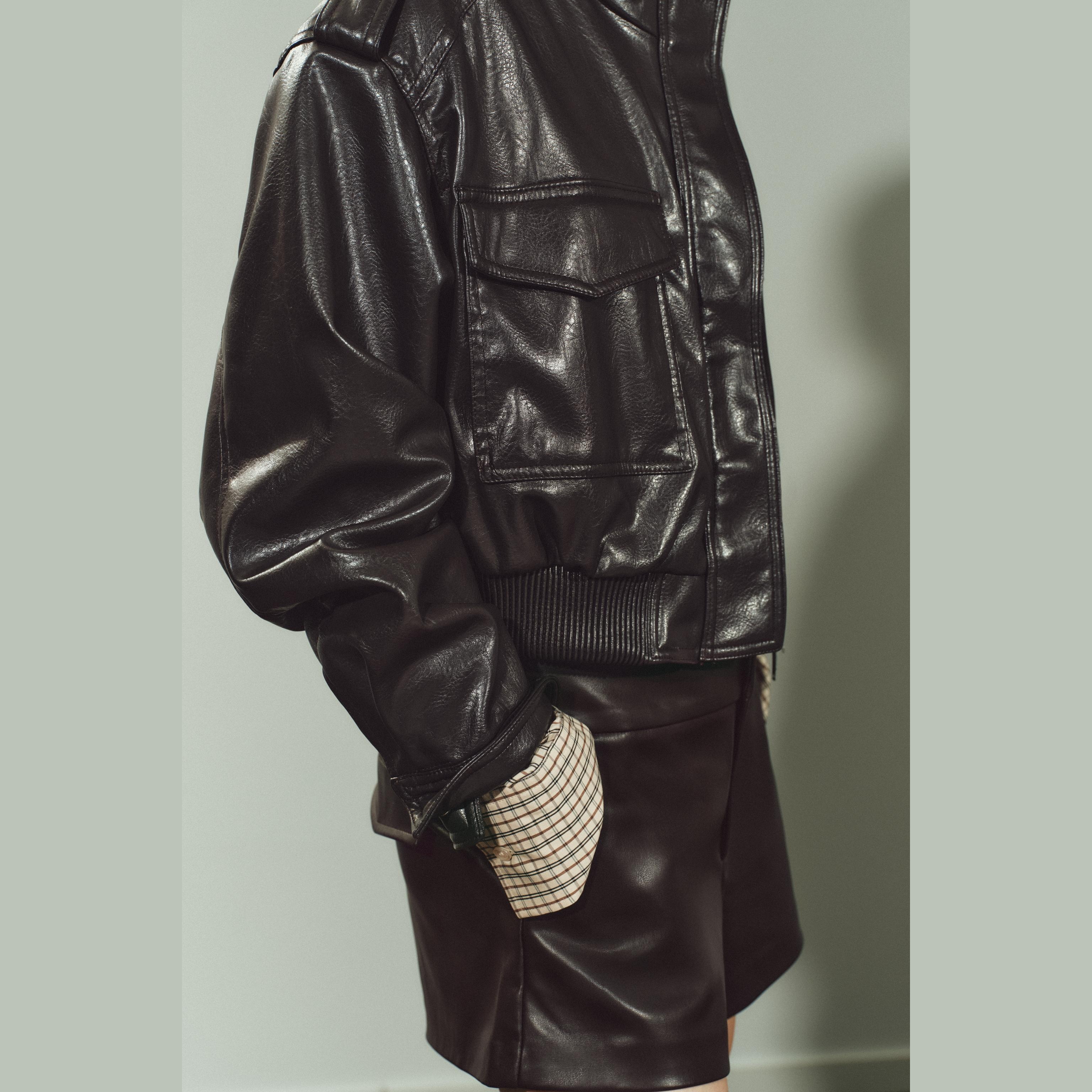 - التصميم: جاكيت قصير من الجلد الصناعي (Short Faux Leather Jacket)