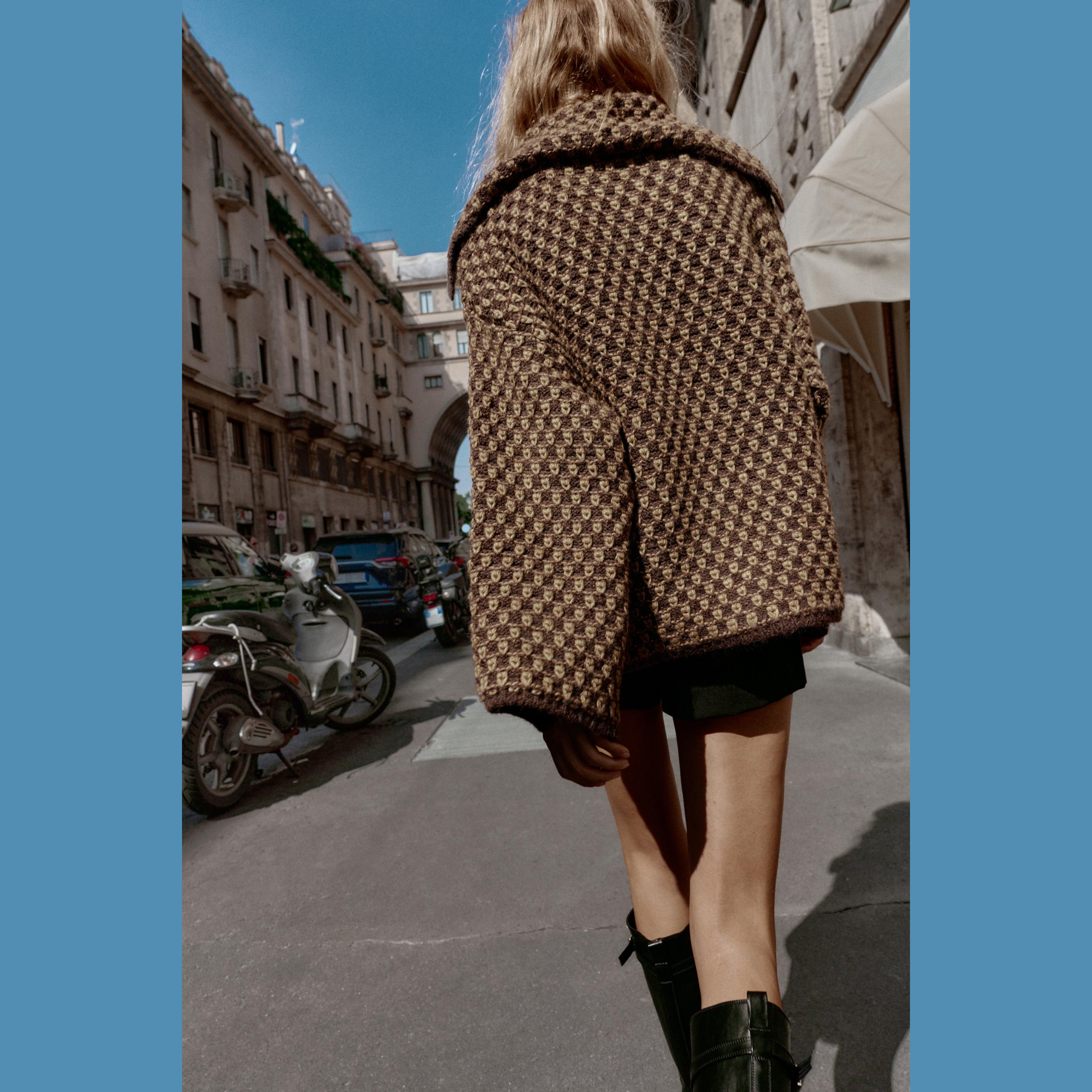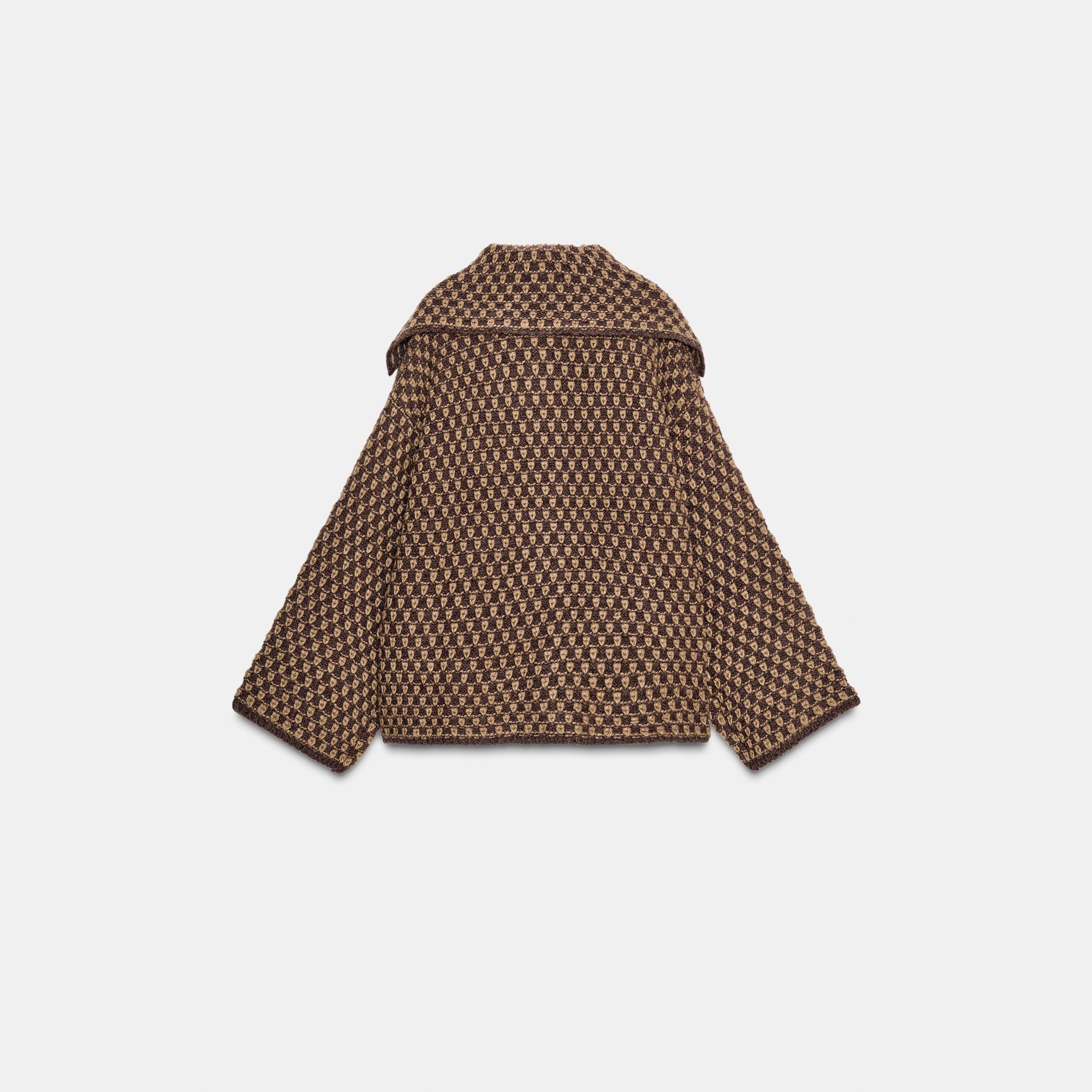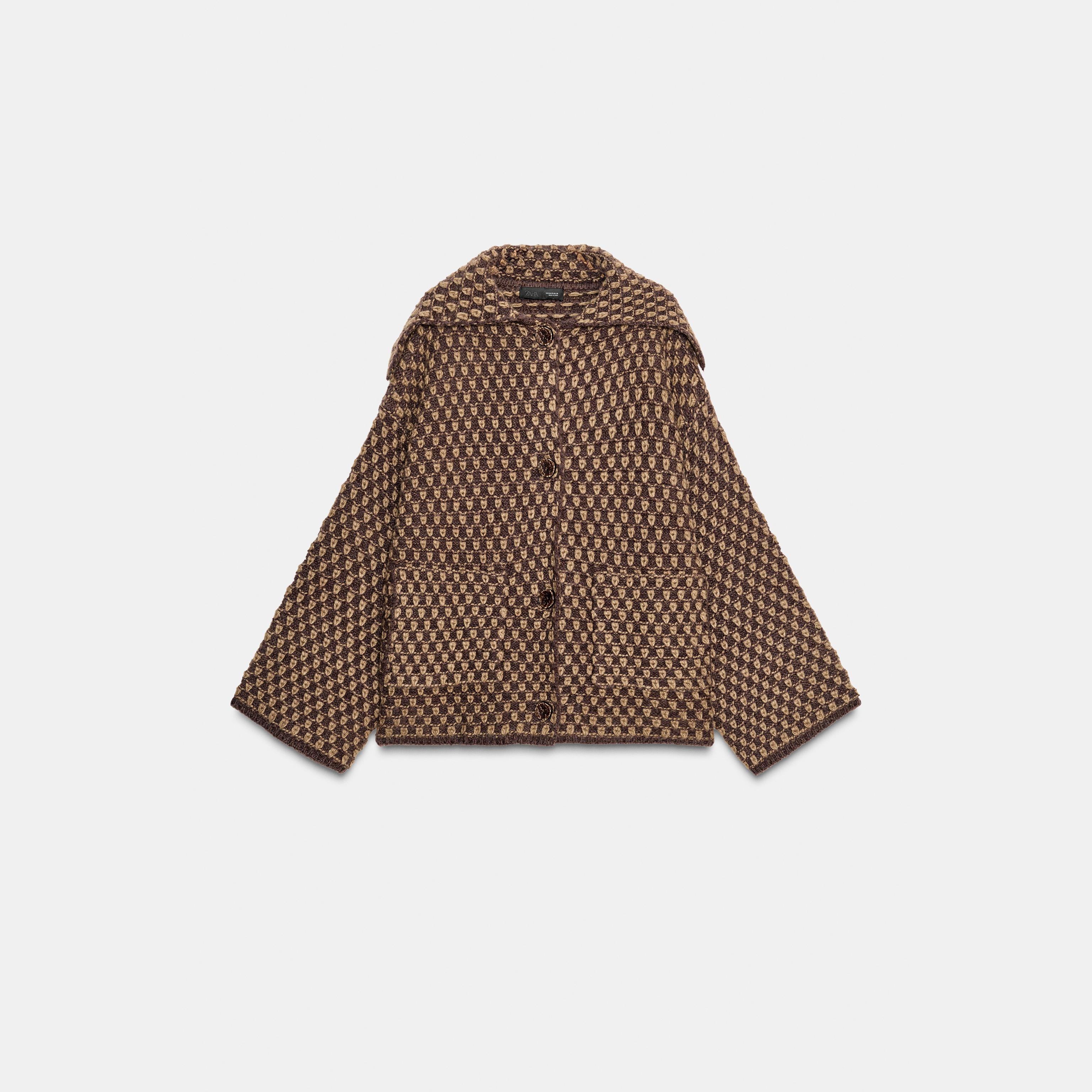 - التصميم: جاكيت محبوك أوفرسايز (Oversize Knit Jacket)