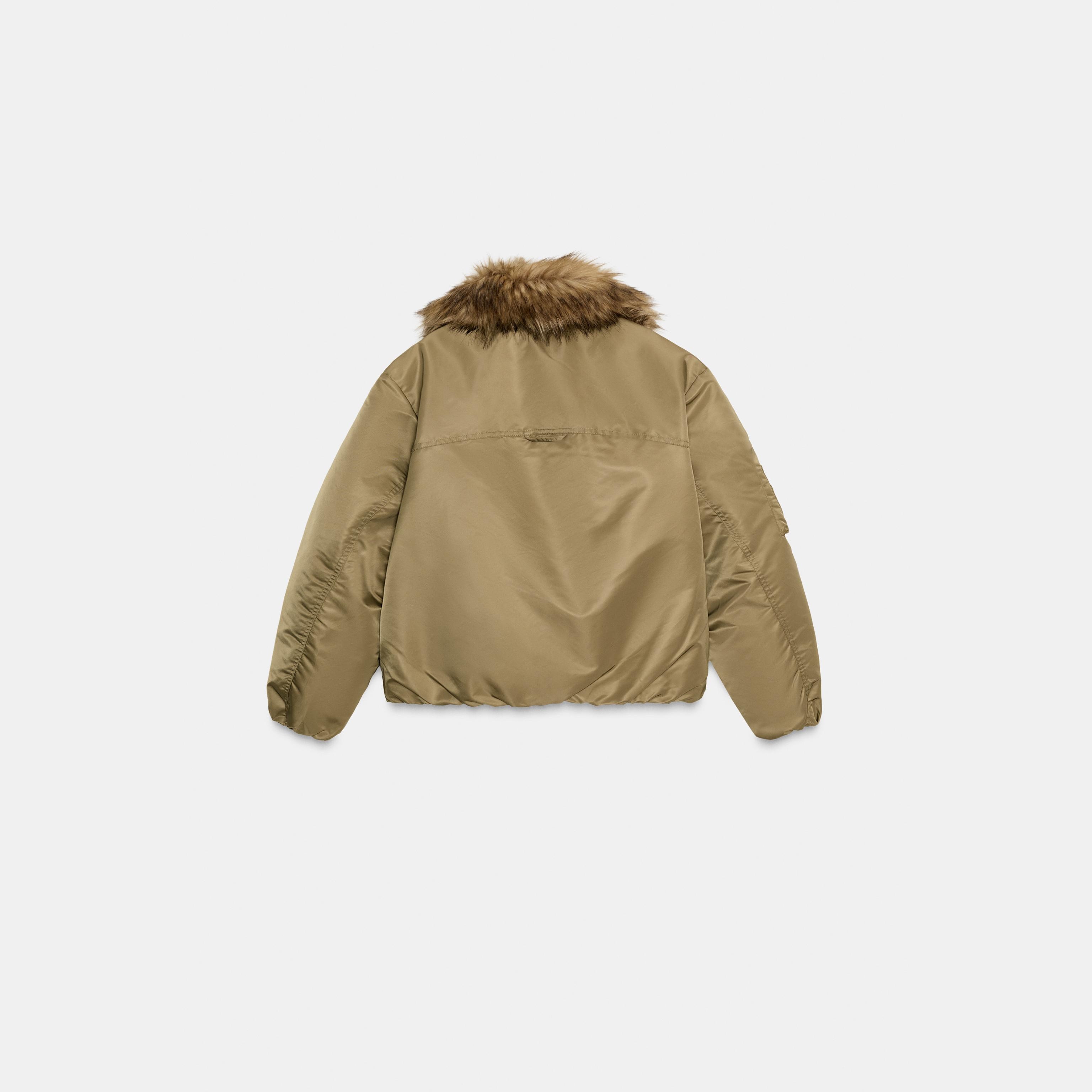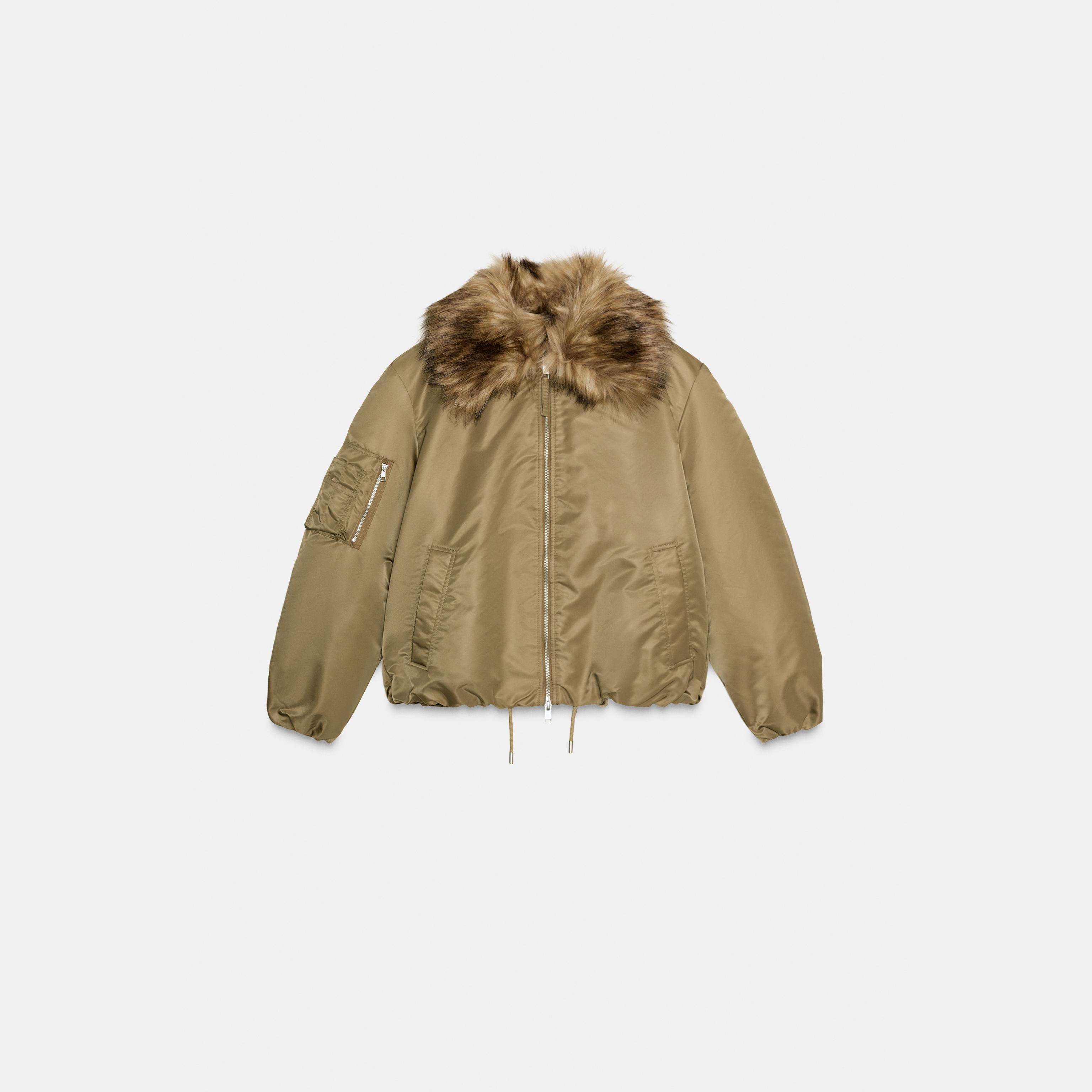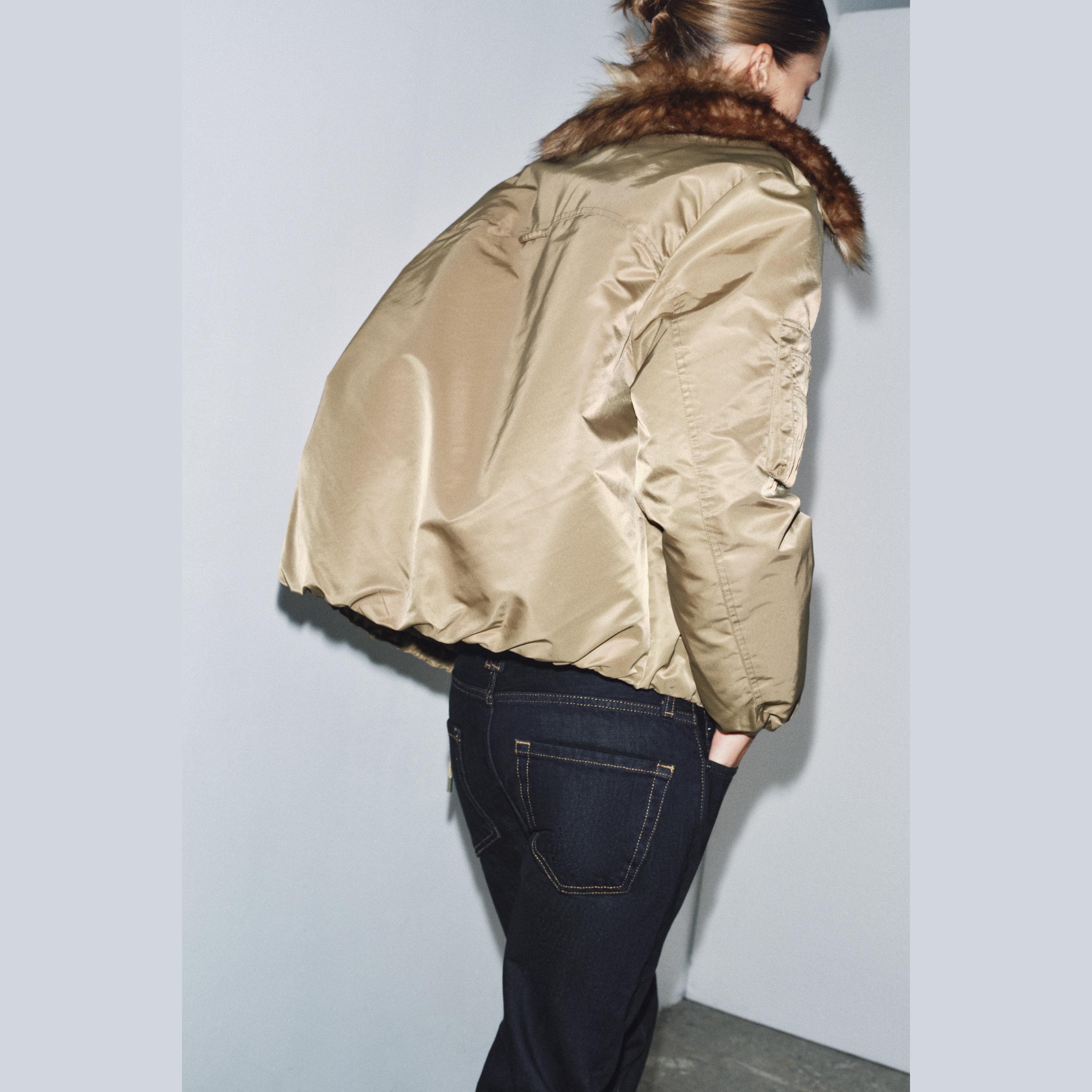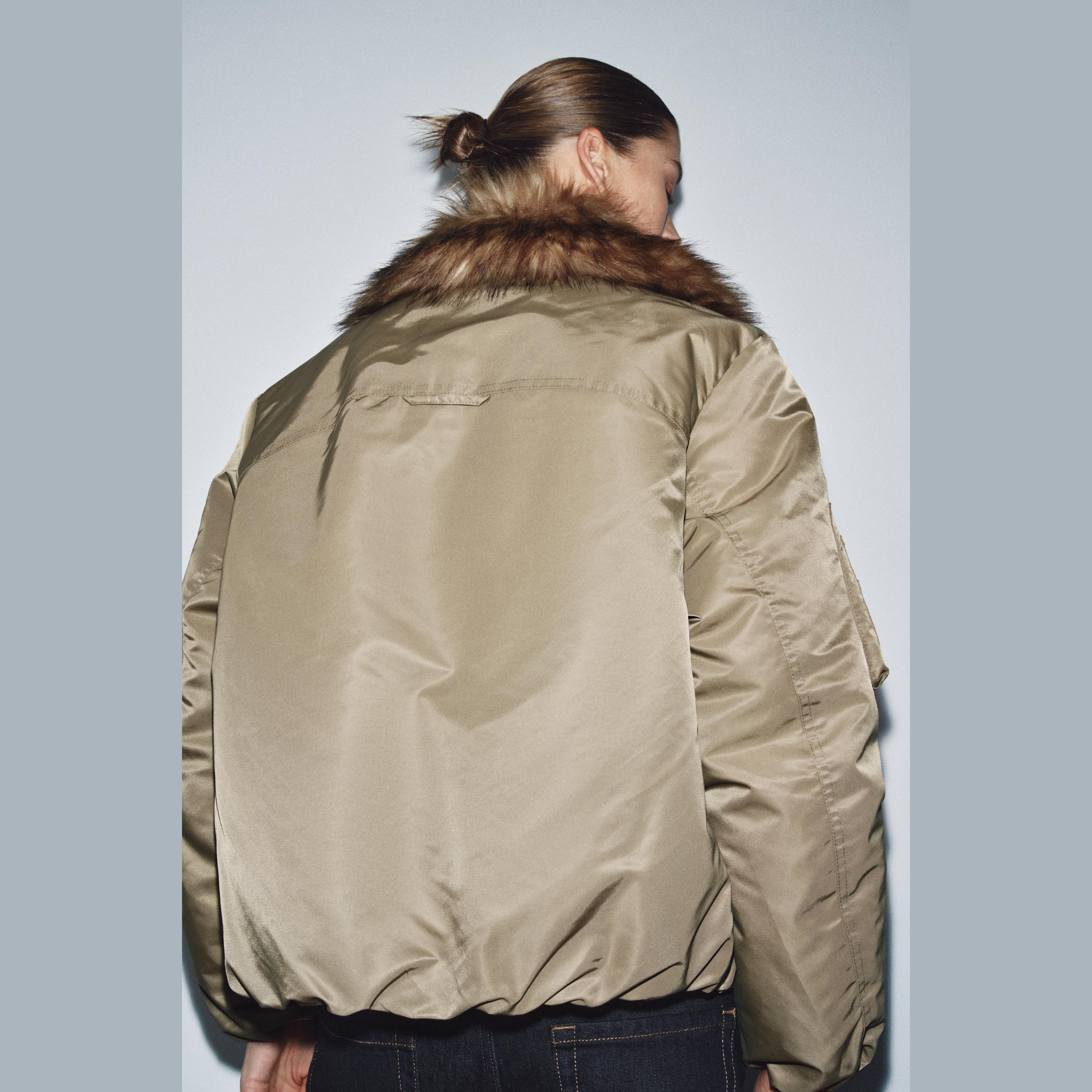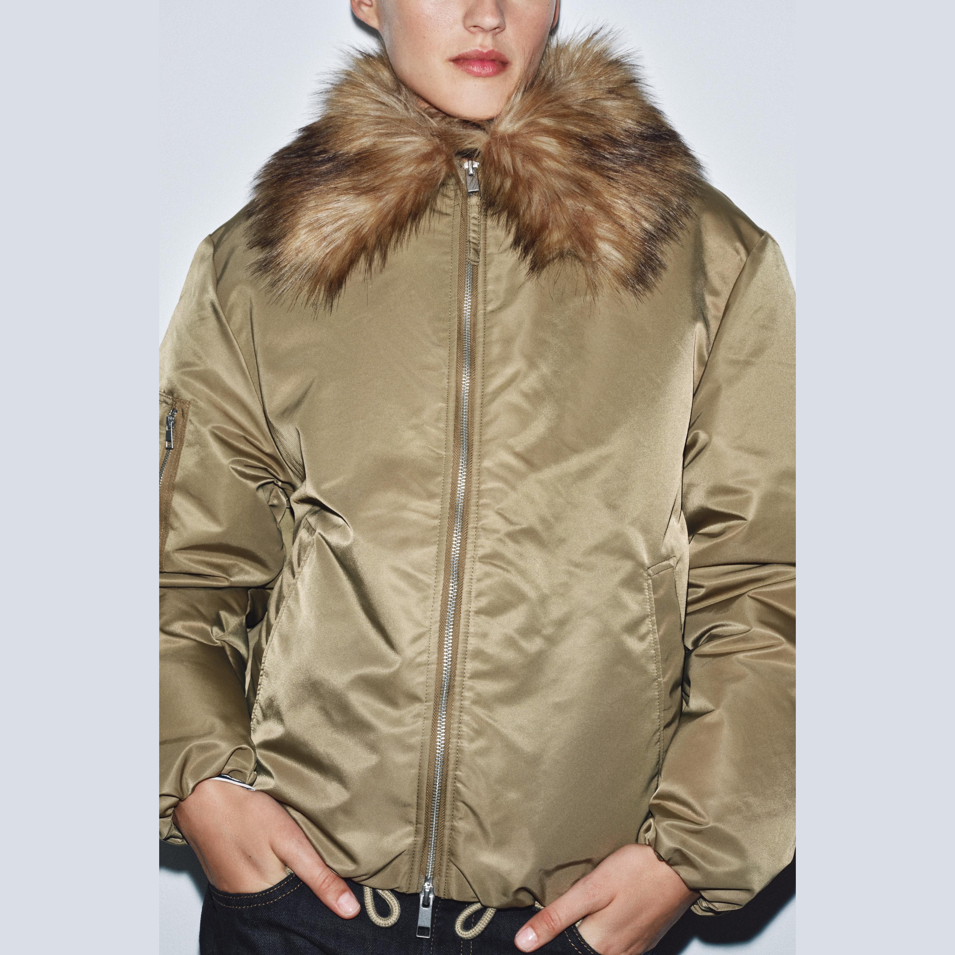 - التصميم: جاكيت بومبر مع ياقة فرو صناعي (Faux Fur Collar Bomber Jacket – ZW Collection)