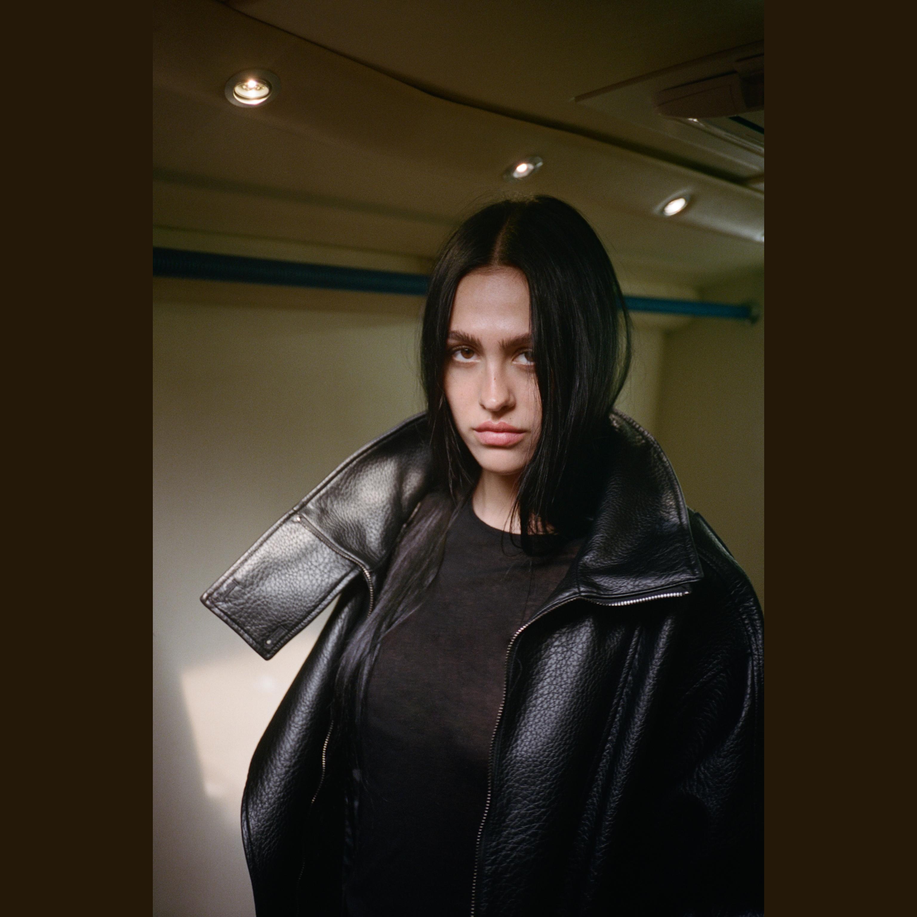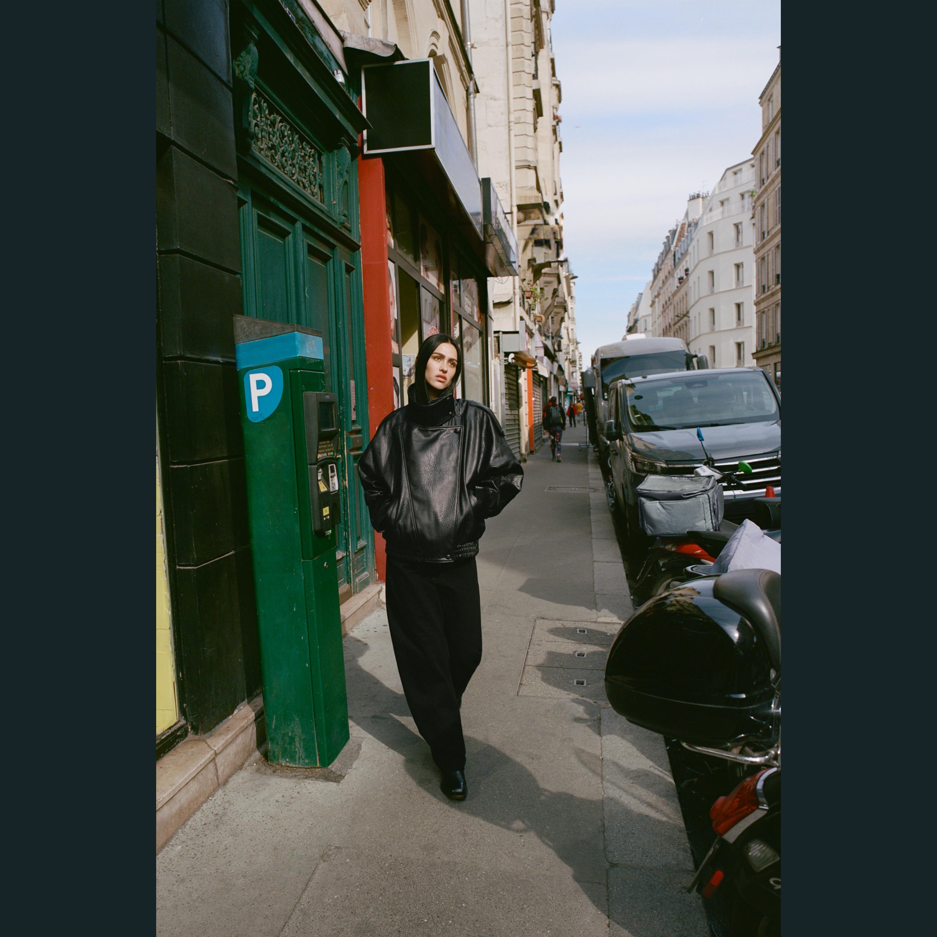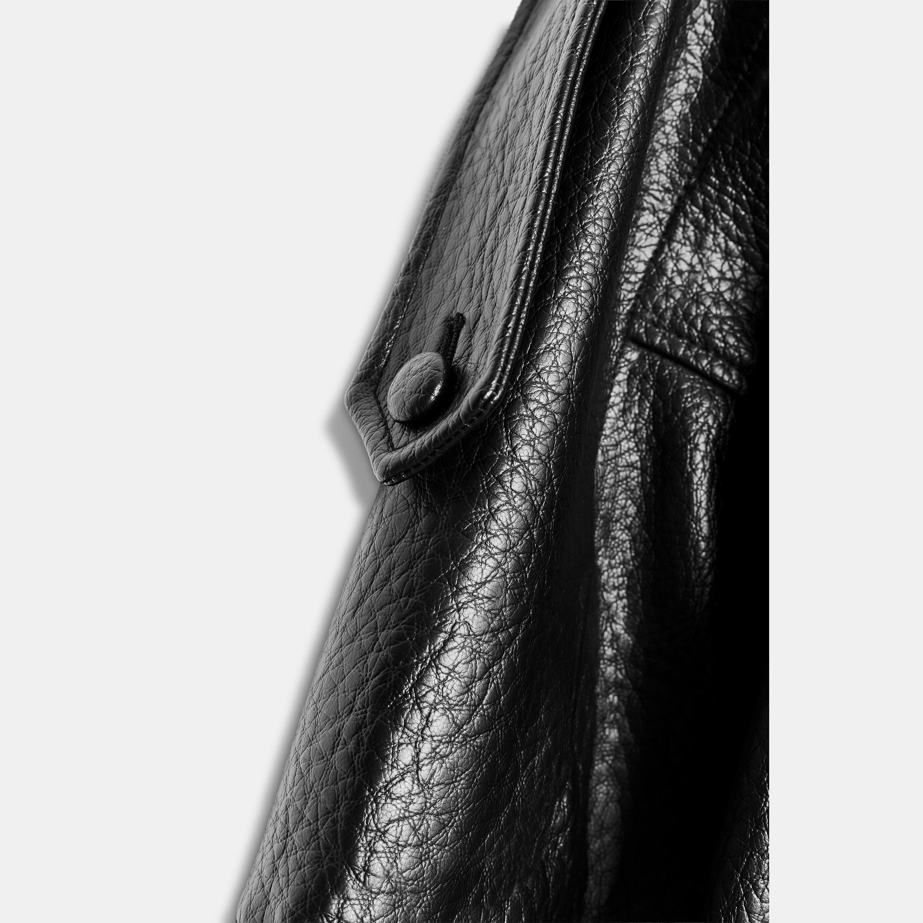 - التصميم: جاكيت جلد صناعي (Faux Leather Jacket)