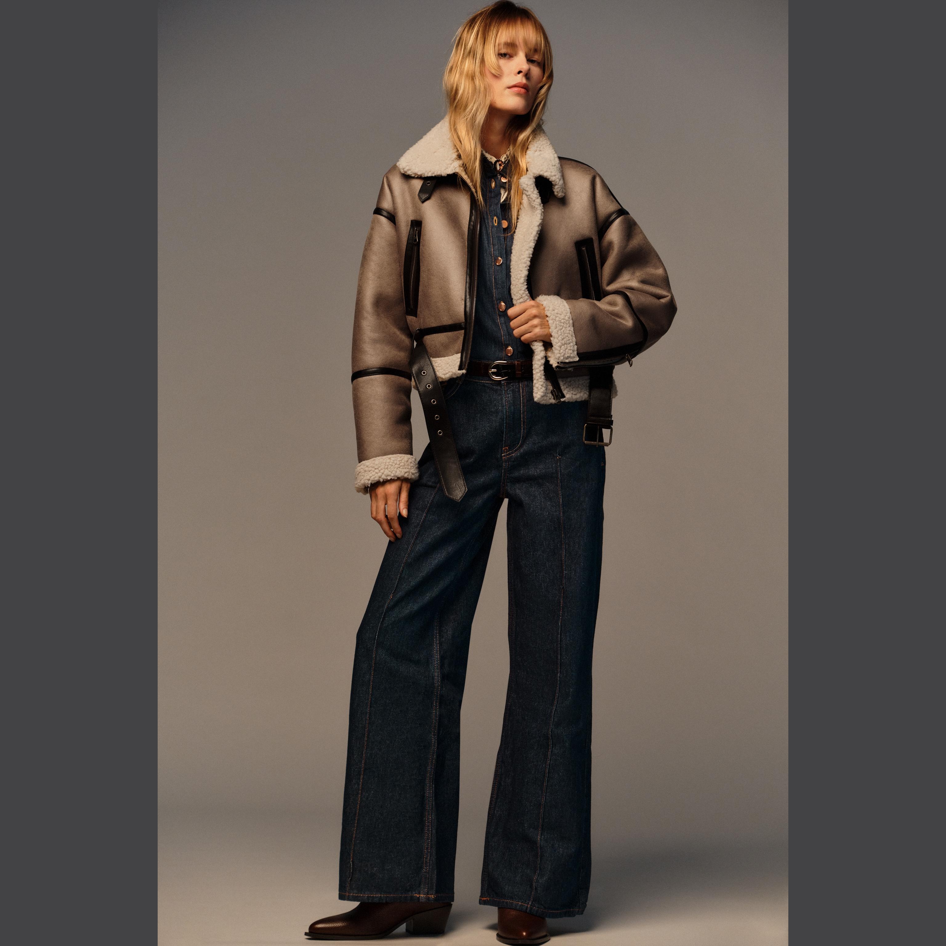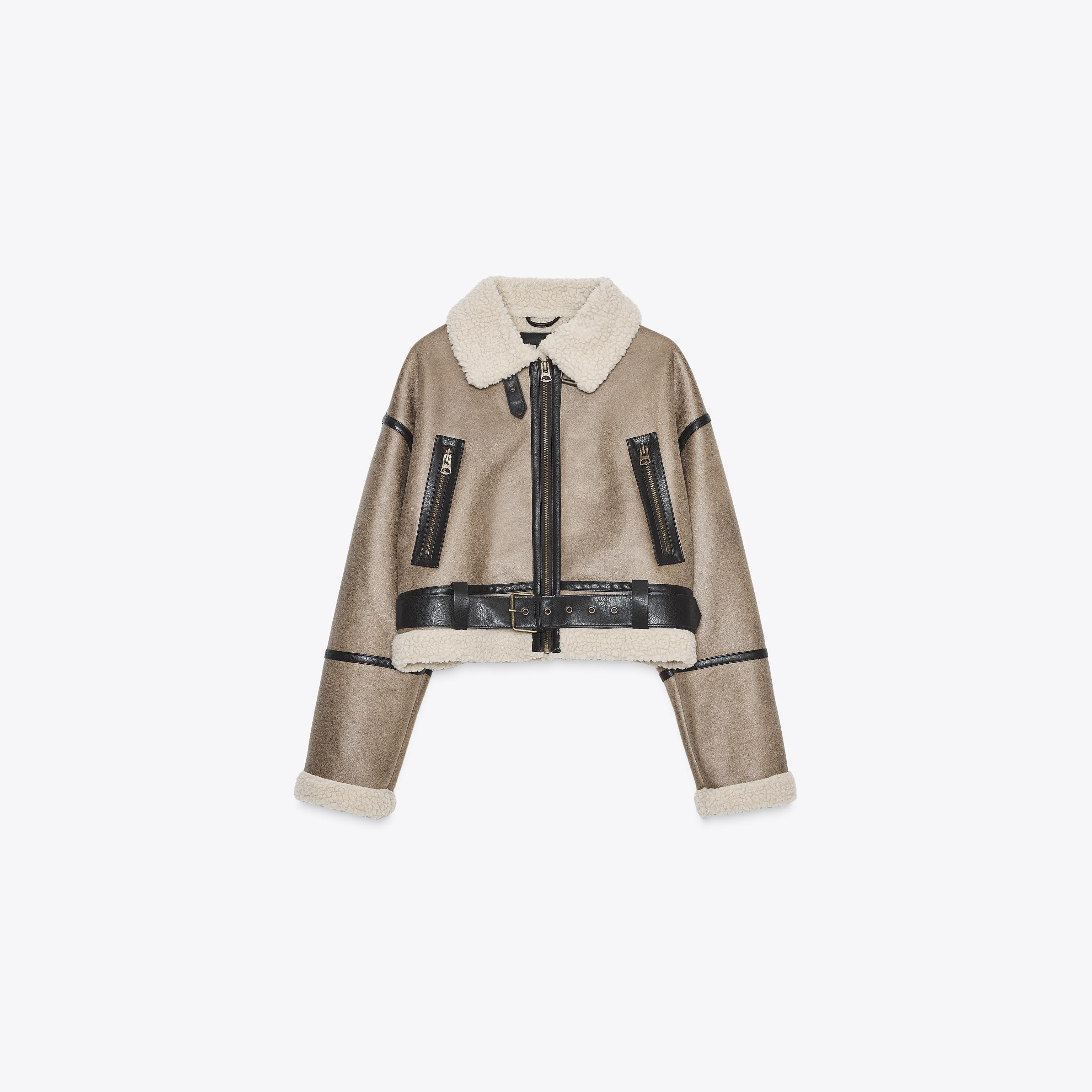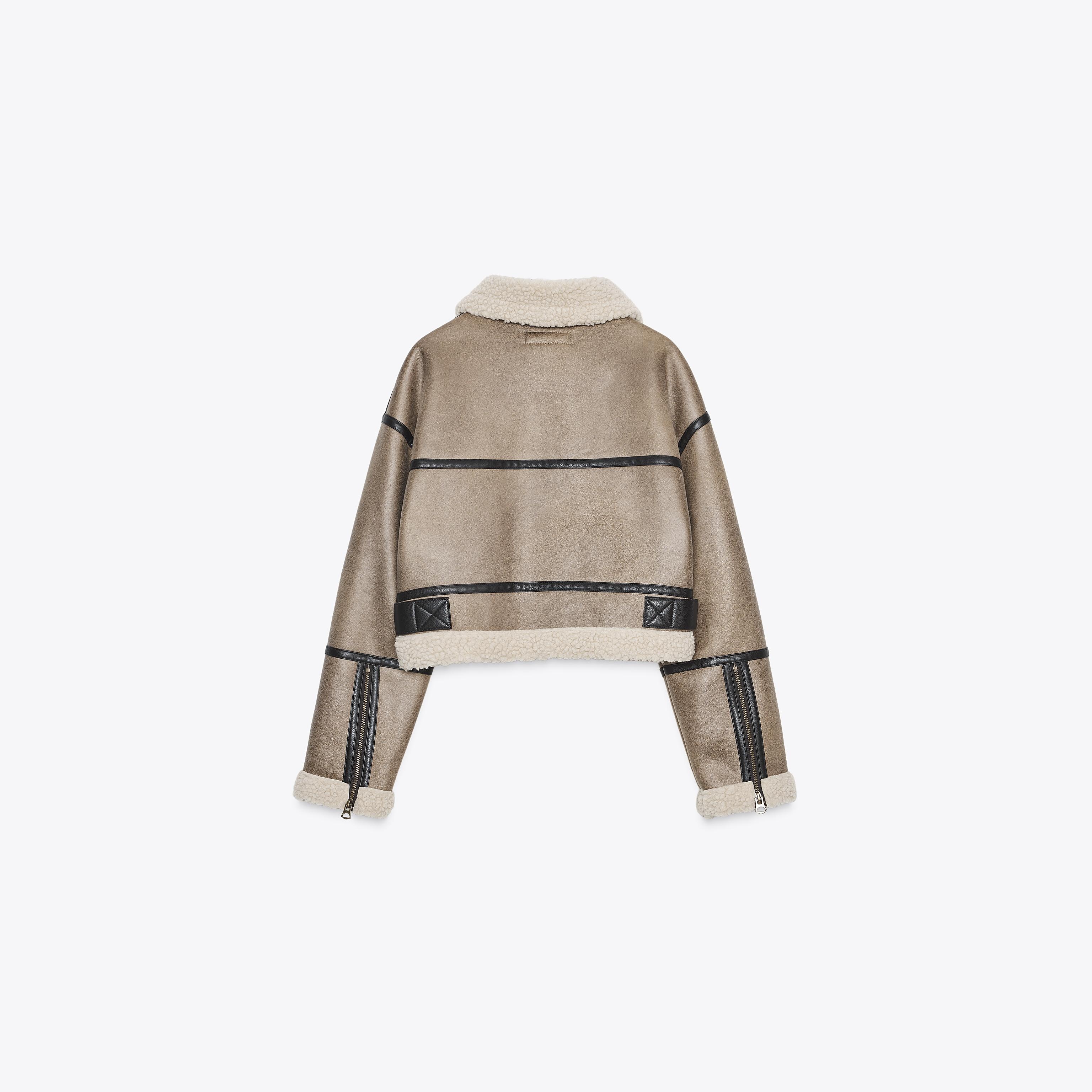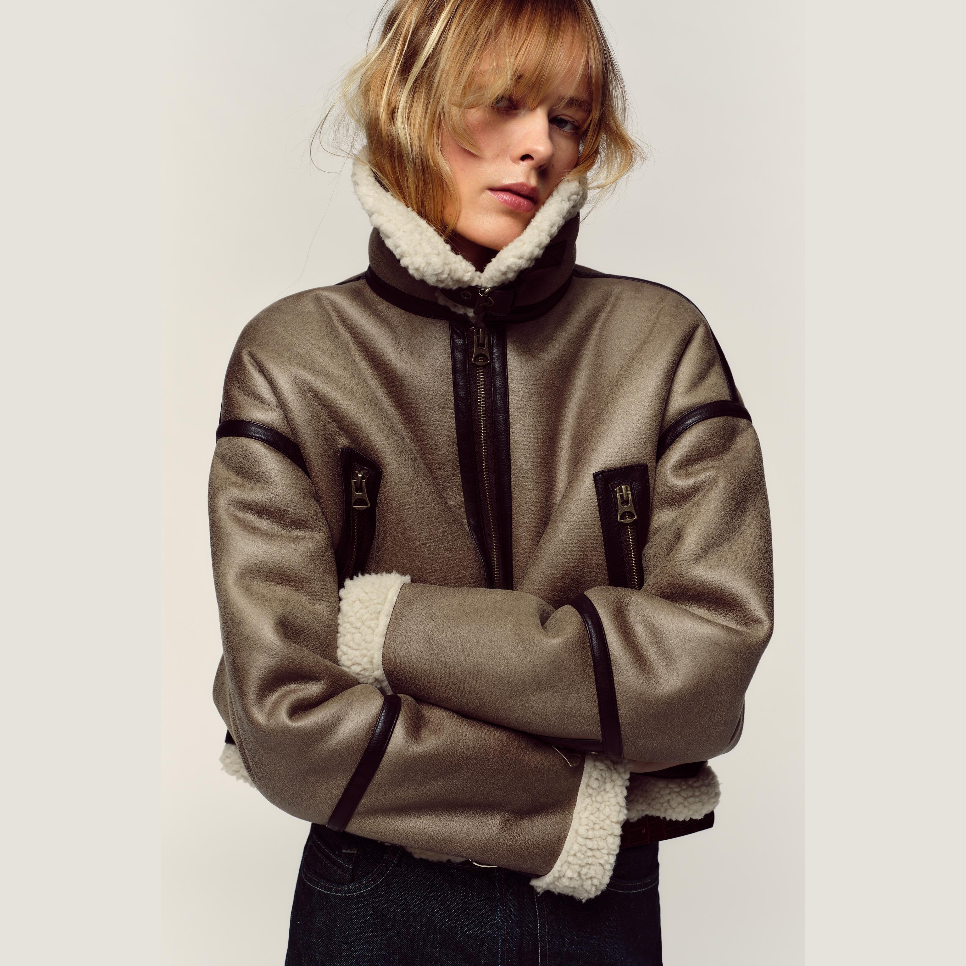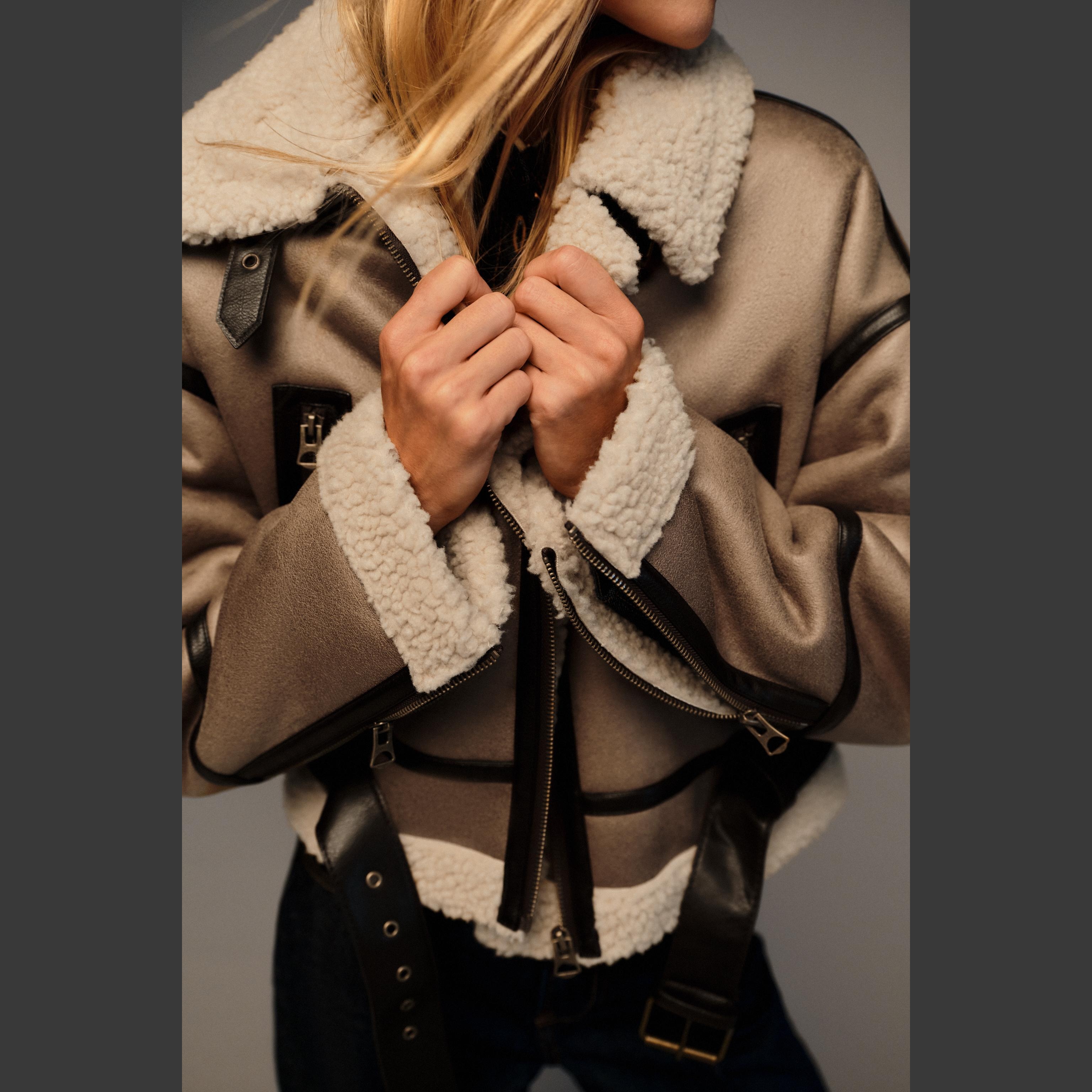 جاكيت قصير أنيق بلون موكا فاتح طبيعي، مصنوع من خامة مزدوجة الوجه تجمع بين ملمس شامواه صناعي من الخارج وفرو صناعي ناعم من الداخل. يتميز بياقة عريضة وأكمام طويلة مع تفاصيل إبزيم معدني على المعصم، مع جيوب أمامية بسحاب، وحزام سفلي بنفس الخامة لإبراز الشكل، وإغلاق أمامي بسحاب معدني. تصميم عملي وعصري مثالي للإطلالات اليومية والموسمية.