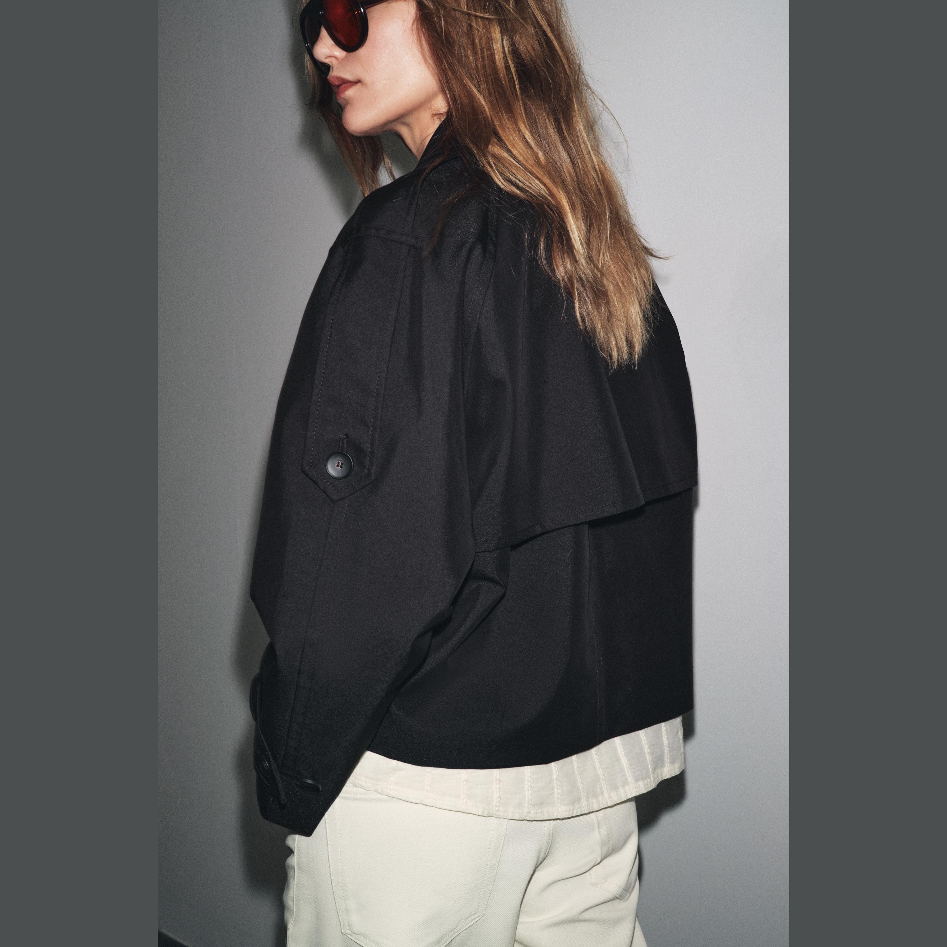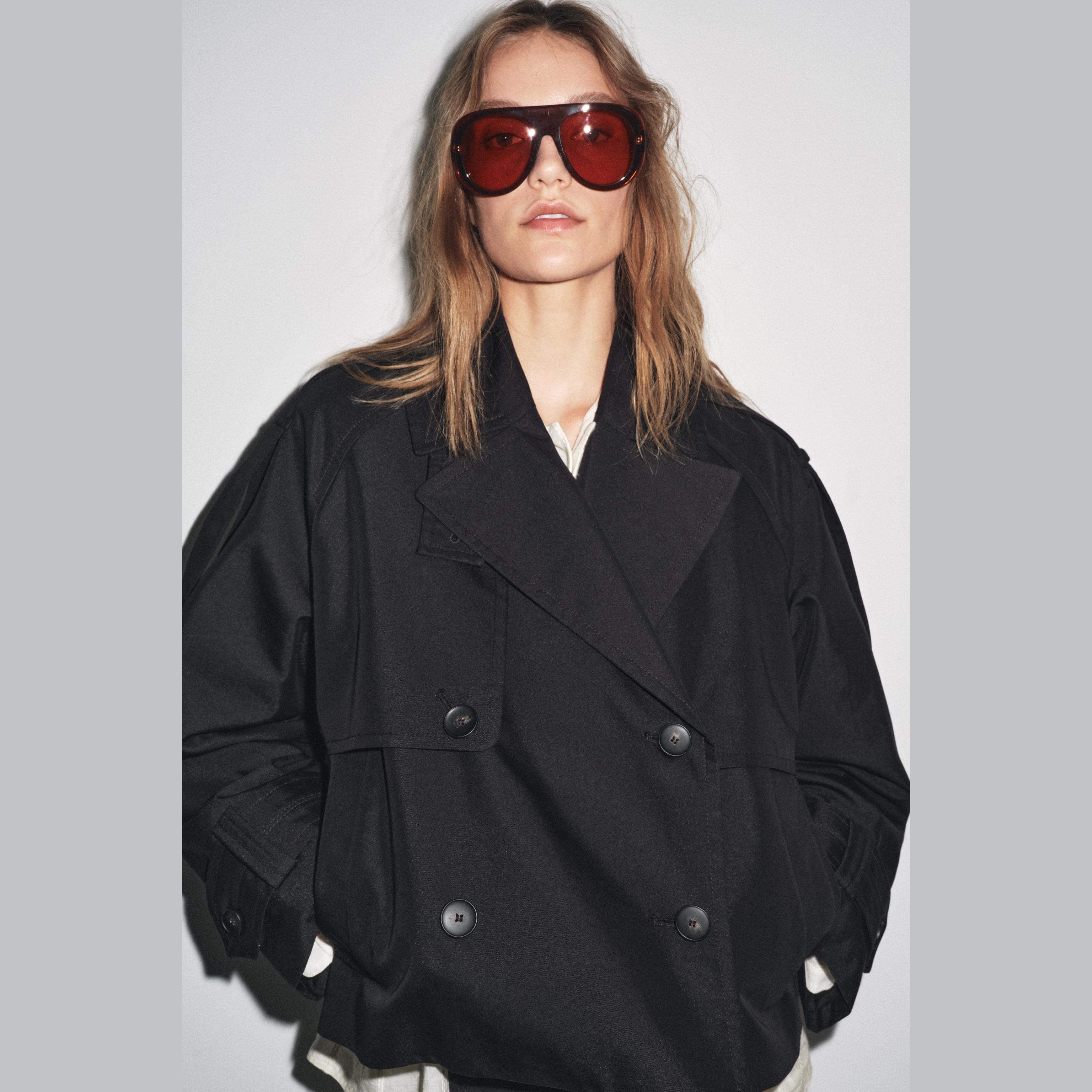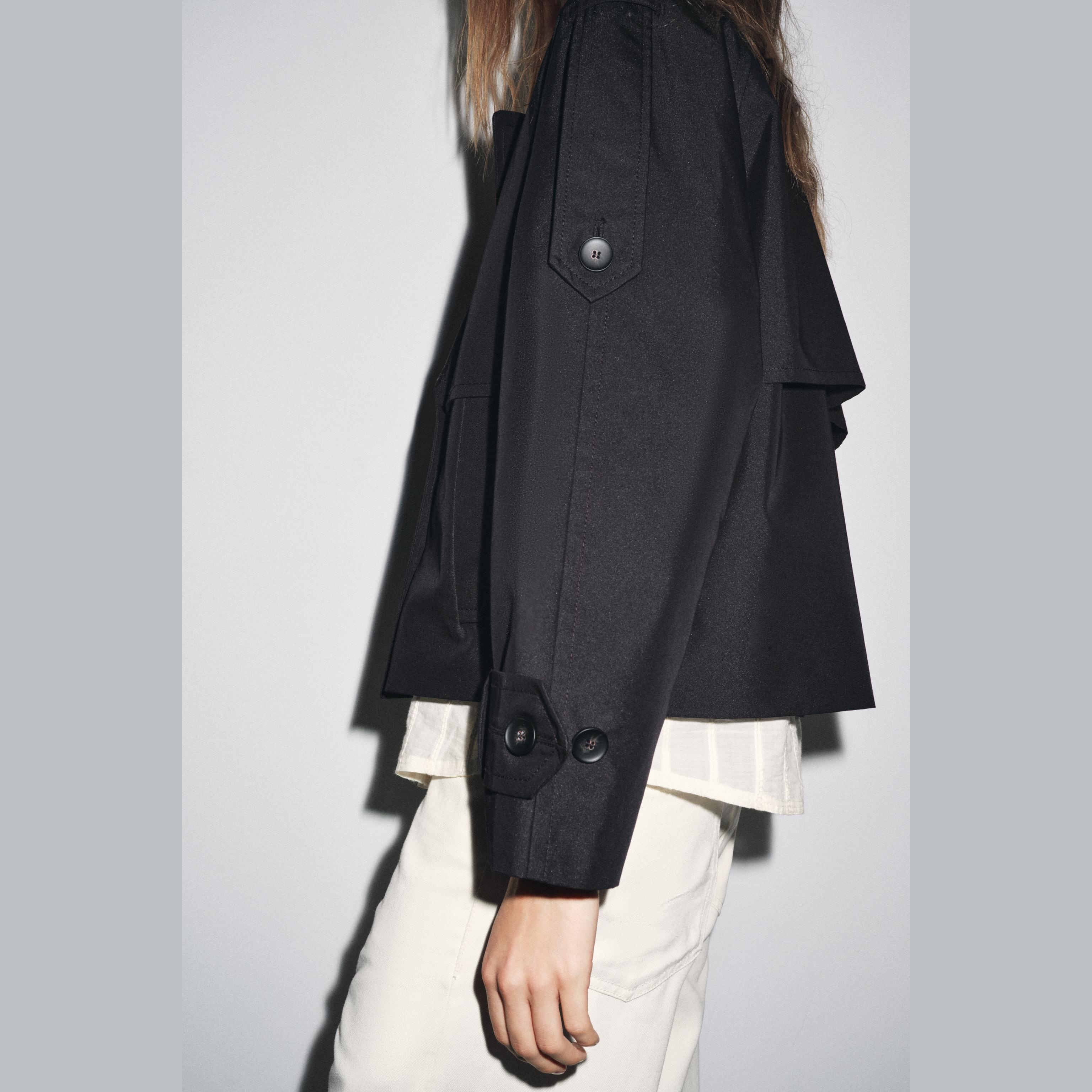 ترنش قصير أنيق بلون أسود كلاسيكي، مصنوع من خامة ممزوجة تمنح مظهرًا عمليًا مع خاصية مقاومة الماء، ليحافظ على جفافك عند التعرض لرذاذ المطر الخفيف. يتميز بياقة عريضة مع تفاصيل أزرار، وأكمام طويلة مع أزرار على الكتف والمعصم، مع جيوب أمامية عملية، وإغلاق أمامي مزدوج بأزرار. تصميم عصري مثالي للإطلالات اليومية والموسمية.