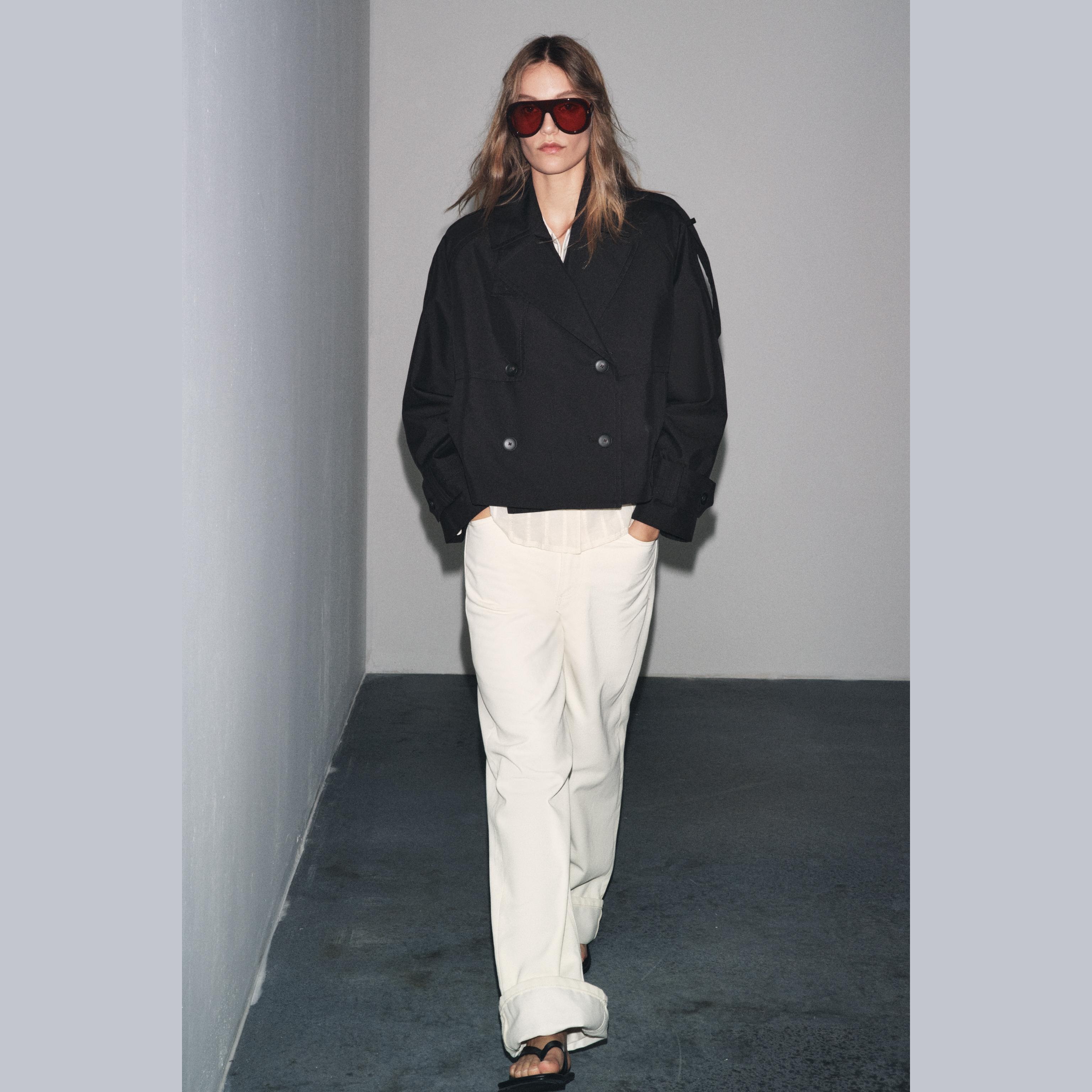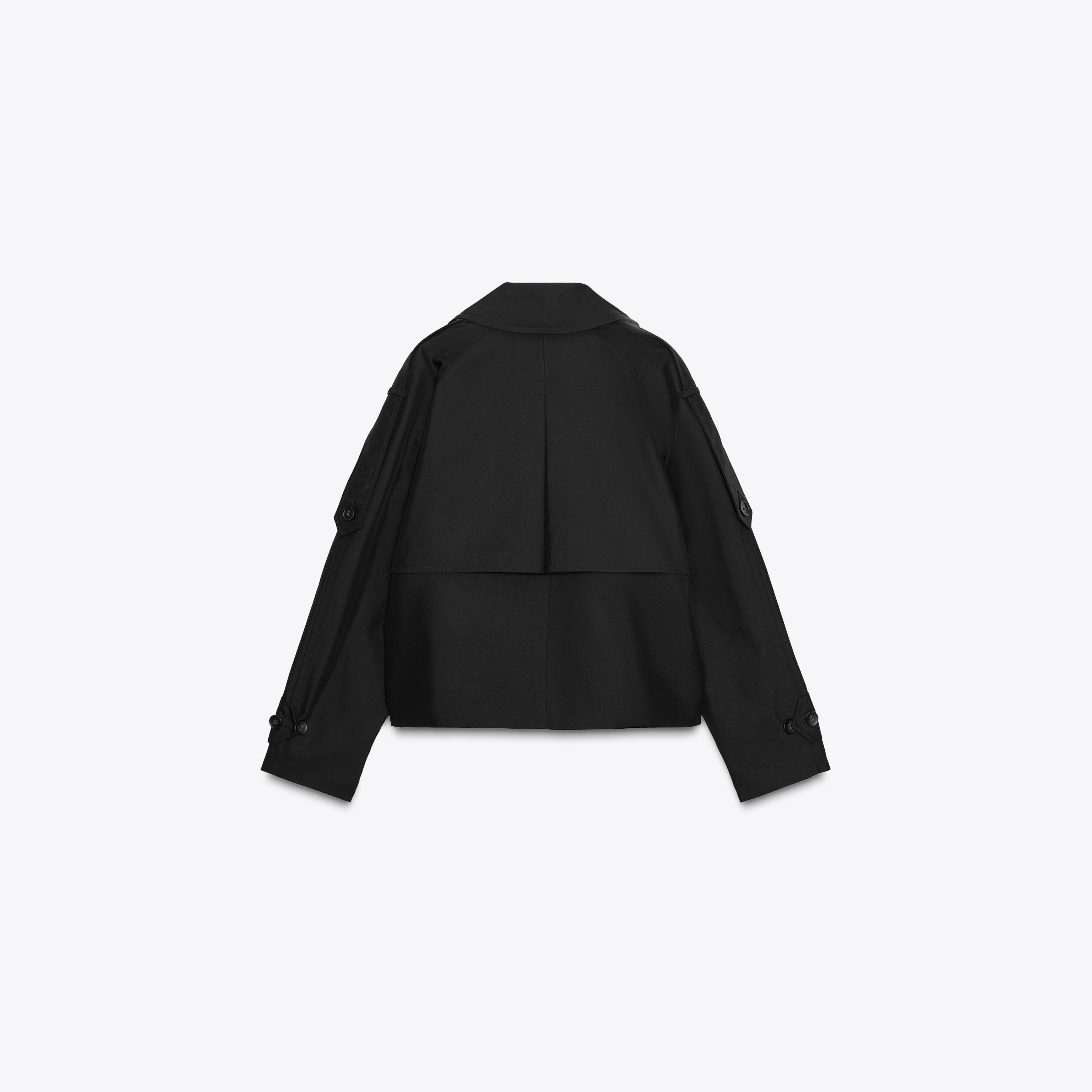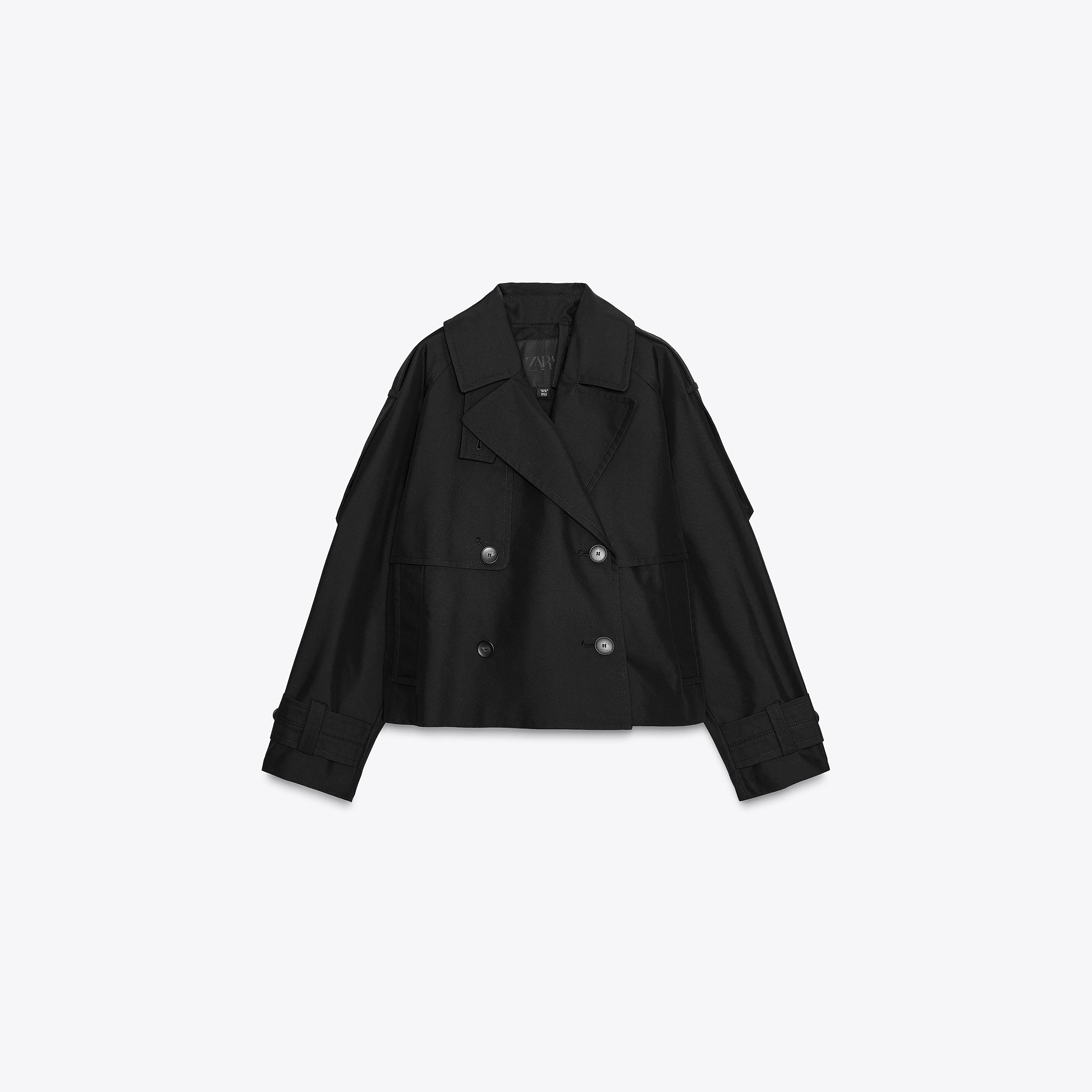 ترنش قصير أنيق بلون أسود كلاسيكي، مصنوع من خامة ممزوجة تمنح مظهرًا عمليًا مع خاصية مقاومة الماء، ليحافظ على جفافك عند التعرض لرذاذ المطر الخفيف. يتميز بياقة عريضة مع تفاصيل أزرار، وأكمام طويلة مع أزرار على الكتف والمعصم، مع جيوب أمامية عملية، وإغلاق أمامي مزدوج بأزرار. تصميم عصري مثالي للإطلالات اليومية والموسمية.