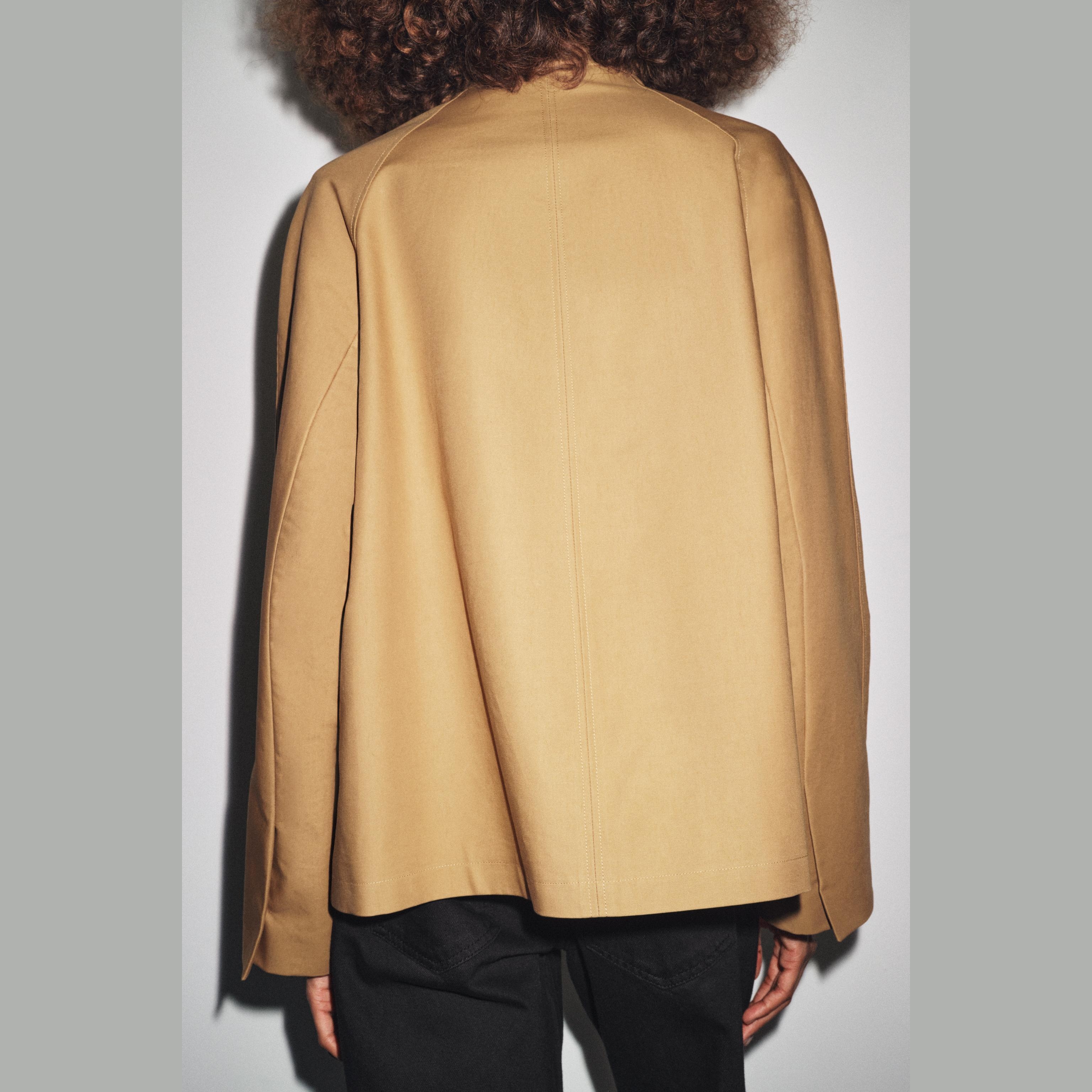 ترنش قصير أنيق بلون كاراميل طبيعي، مصنوع من خامة قطنية بالكامل تمنح مظهرًا كلاسيكيًا وراحة في الارتداء. يتميز بياقة عالية وأكمام طويلة مع حاشية واسعة، مع جيوب جانبية مخفية في الخياطة، وإغلاق أمامي بأزرار متباينة. تصميم مينيمال عصري مثالي للإطلالات اليومية والموسمية.