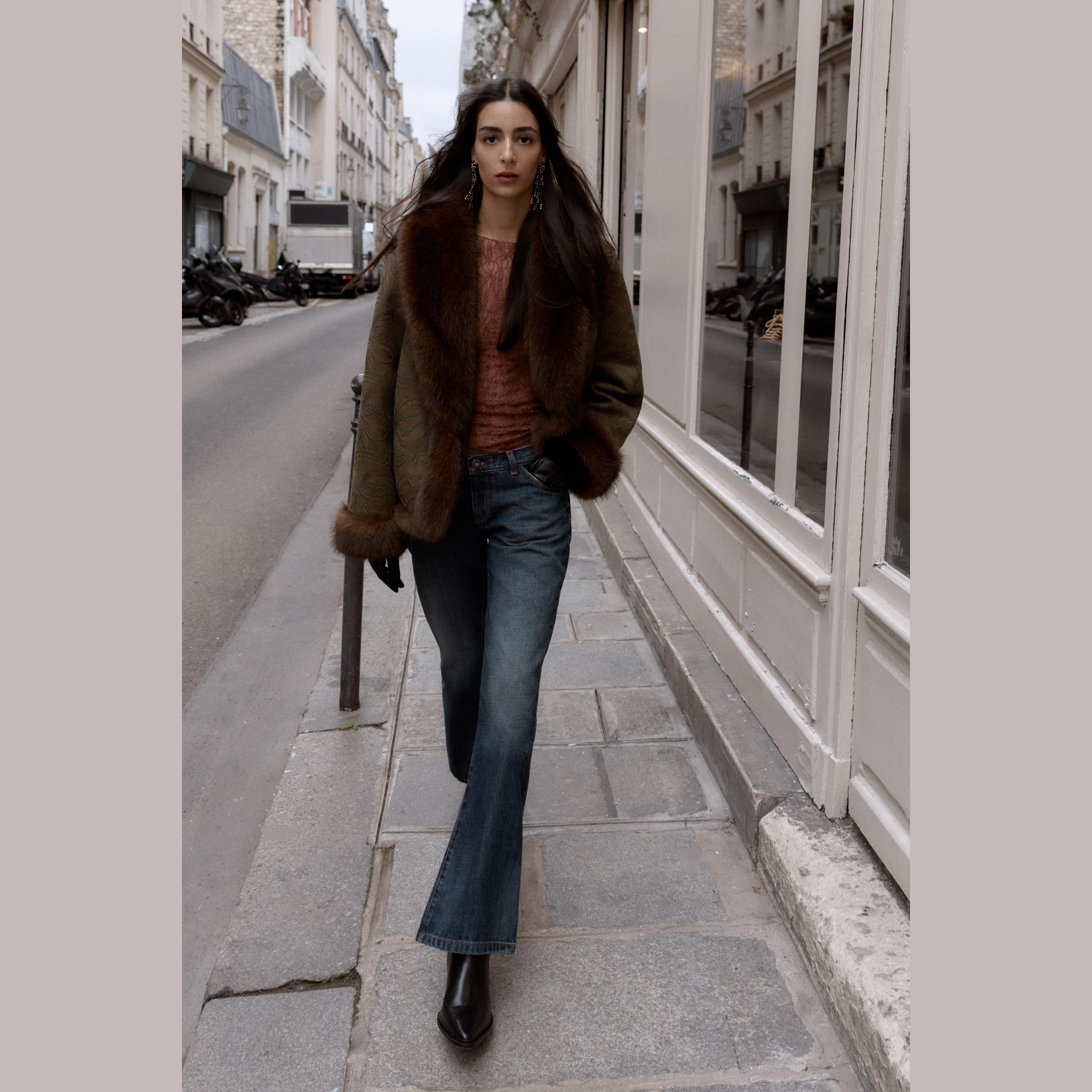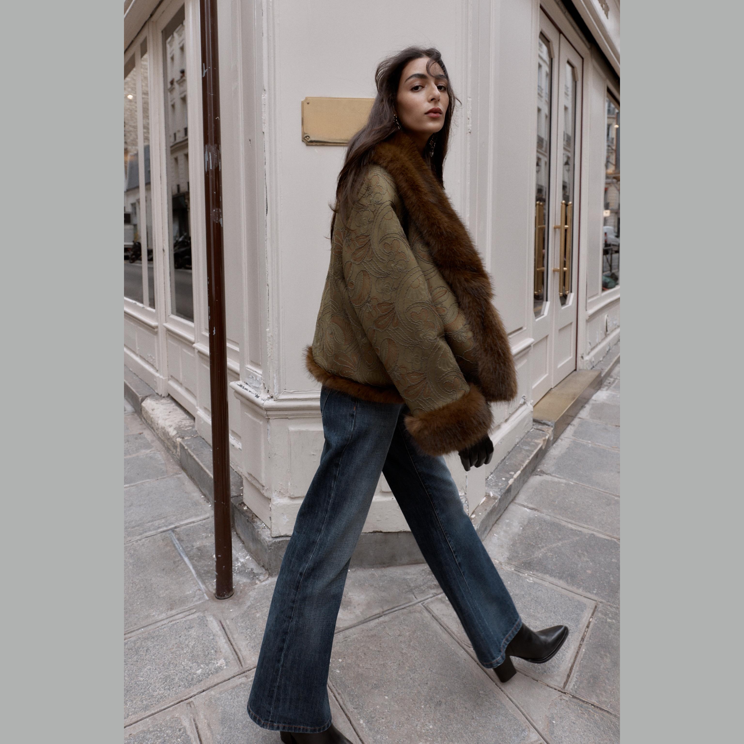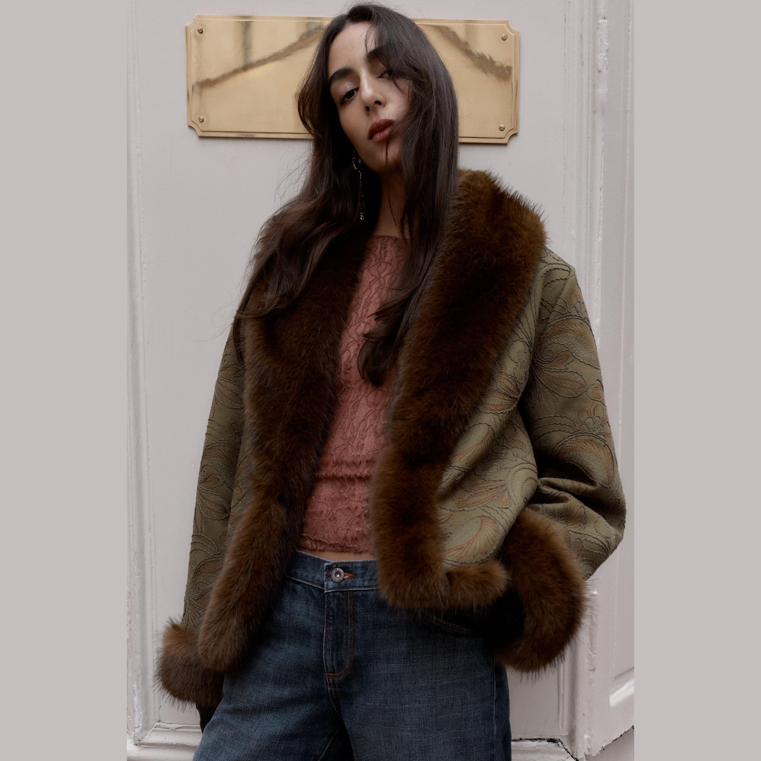 جاكيت أنيق بلون كاكي داكن طبيعي، مصنوع من خامة مزدوجة الوجه مع بطانة فرو صناعي ناعم من الداخل، يمنح دفئًا وراحة إضافية. يتميز بتطريز خارجي أنيق، وياقة عريضة، وأكمام طويلة، مع جيوب أمامية عملية، وإغلاق أمامي بخطافات معدنية مخفية. تصميم عملي وعصري مثالي للإطلالات اليومية والموسمية.