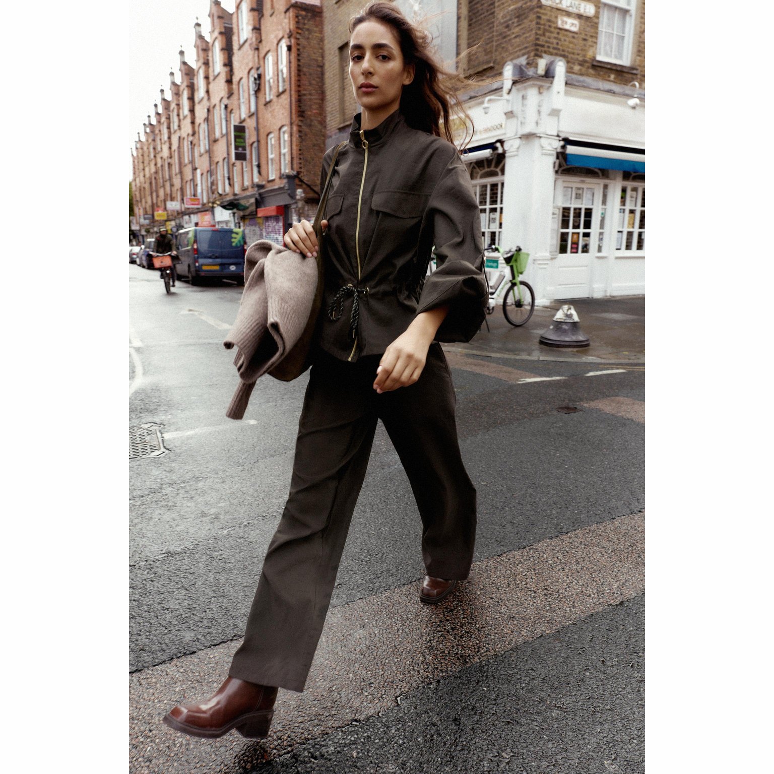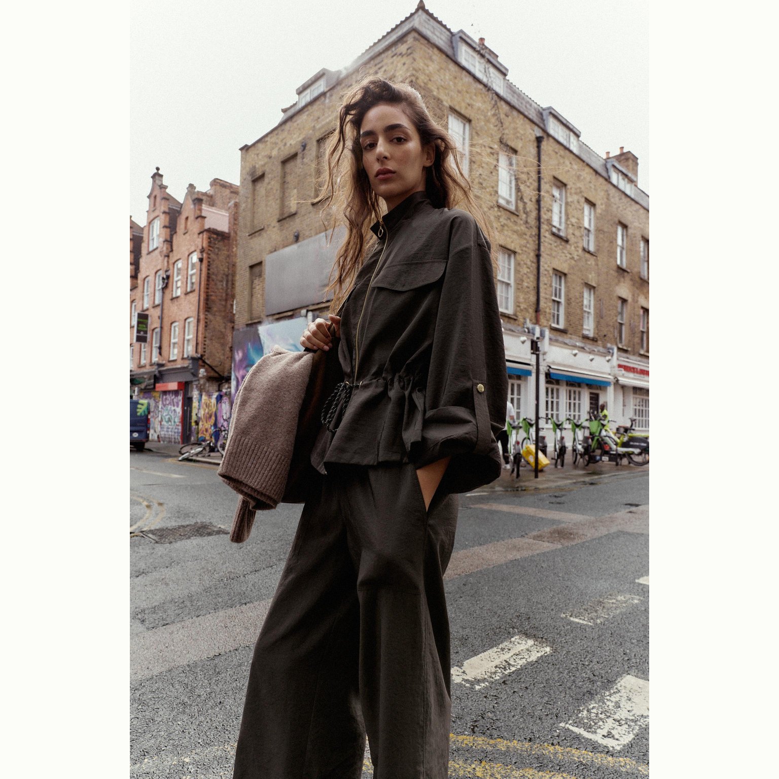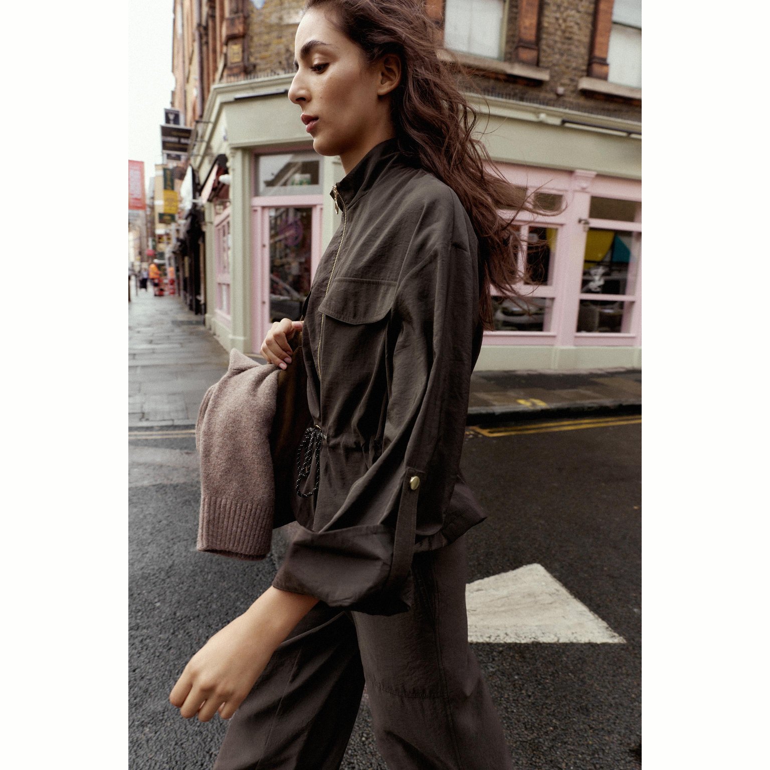 - التصميم: جاكيت سفاري بخيوط شد (Safari Jacket with Drawstring)