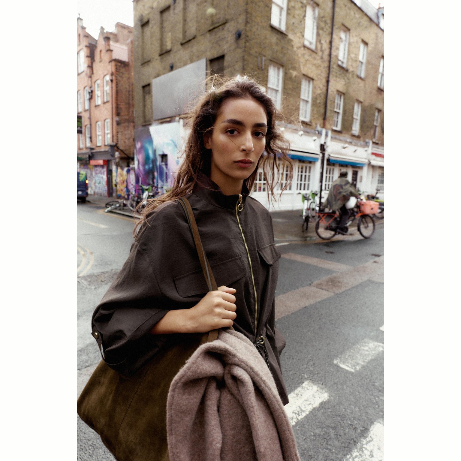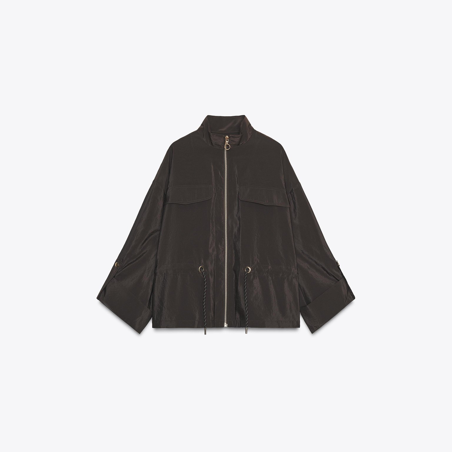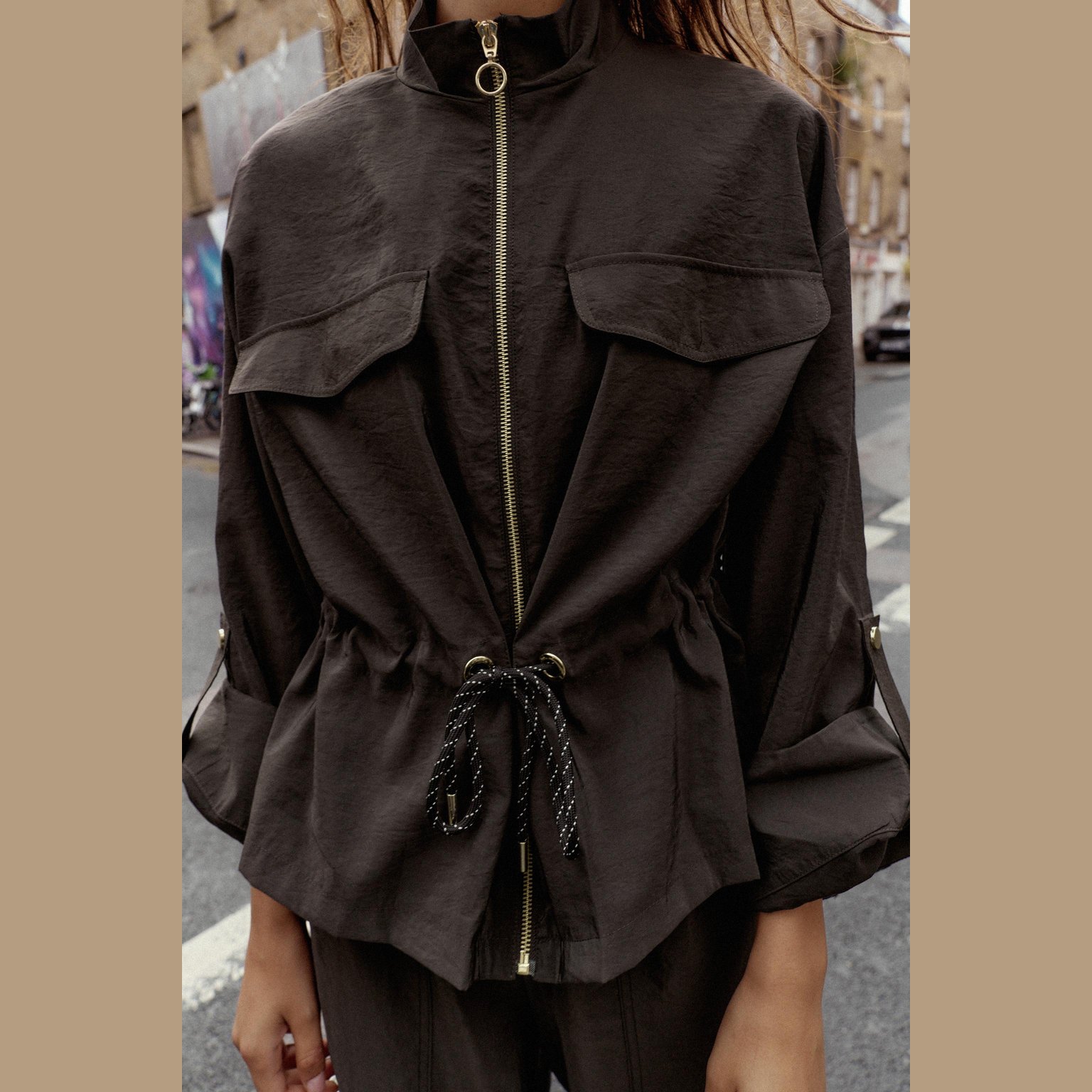 جاكيت سفاري أنيق بلون بني داكن طبيعي، مصنوع من خامة بوليستر تمنح مظهرًا عمليًا وخفيفًا، مع تصميم عصري يناسب الإطلالات اليومية. يتميز بياقة عالية وأكمام طويلة منتهية بأزرار مع لسان تثبيت، مع خيوط شد عند الخصر لإبراز الشكل، وإغلاق أمامي بسحاب معدني. تصميم عملي مثالي للمواسم الانتقالية.