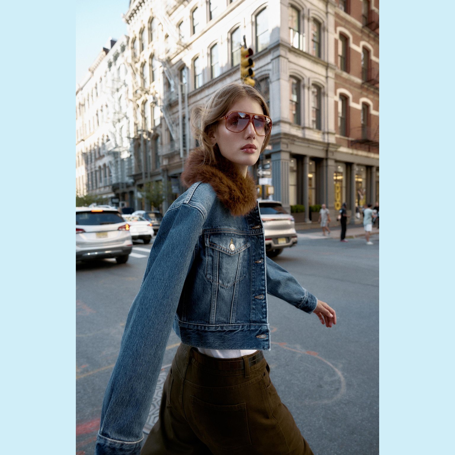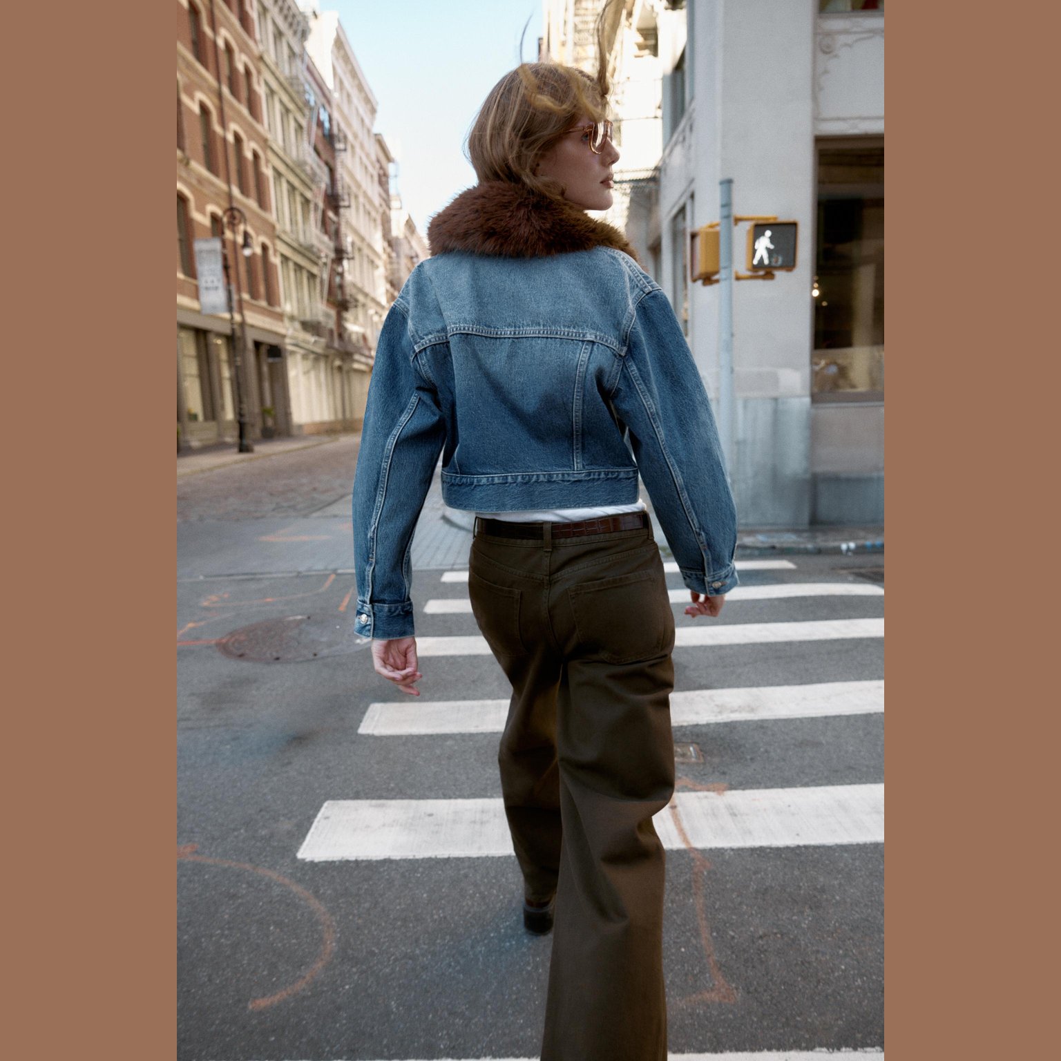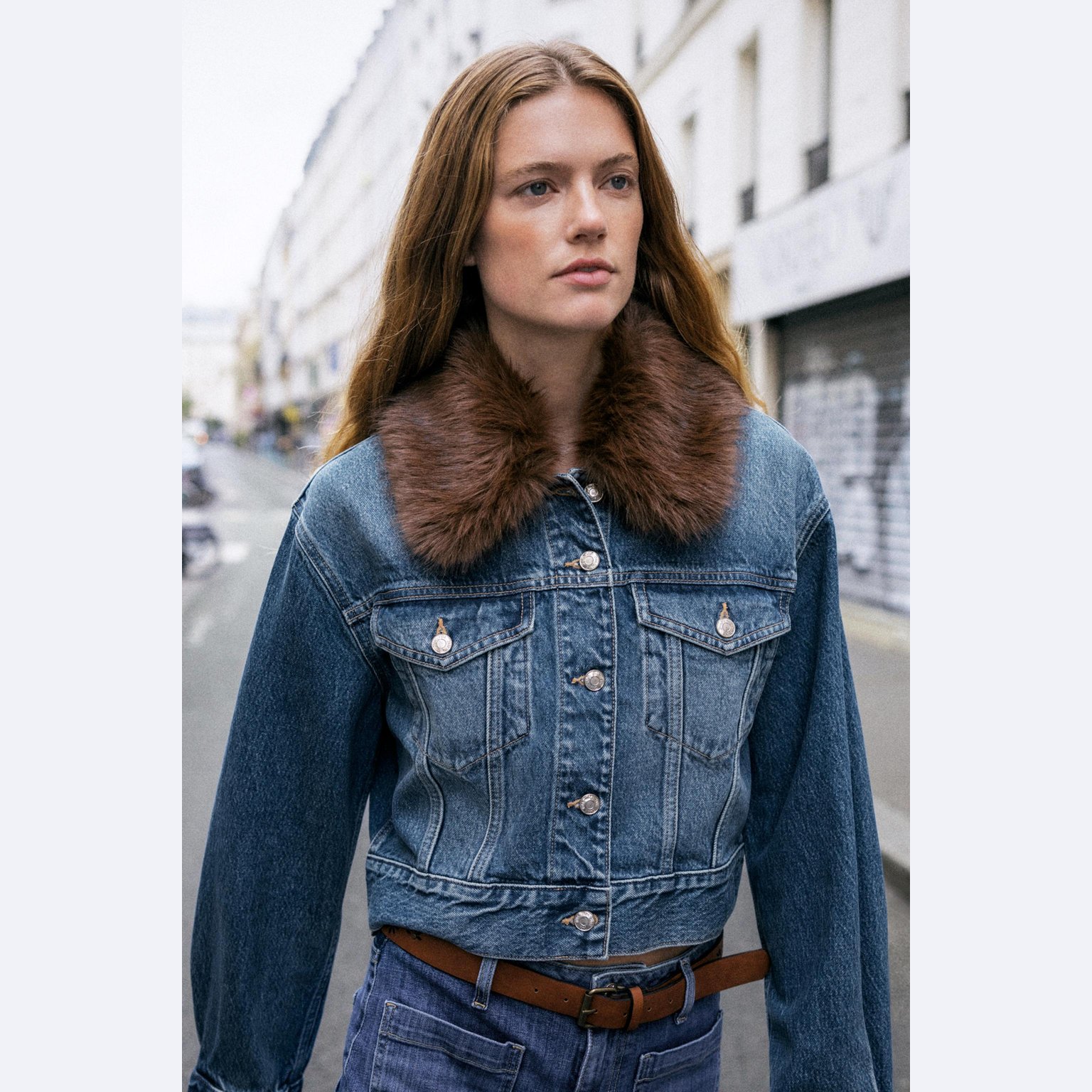 - التصميم: جاكيت دنيم قصير بياقة فرو صناعي (Z1975 Faux Fur Collar Short Denim Jacket)