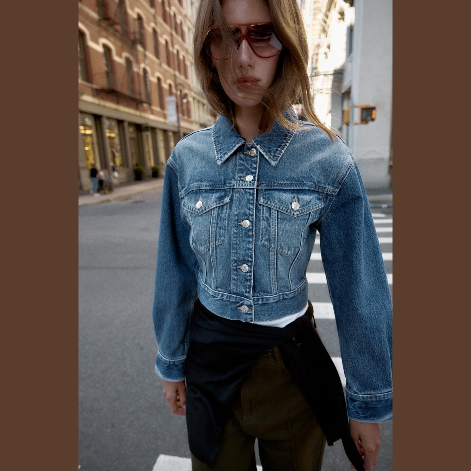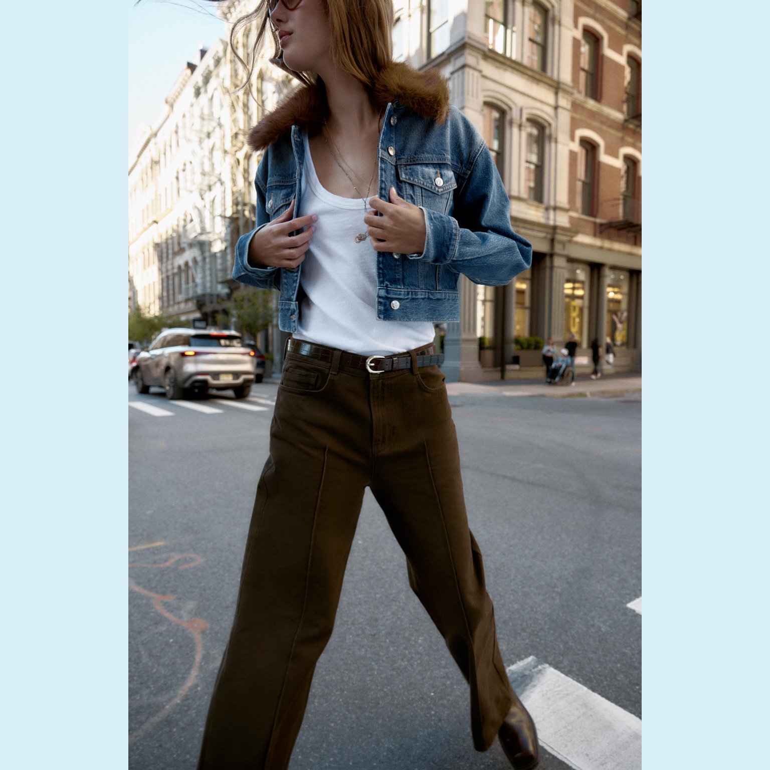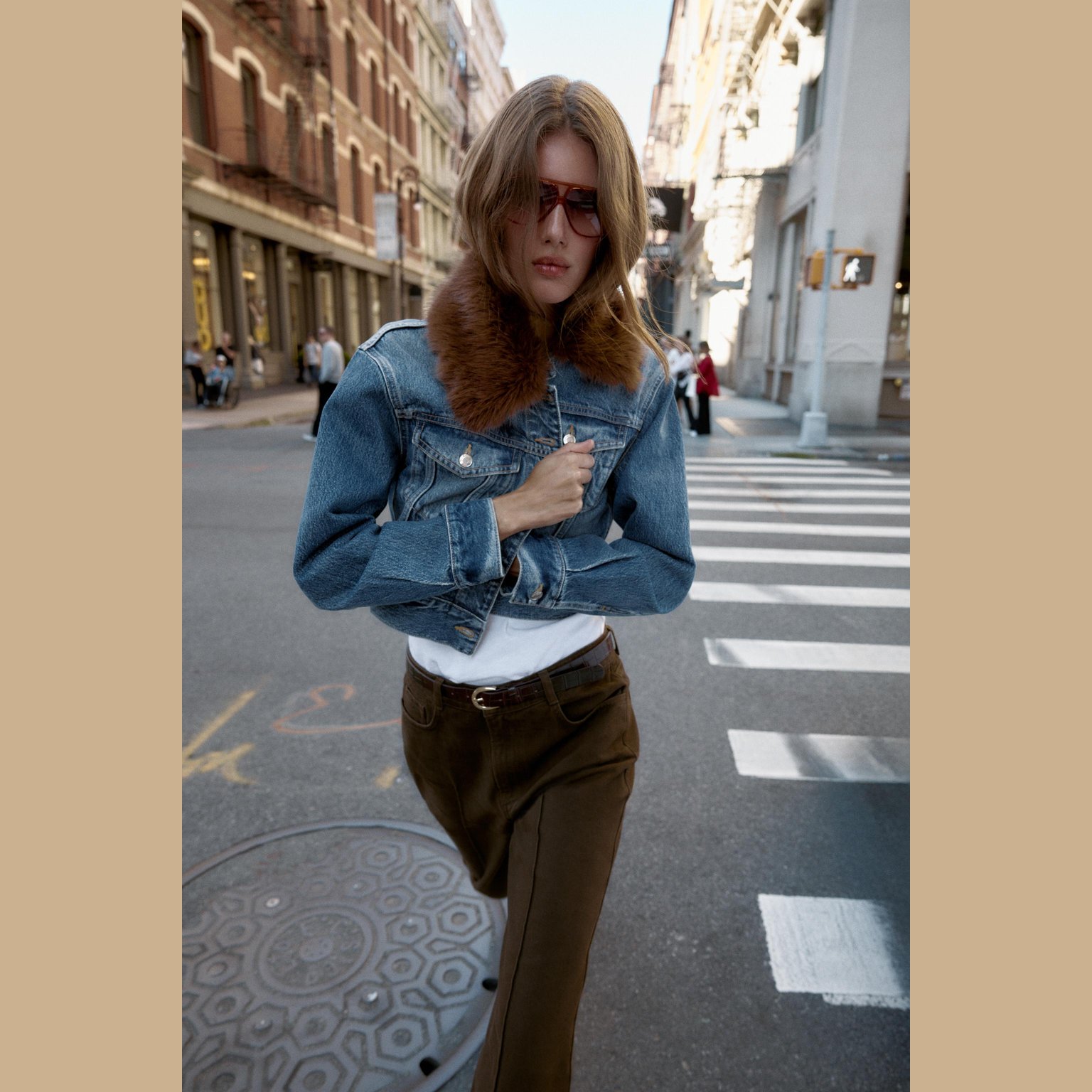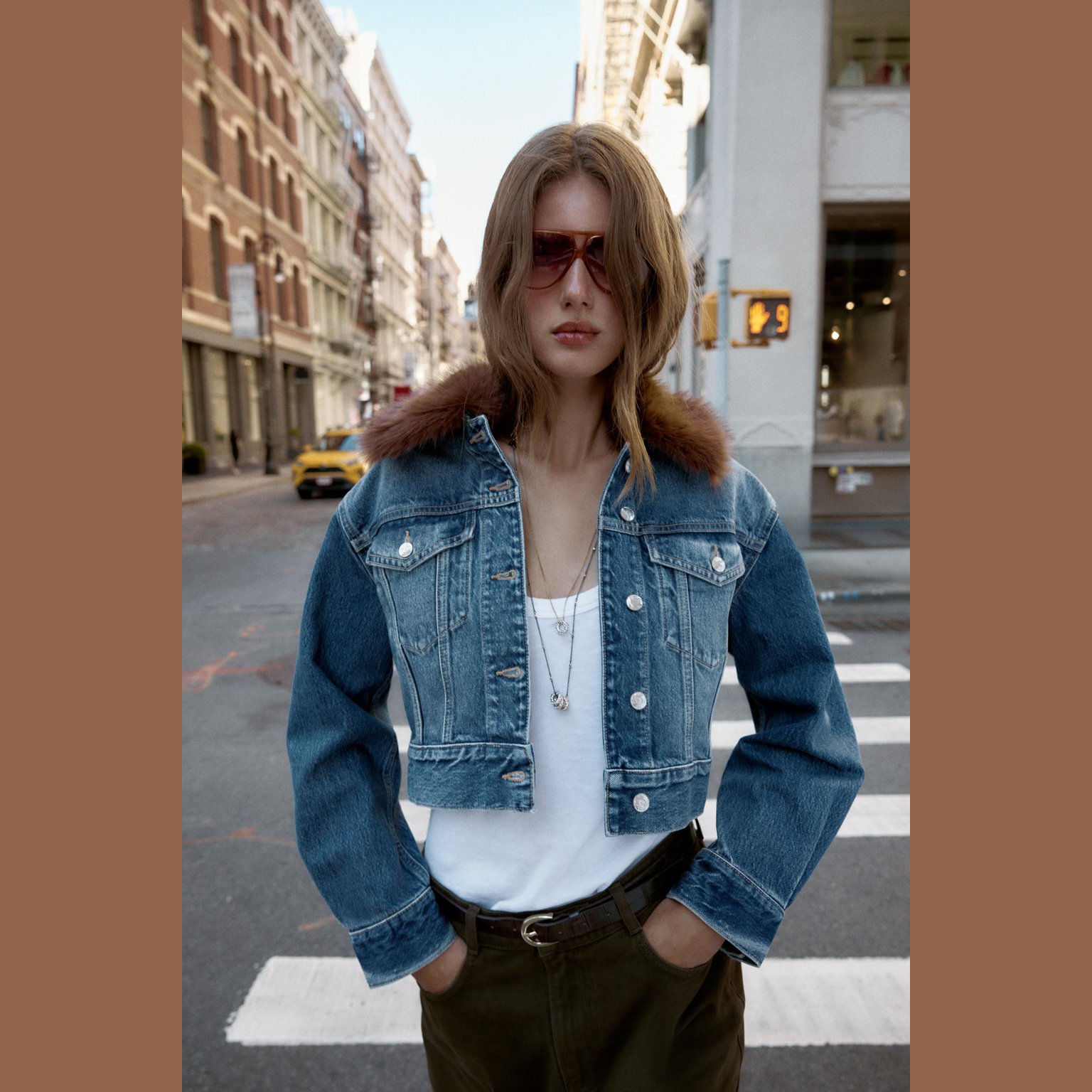 - التصميم: جاكيت دنيم قصير بياقة فرو صناعي (Z1975 Faux Fur Collar Short Denim Jacket)
