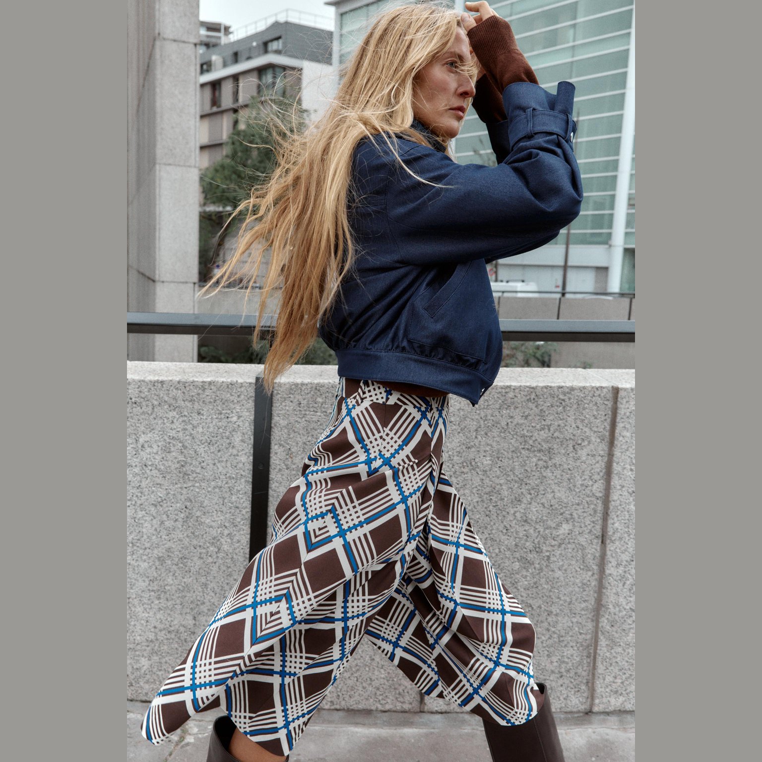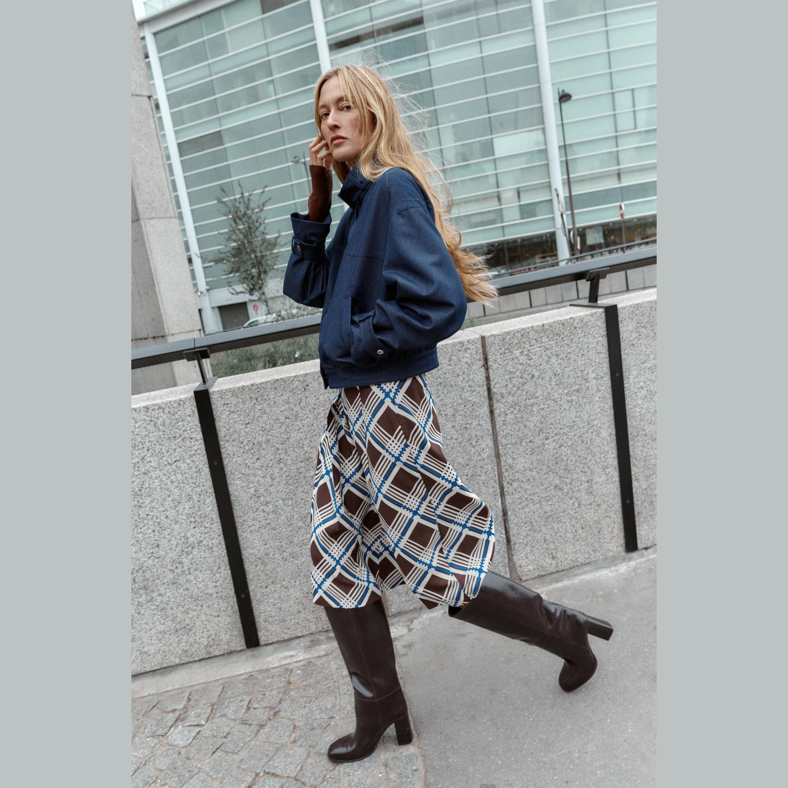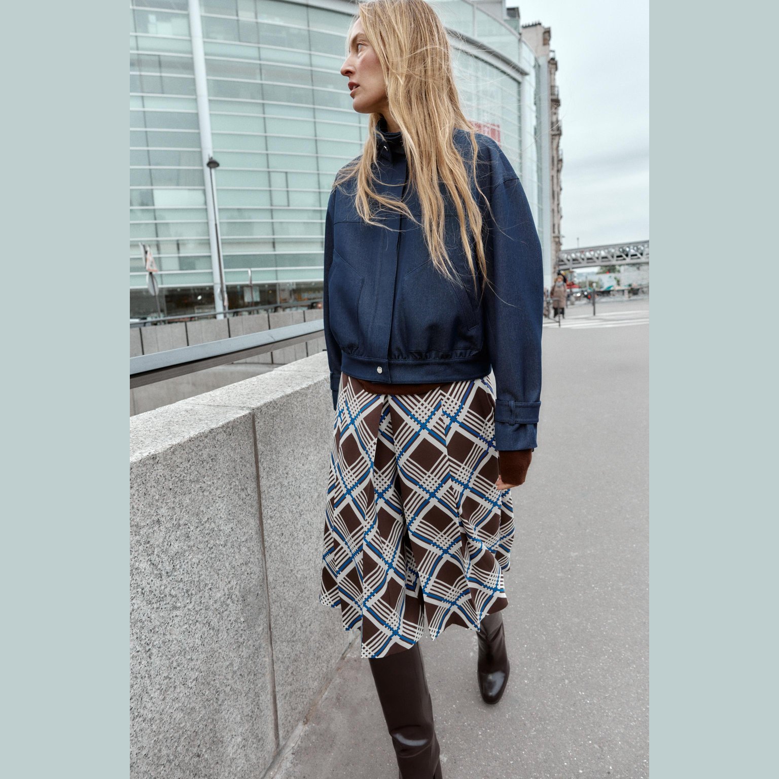 - التصميم: جاكيت بومبر بياقة عالية (High-Neck Bomber Jacket)