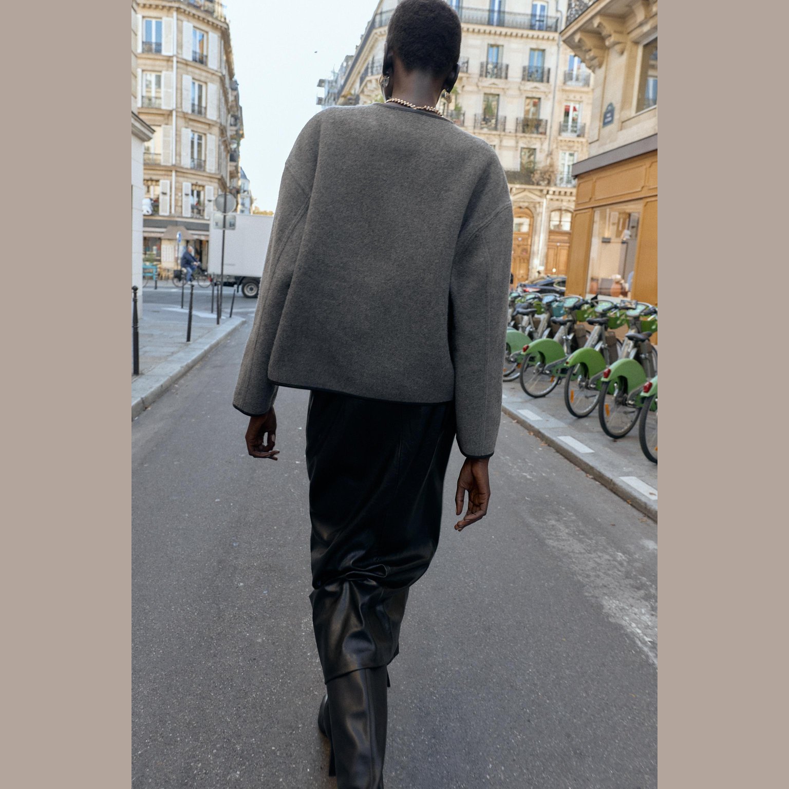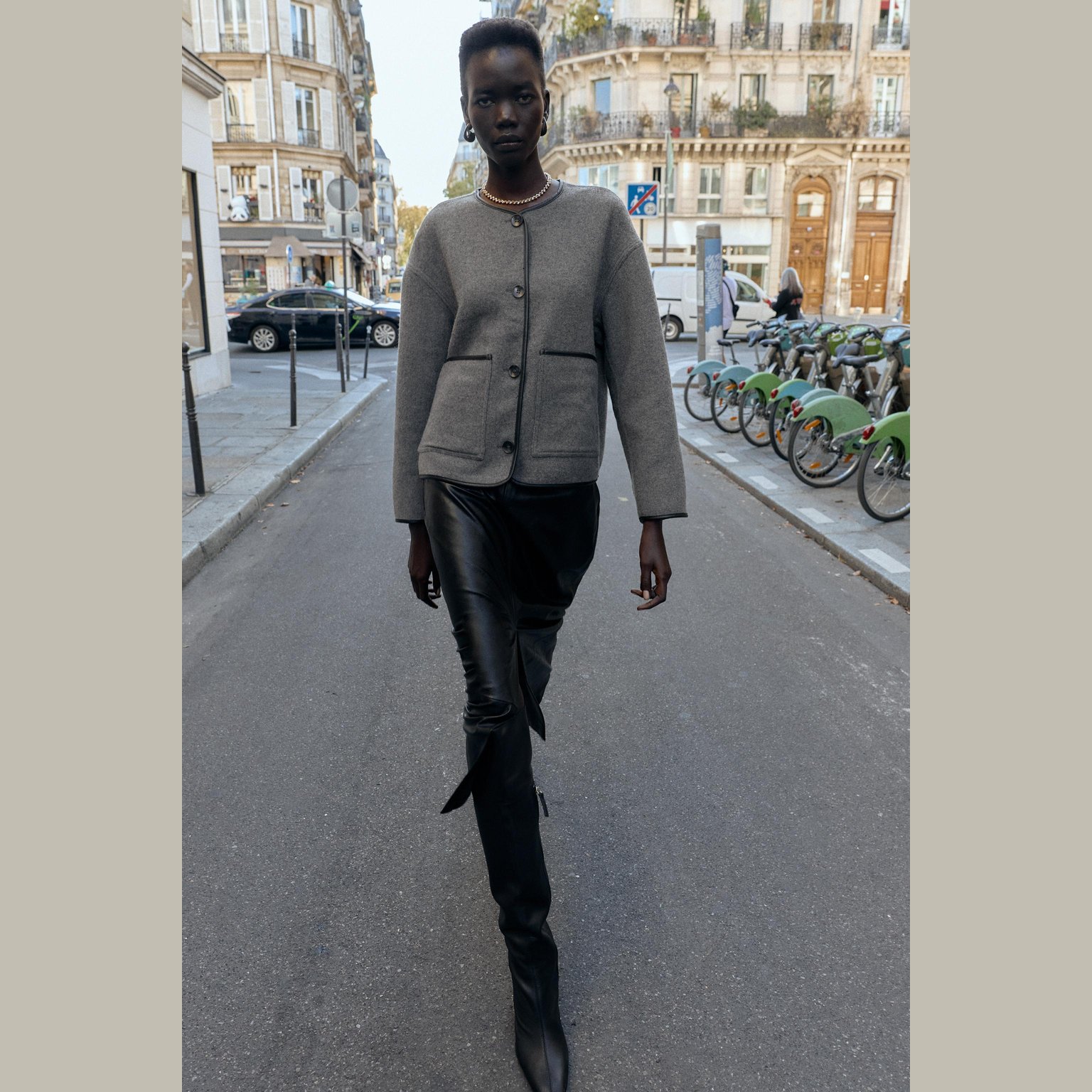 جاكيت أنيق بلون رمادي طبيعي، بتصميم قابل للعكس يمنحك مرونة في الإطلالة. مصنوع من خامة ممزوجة تمنح مظهرًا عصريًا وملمسًا عمليًا، مع تفاصيل جلد صناعي تضيف لمسة فاخرة. يتميز برقبة مستديرة وأكمام طويلة، مع جيوب أمامية عملية، وإغلاق أمامي بأزرار معدنية. تصميم عملي وعصري مثالي للإطلالات اليومية والموسمية.