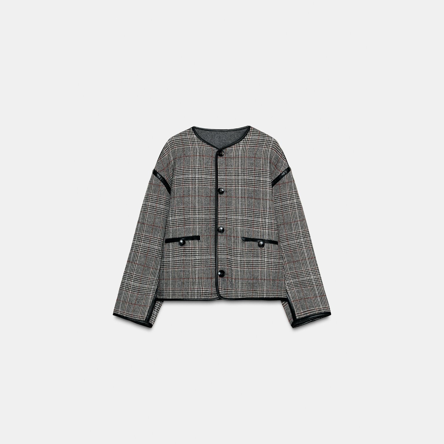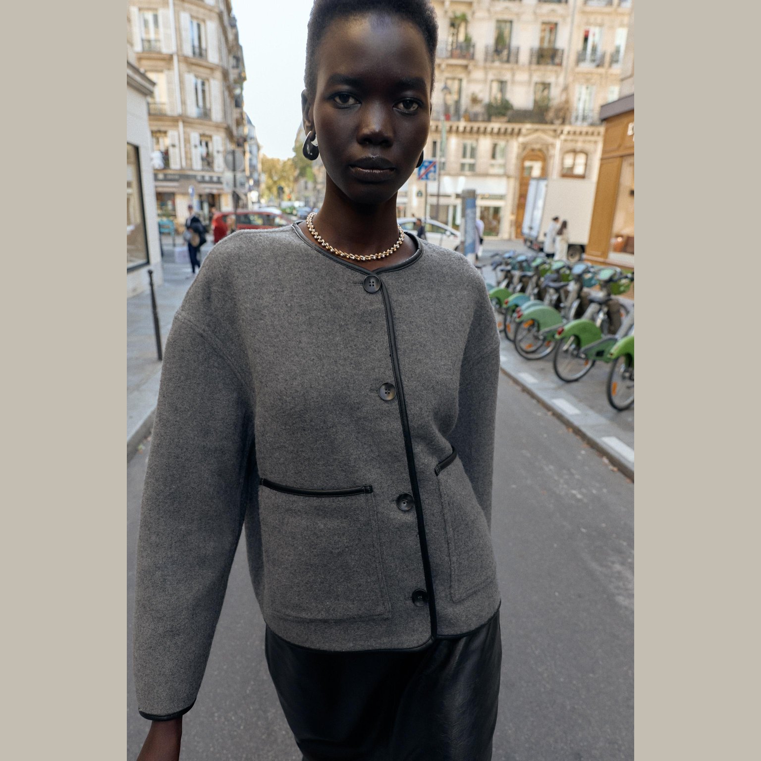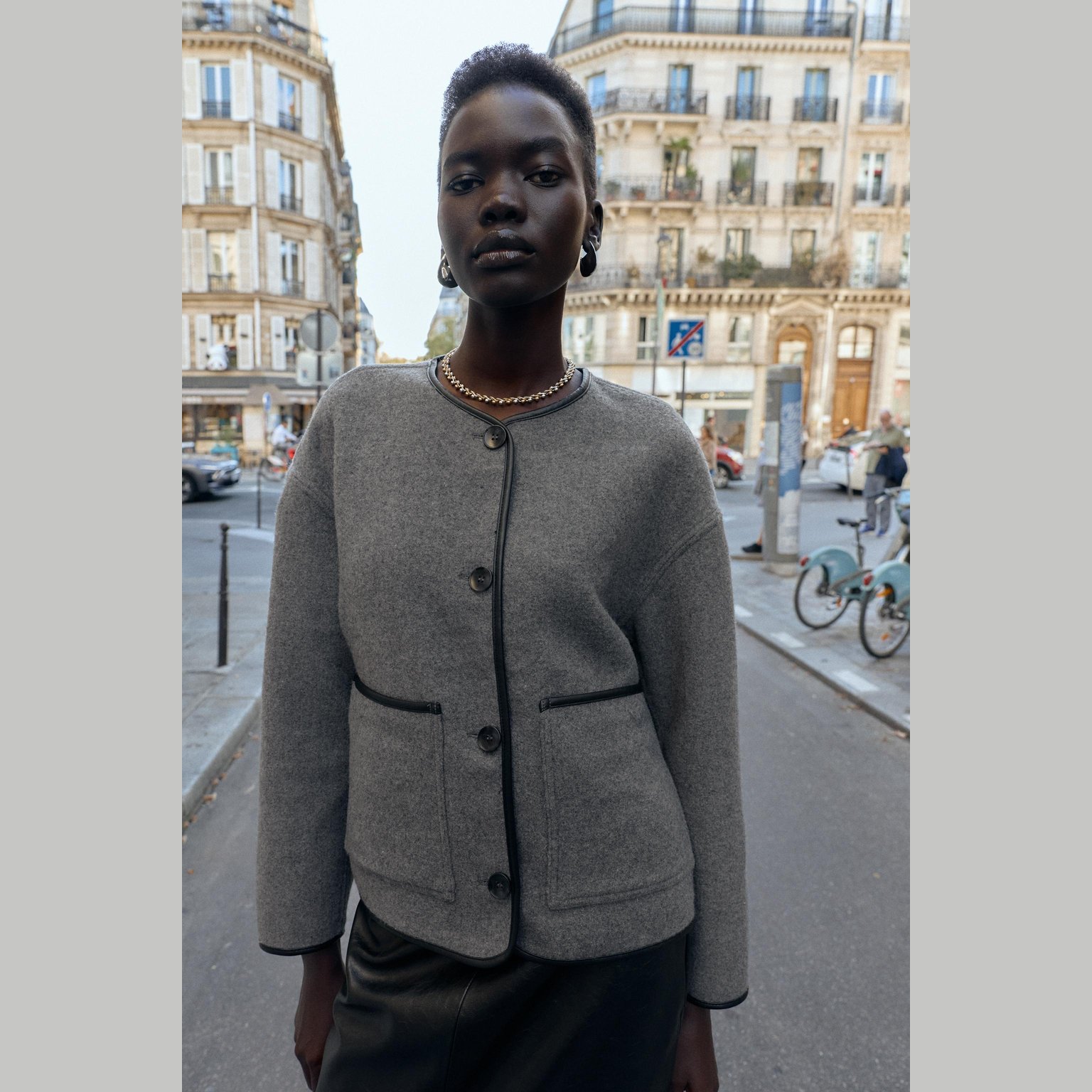 جاكيت قابل للعكس بتفاصيل جلد صناعي – لون طبيعي (رمادي) – Grey (Reversible Jacket with Faux Leather Trims)