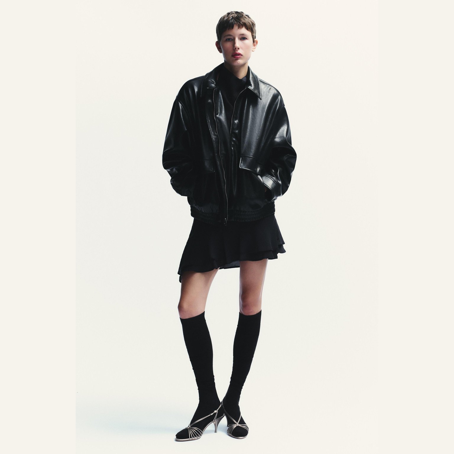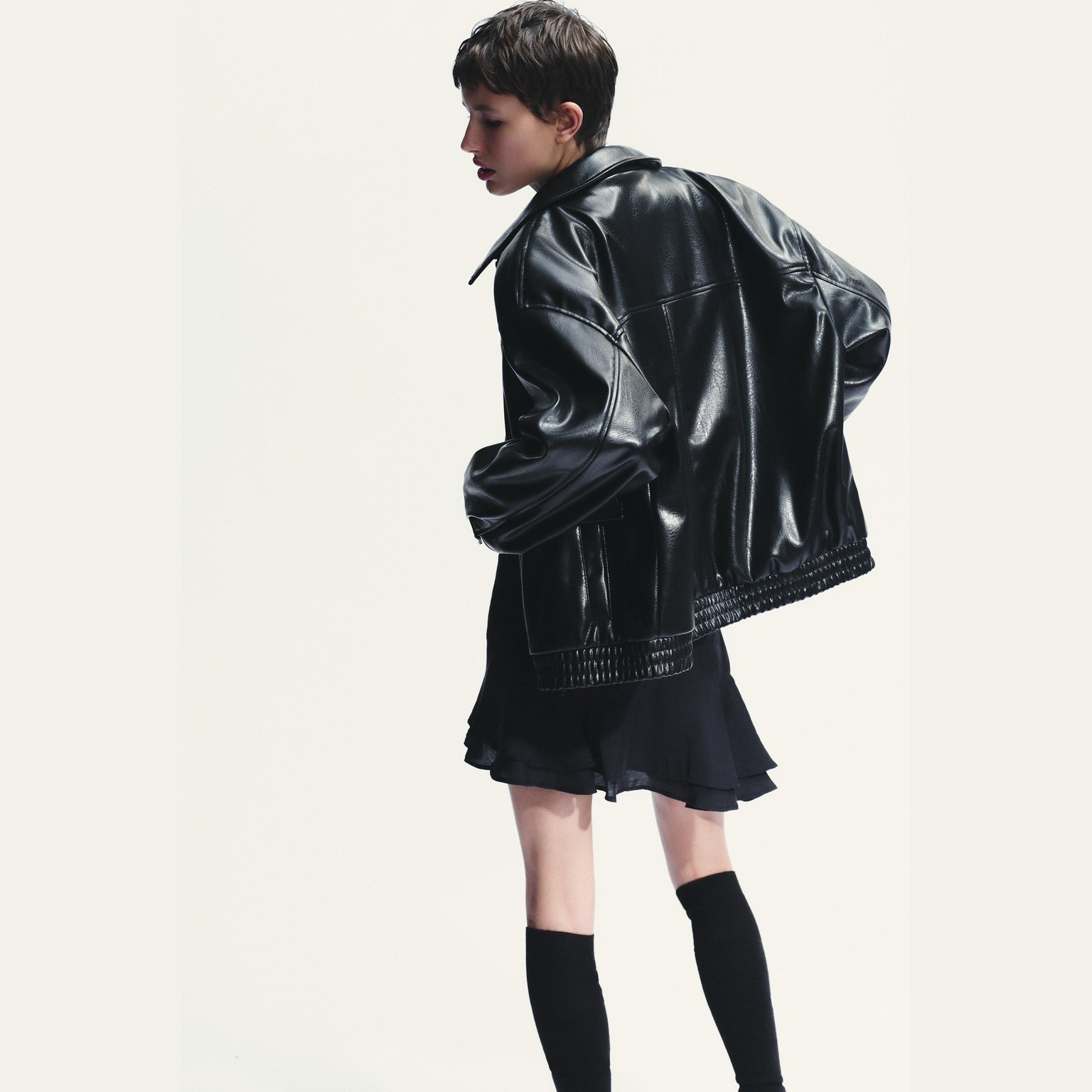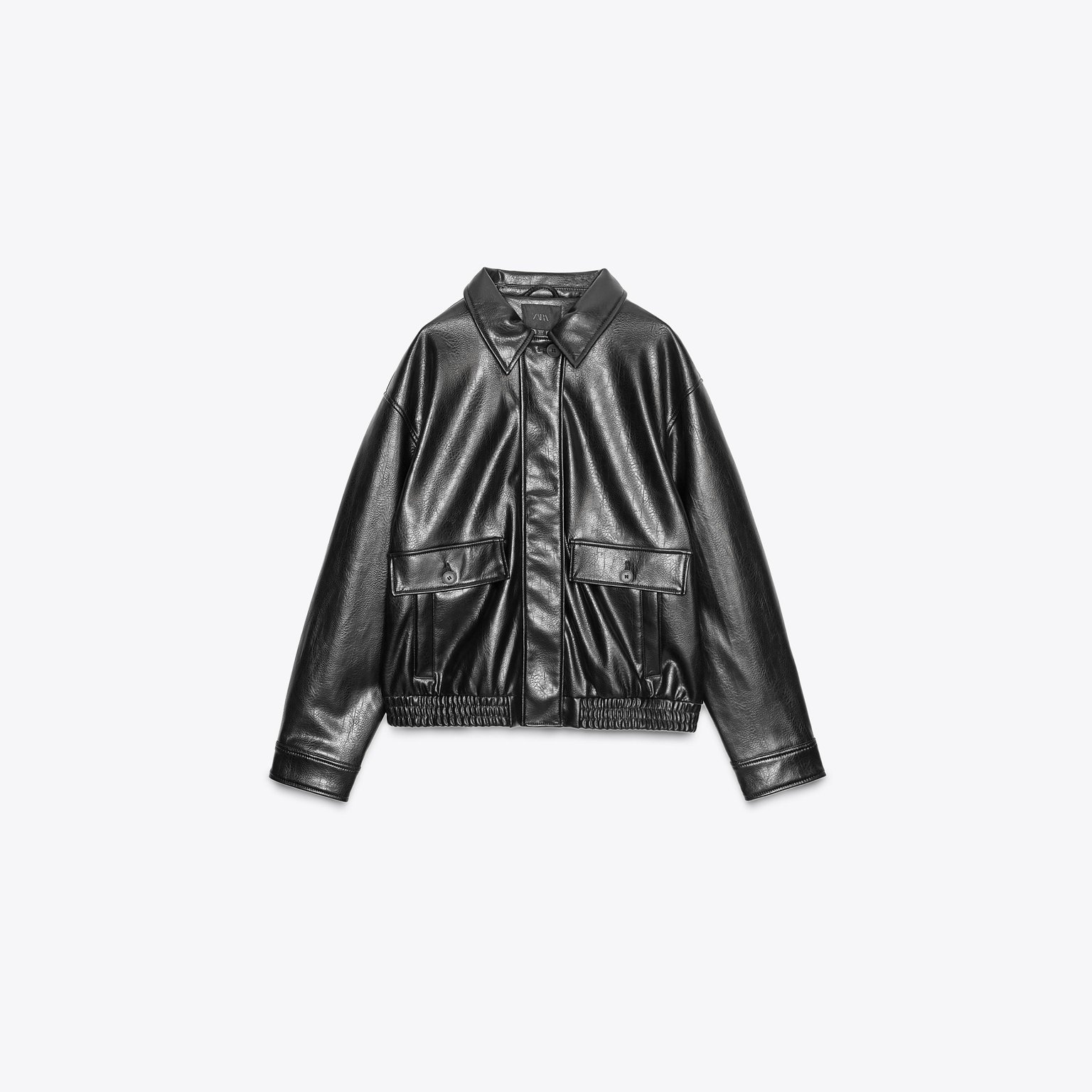 - التصميم: جاكيت بومبر جلد صناعي (Faux Leather Bomber Jacket)
