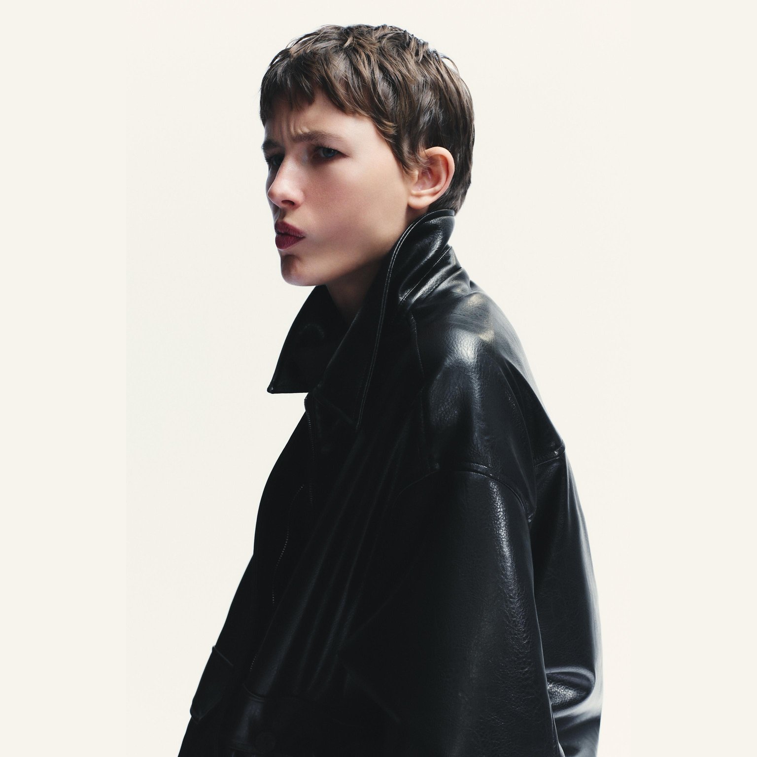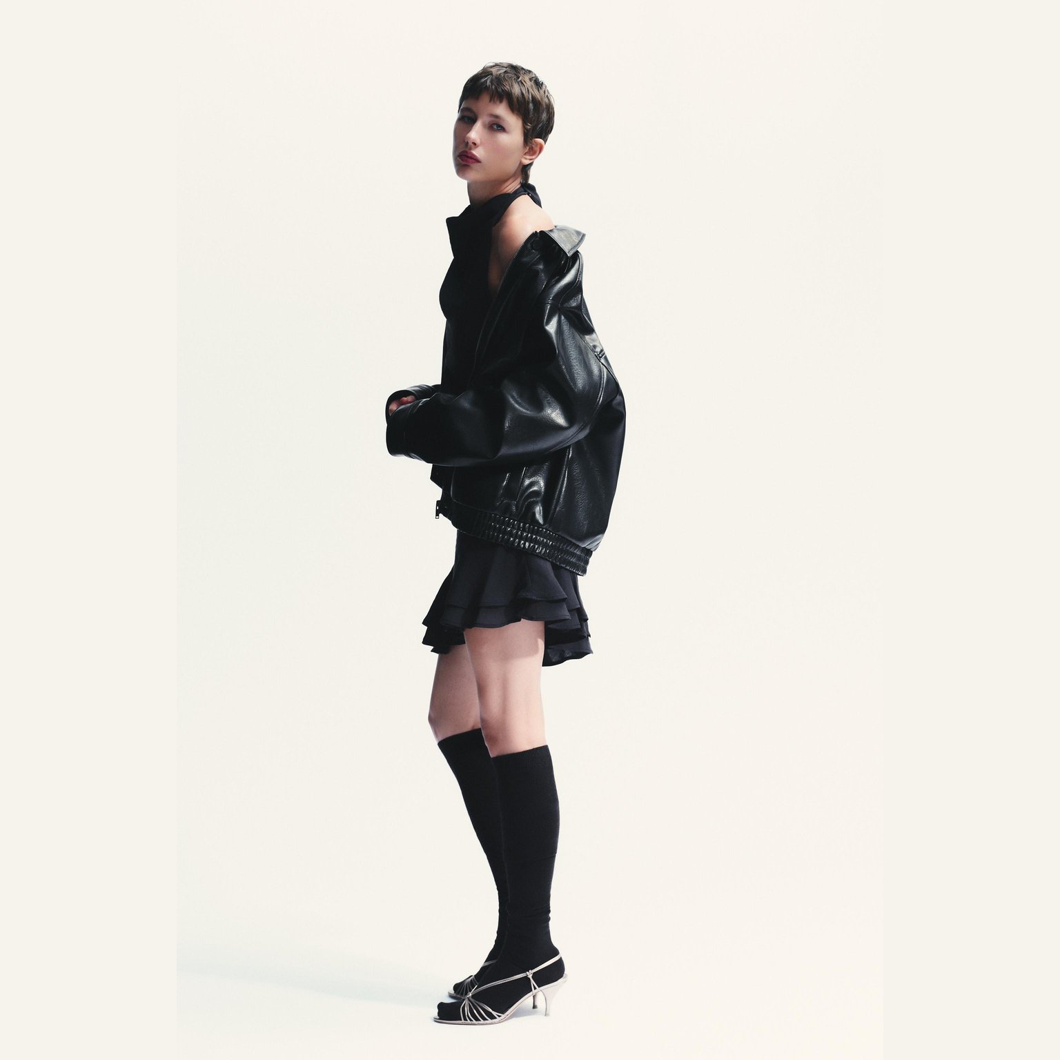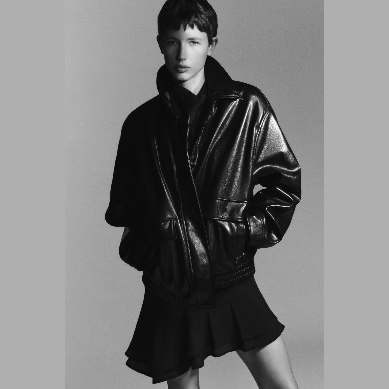 - التصميم: جاكيت بومبر جلد صناعي (Faux Leather Bomber Jacket)