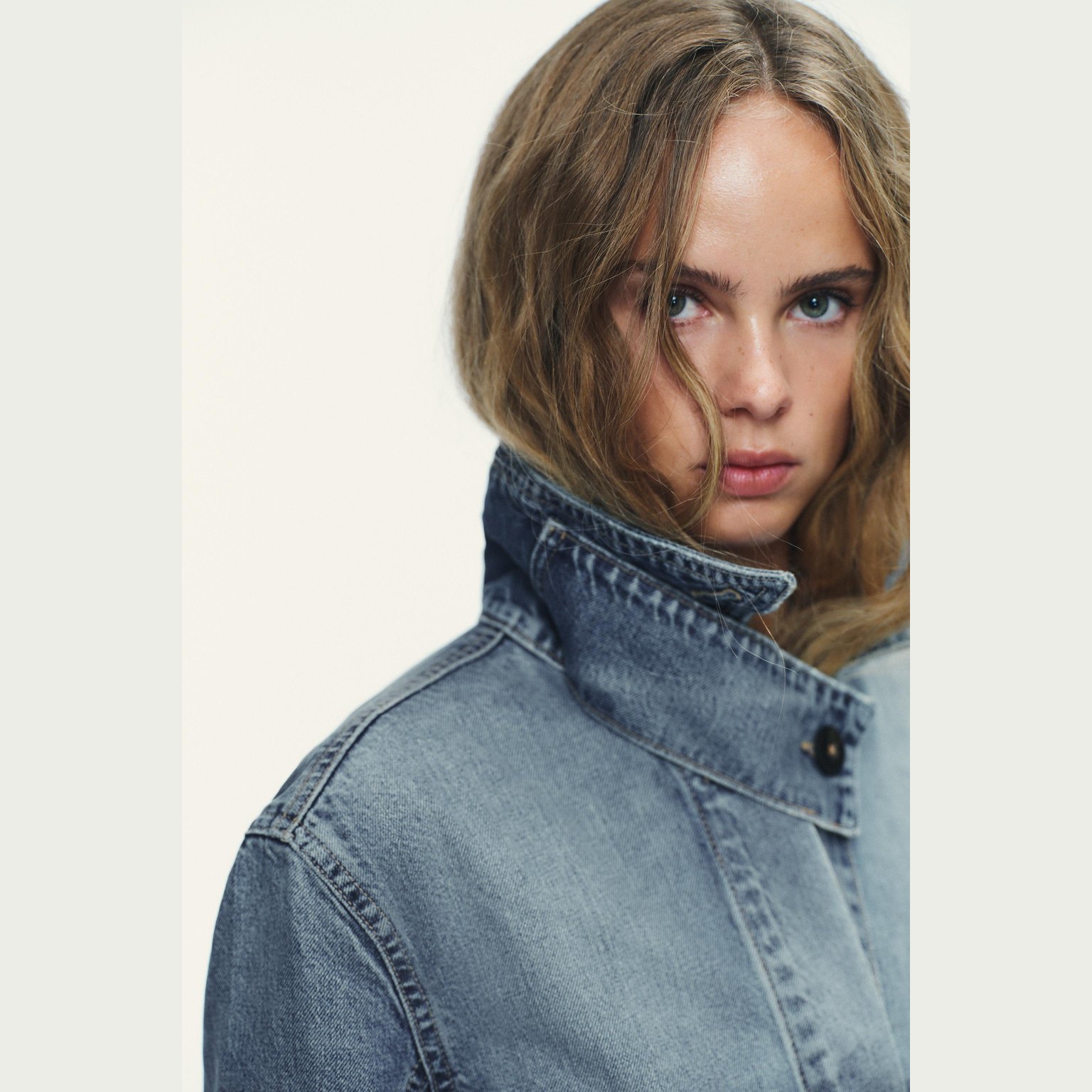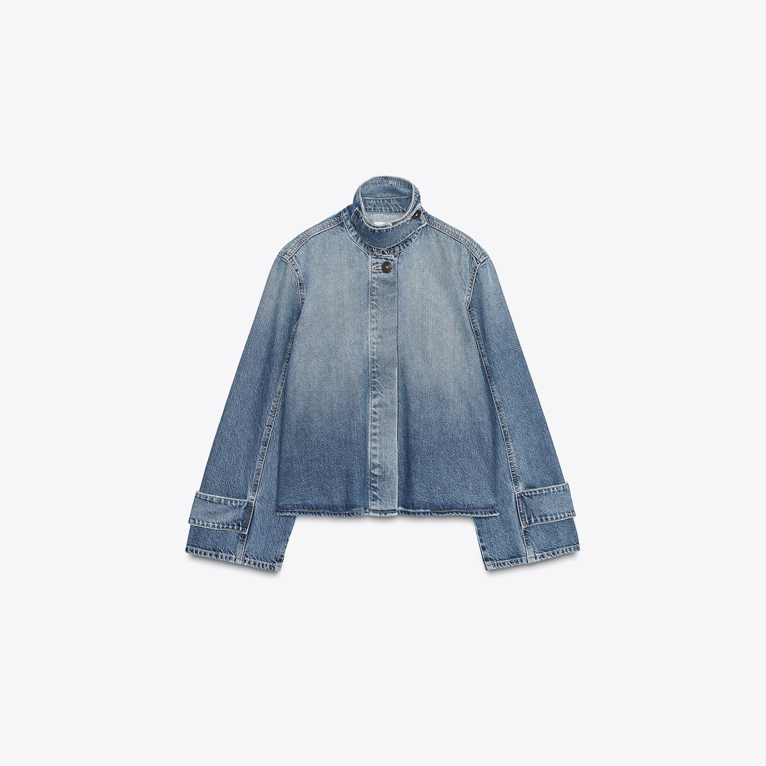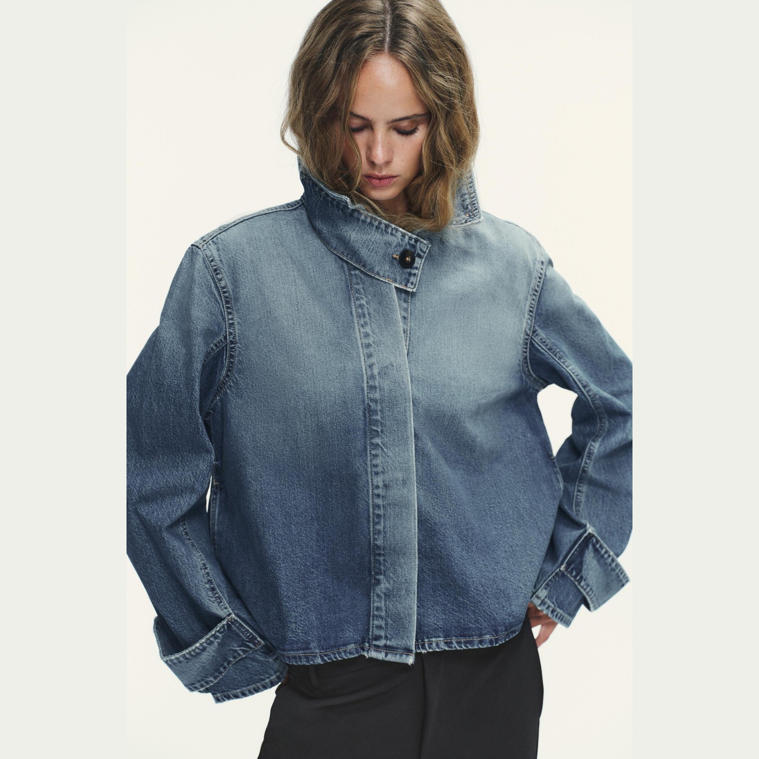 - التصميم: جاكيت دنيم بياقة عالية (TRF High Neck Denim Jacket)