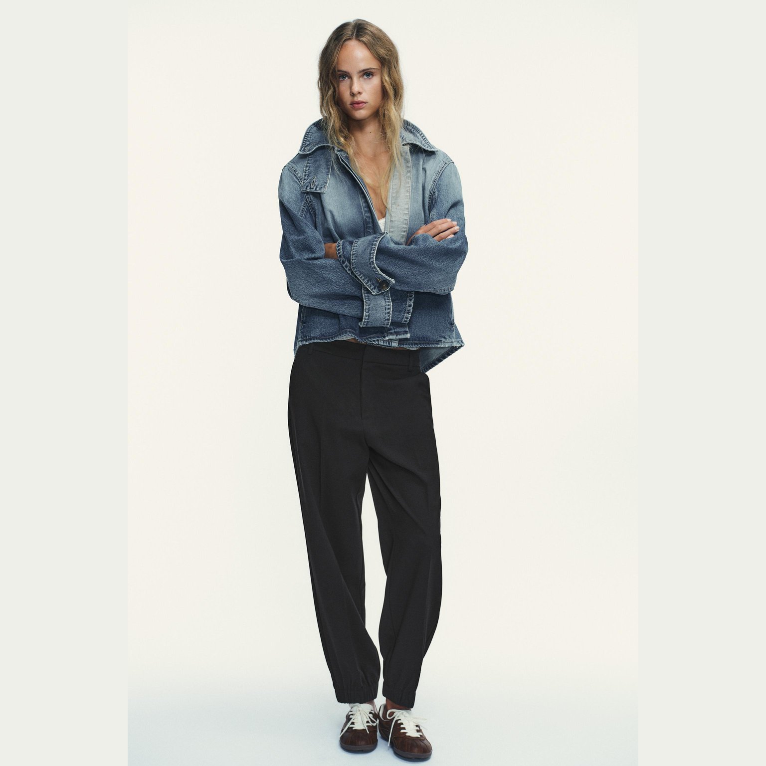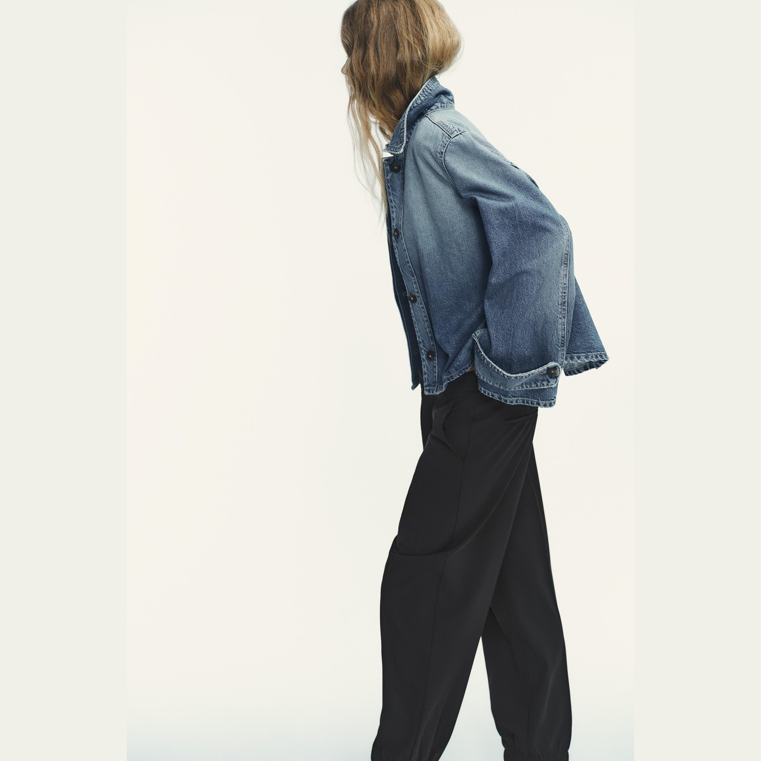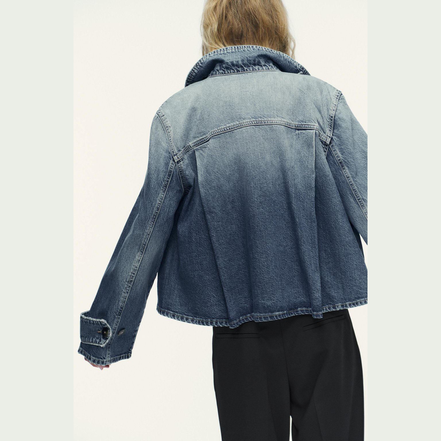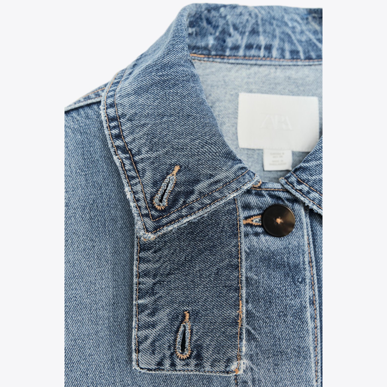 - التصميم: جاكيت دنيم بياقة عالية (TRF High Neck Denim Jacket)