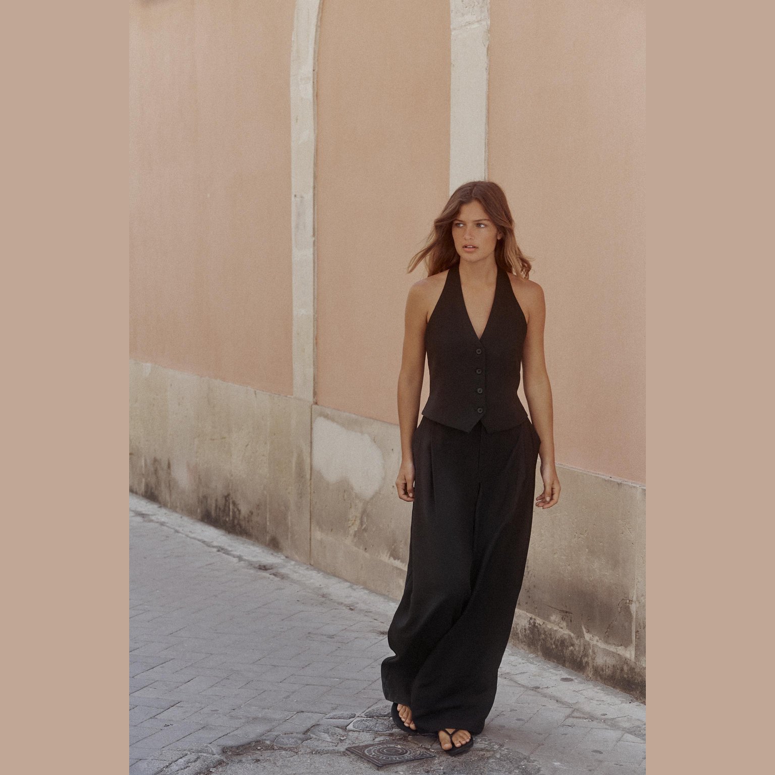 توب أنيق بتصميم فيست هالتر بلون أسود طبيعي، مصنوع من خامة ممزوجة تمنح مظهرًا عصريًا وملمسًا عمليًا. يتميز بياقة على شكل V، وأحزمة قابلة للربط عند الرقبة والخصر لإبراز الشكل، مع إغلاق أمامي بأزرار. تصميم مثالي للإطلالات الكاجوال الأنيقة أو المناسبات الخاصة.