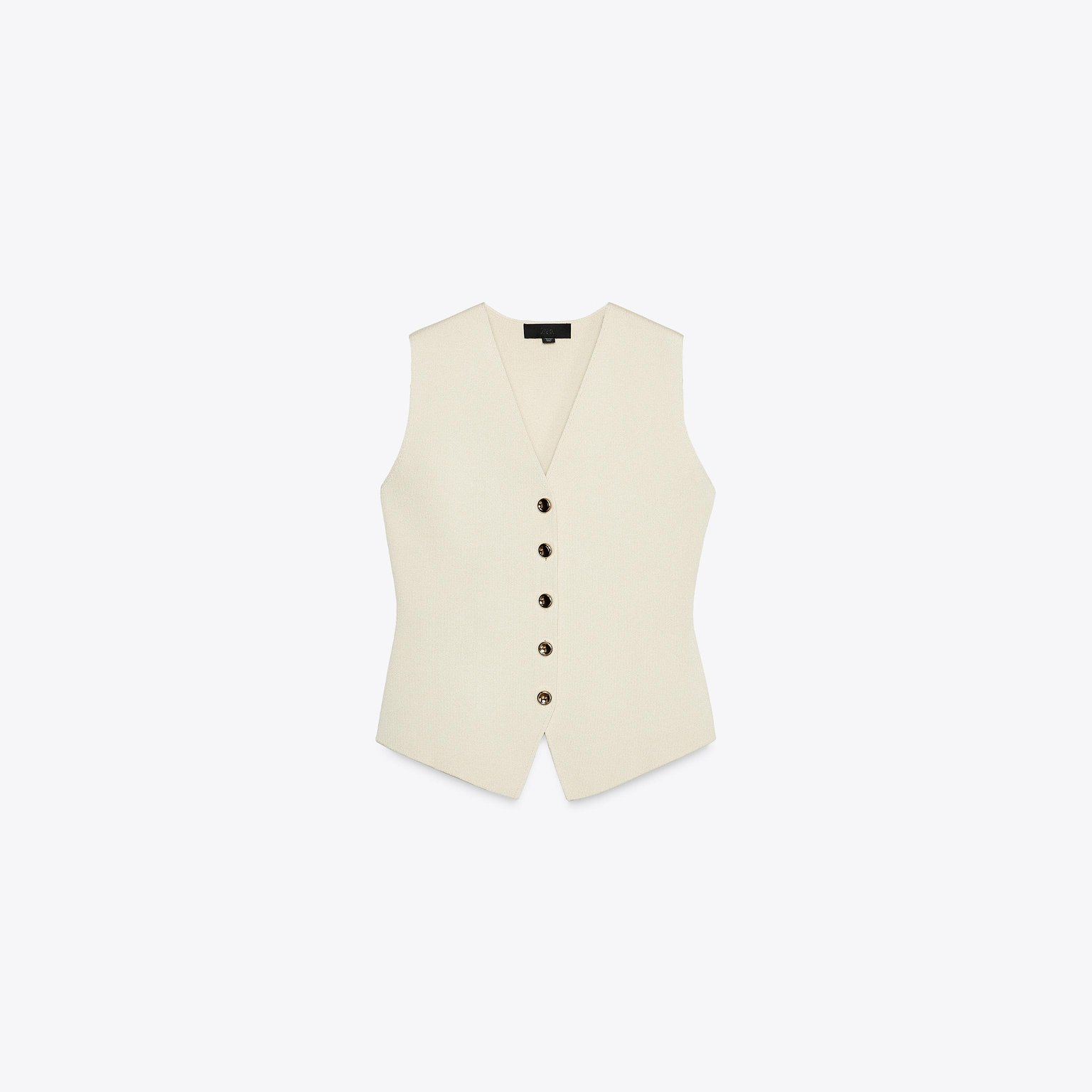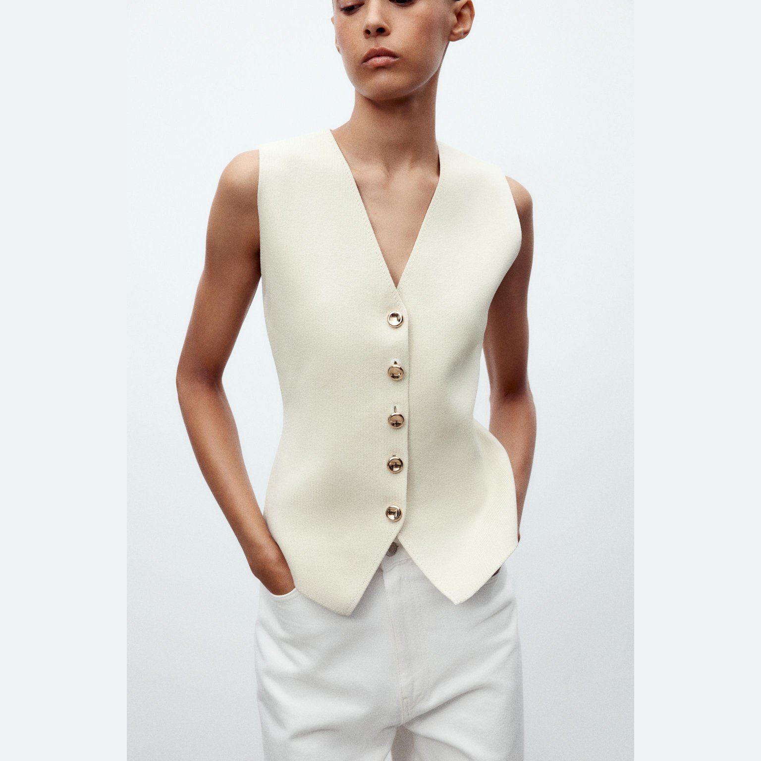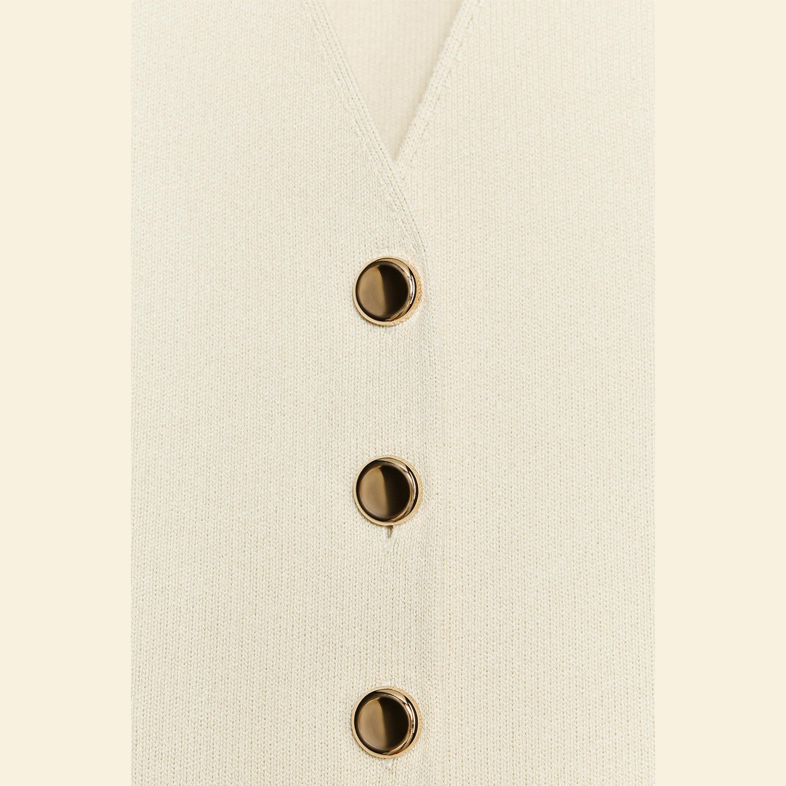 فيست أنيق بلون بيج فاتح طبيعي، مصنوع من خامة تريكو ممزوجة تمنح مظهرًا عصريًا وملمسًا عمليًا. يتميز بياقة V وأكمام قصيرة جدًا، مع إغلاق أمامي بأزرار، وحاشية مستقيمة. تصميم مثالي للإطلالات الكاجوال الأنيقة أو التنسيقات اليومية.