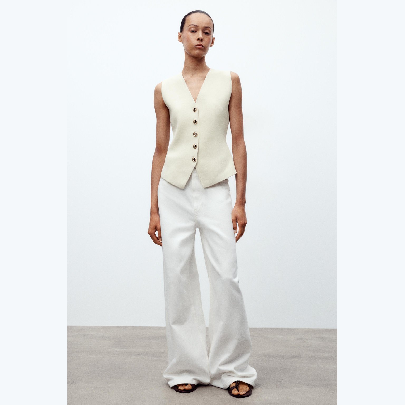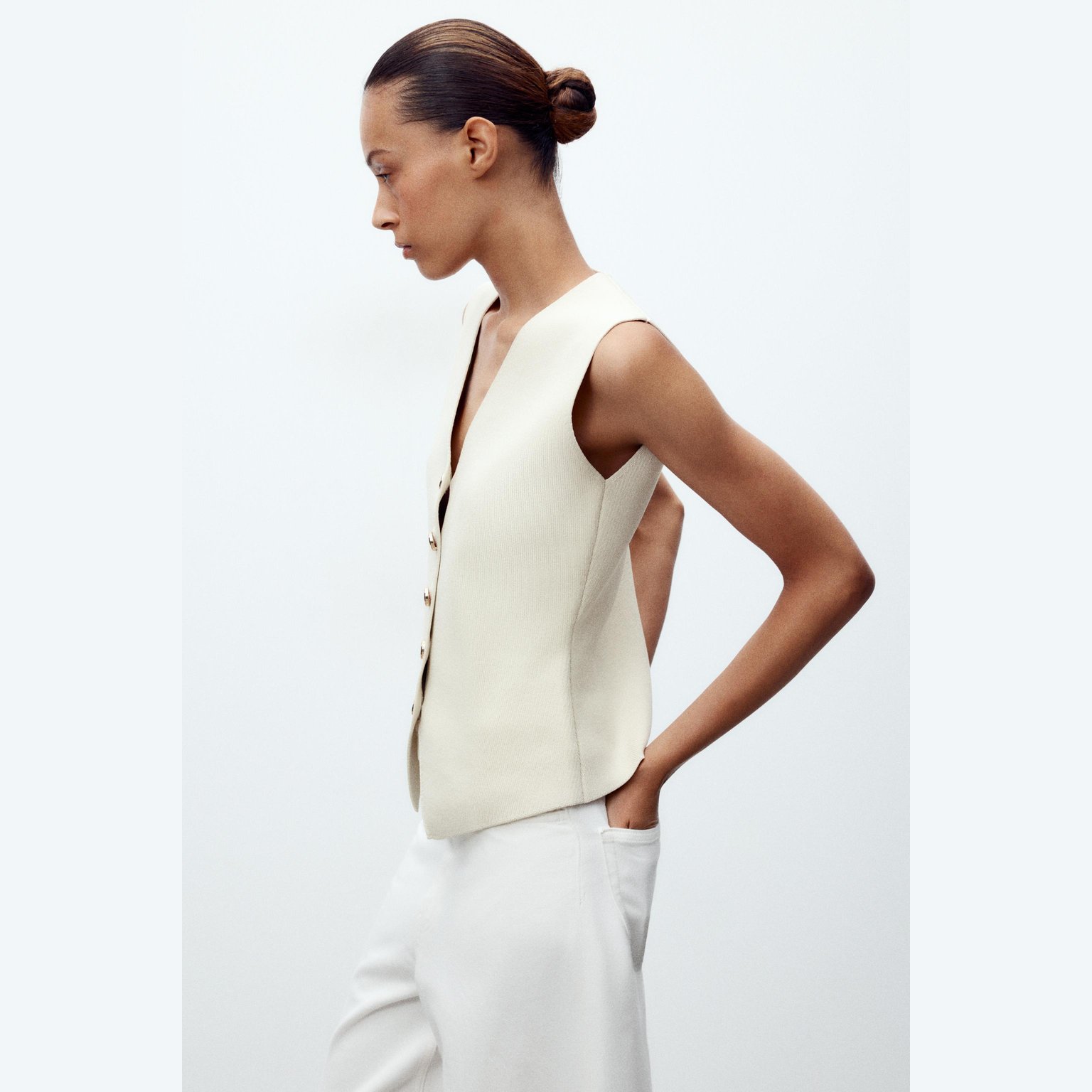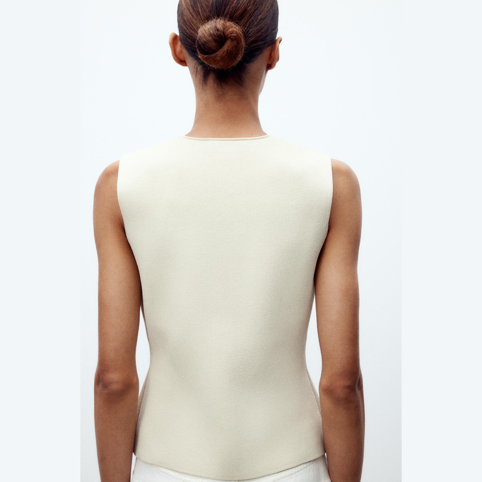 فيست أنيق بلون بيج فاتح طبيعي، مصنوع من خامة تريكو ممزوجة تمنح مظهرًا عصريًا وملمسًا عمليًا. يتميز بياقة V وأكمام قصيرة جدًا، مع إغلاق أمامي بأزرار، وحاشية مستقيمة. تصميم مثالي للإطلالات الكاجوال الأنيقة أو التنسيقات اليومية.