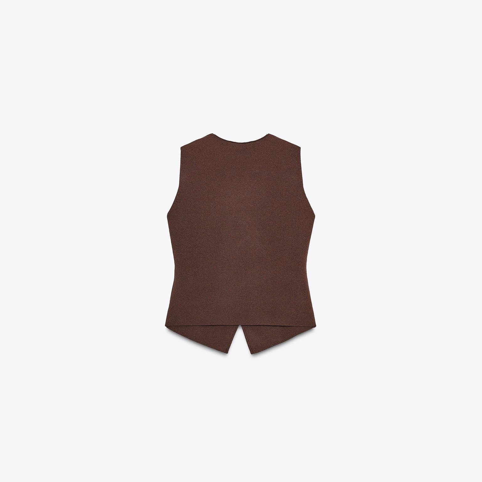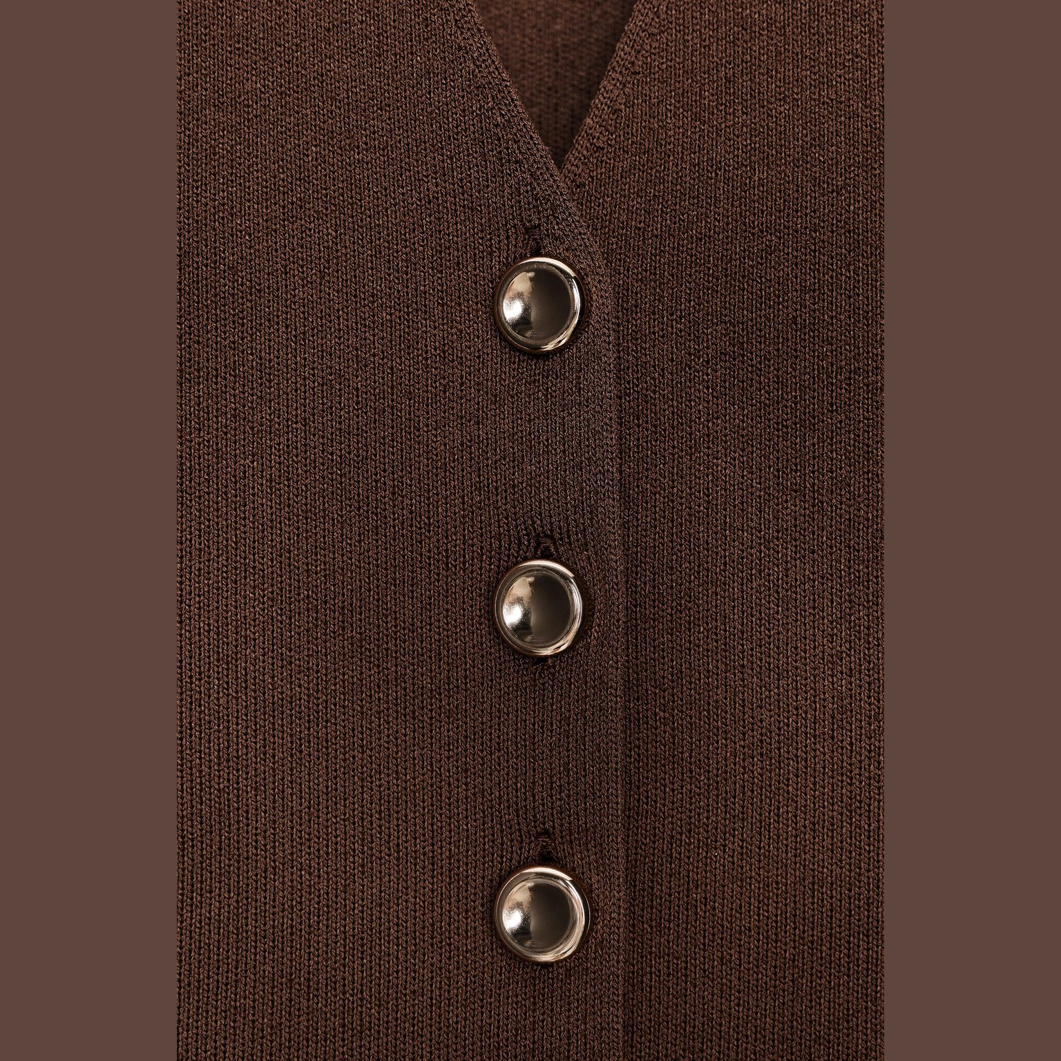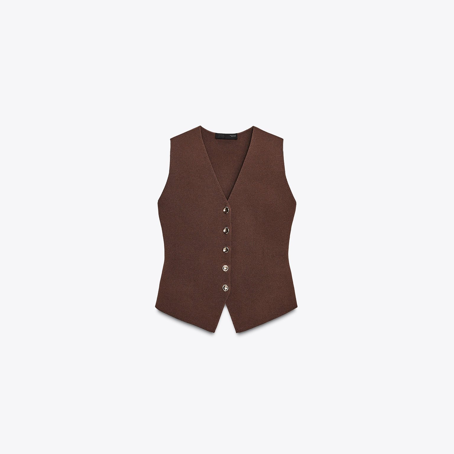 فيست أنيق بلون بني فاتح طبيعي، مصنوع من خامة تريكو ممزوجة تمنح مظهرًا عصريًا وملمسًا عمليًا. يتميز بياقة V وأكمام قصيرة جدًا، مع إغلاق أمامي بأزرار، وحاشية مستقيمة. تصميم مثالي للإطلالات الكاجوال الأنيقة أو التنسيقات اليومية.