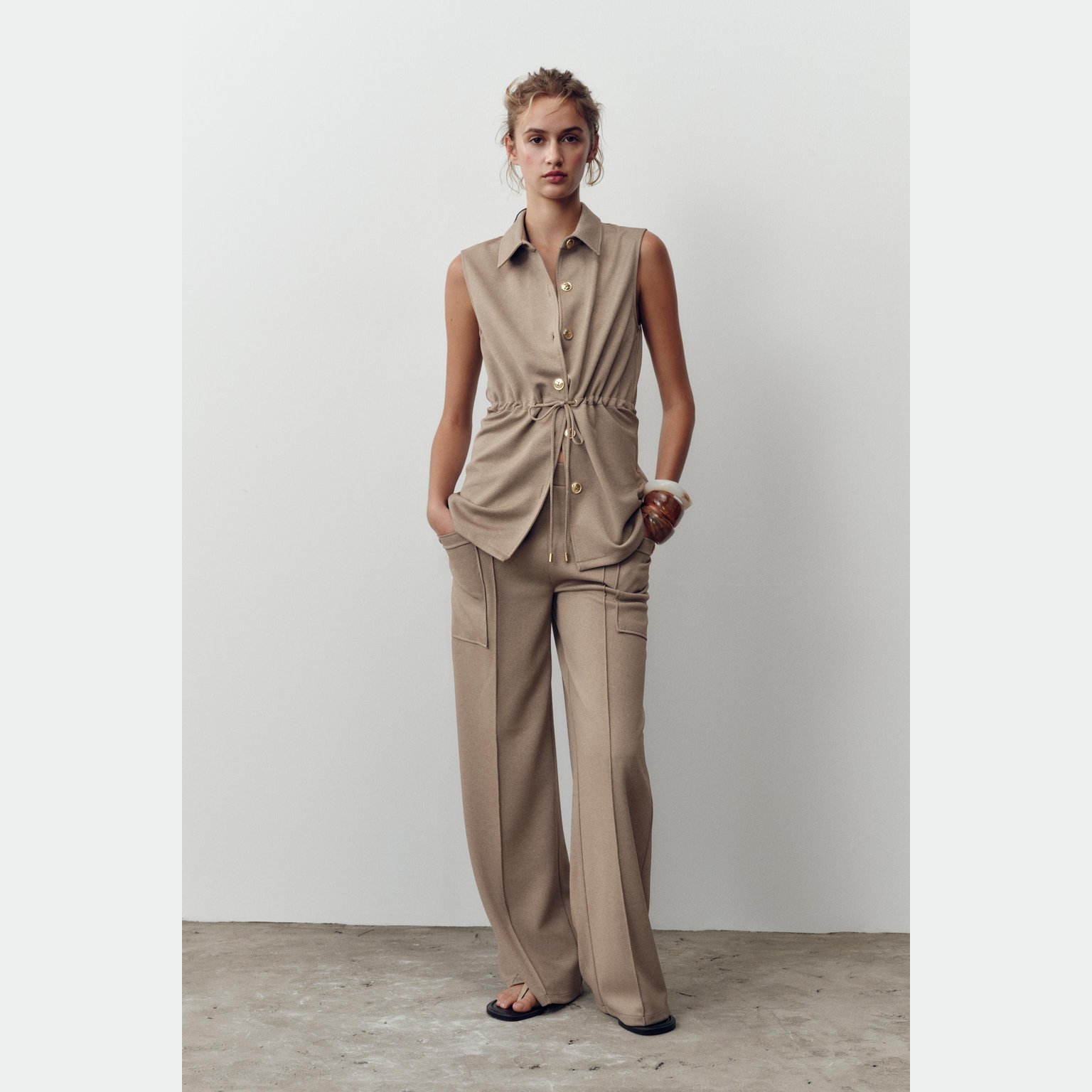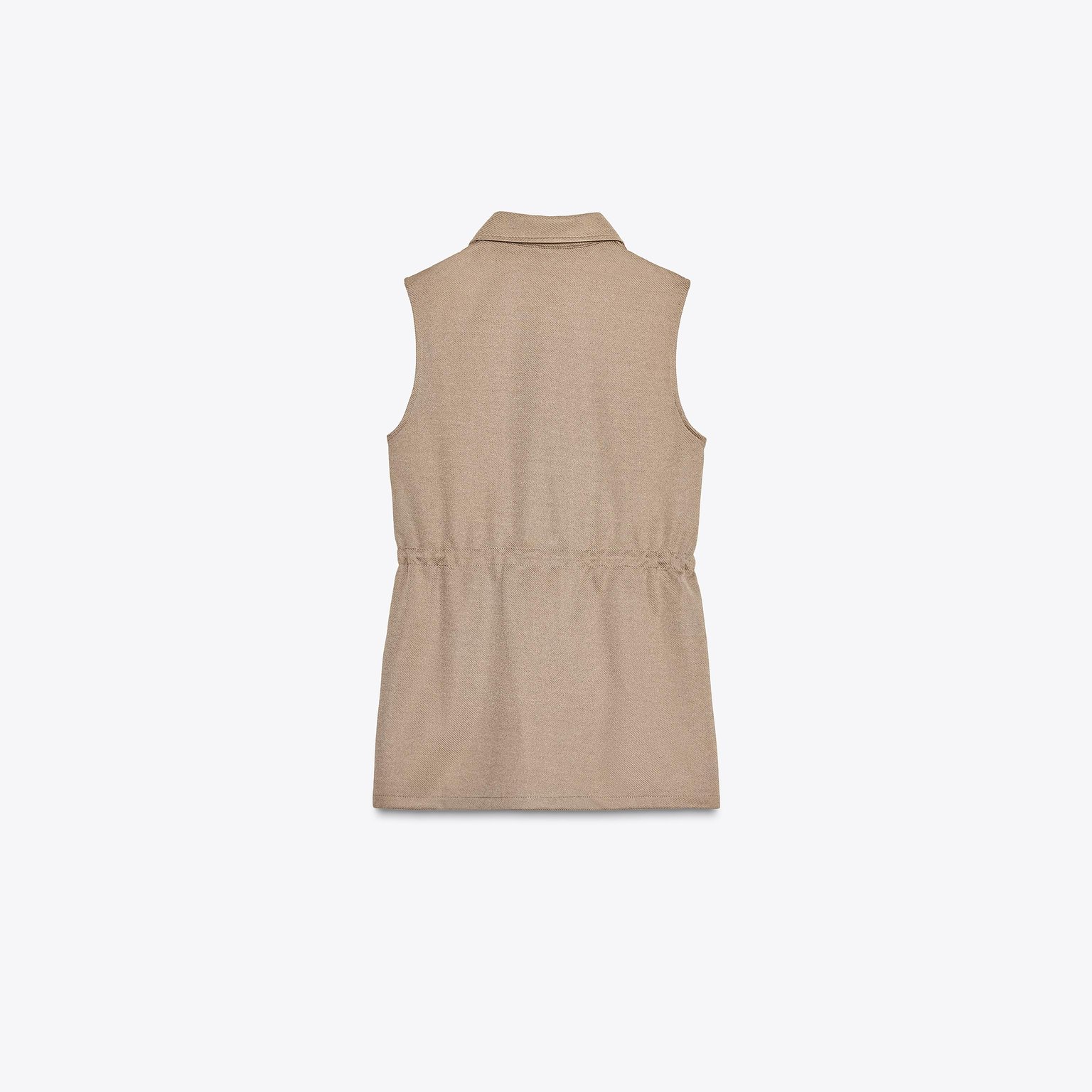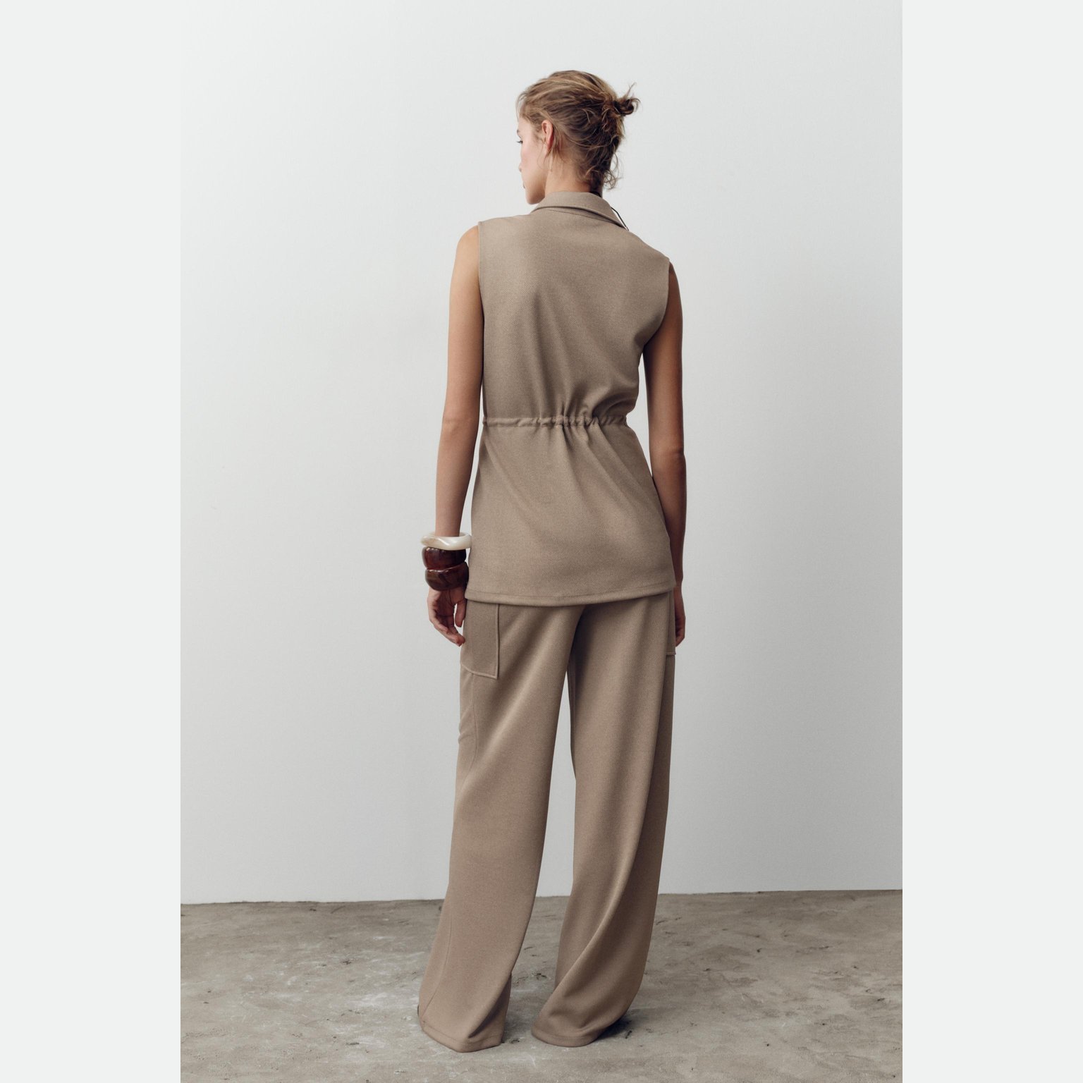 فيست أنيق بلون بيج طبيعي، مصنوع من خامة توييل ممزوجة تمنح مظهرًا عصريًا وملمسًا عمليًا. يتميز بياقة عريضة بلا أكمام، مع خصر قابل للتعديل بواسطة رباط داخلي، وإغلاق أمامي بأزرار معدنية بارزة. تصميم مثالي للإطلالات الكاجوال الأنيقة أو التنسيقات الرسمية الخفيفة.