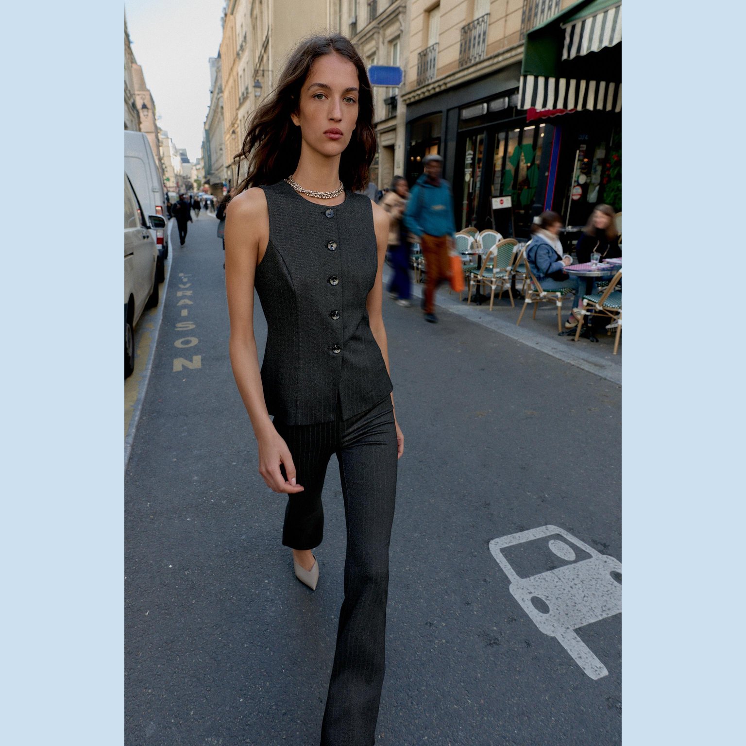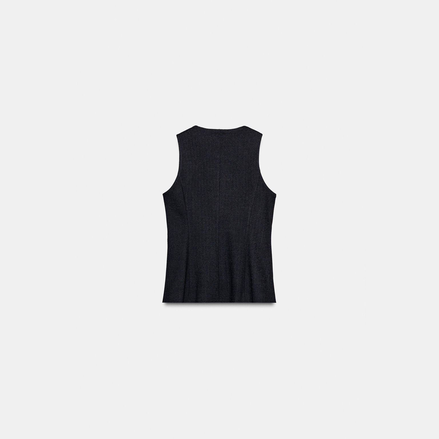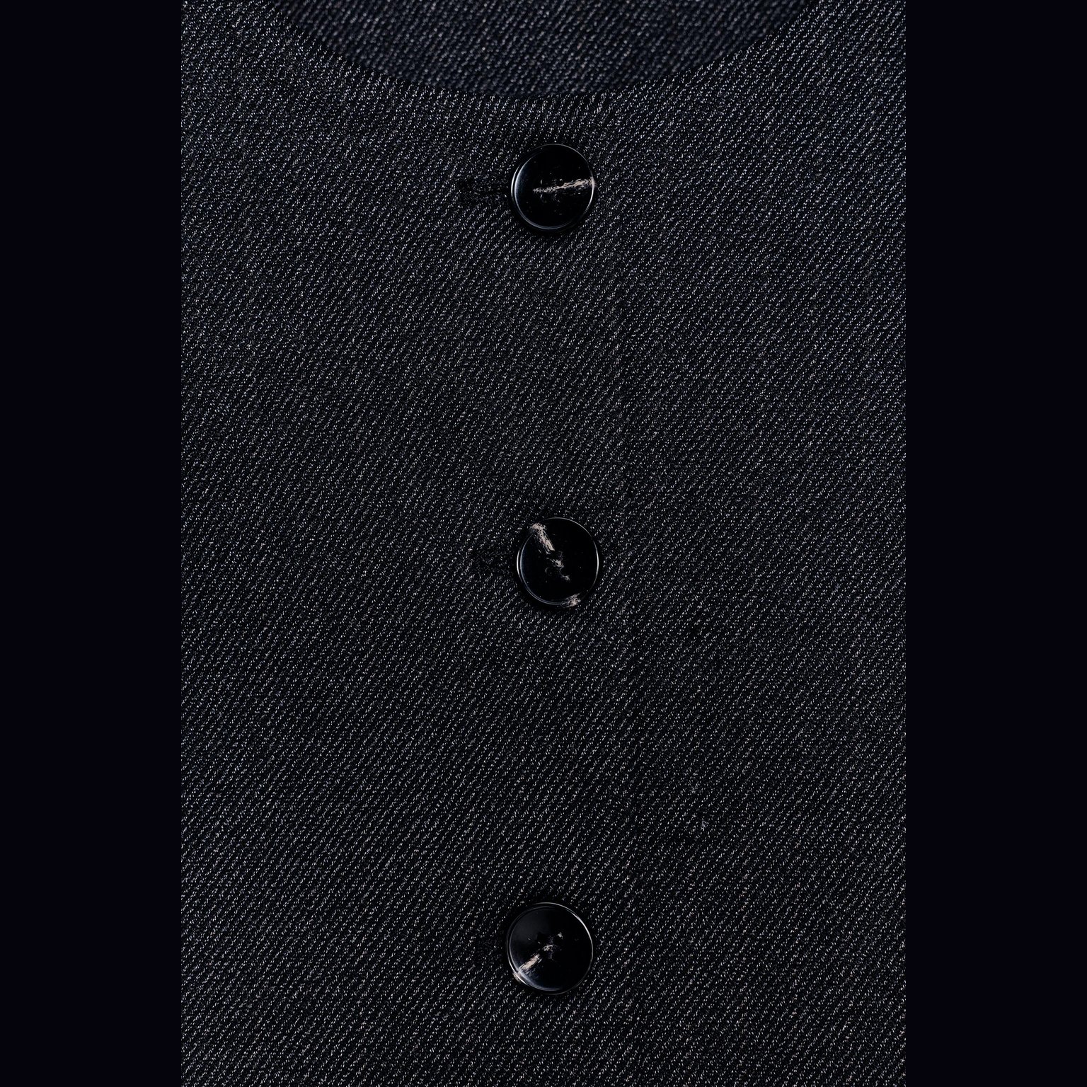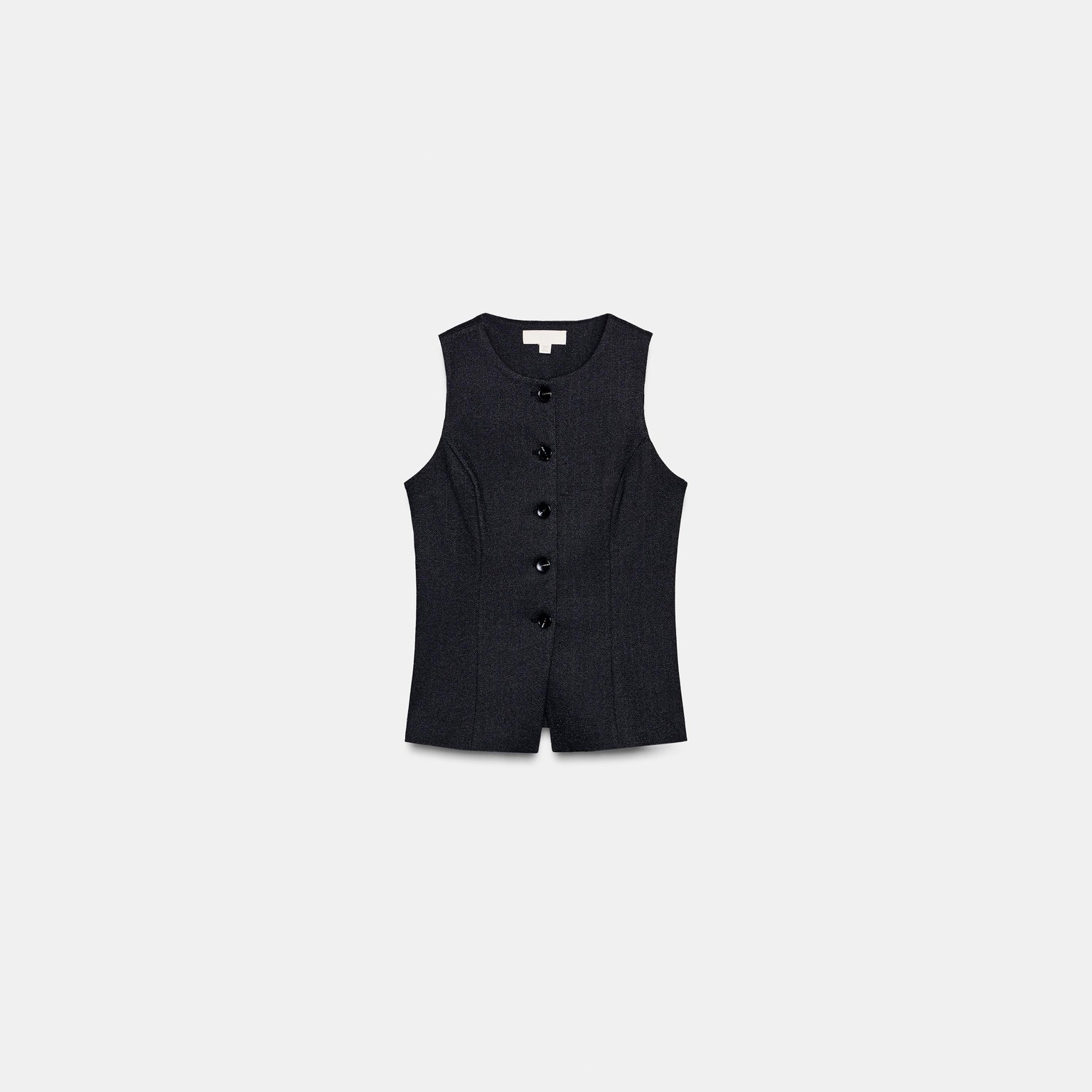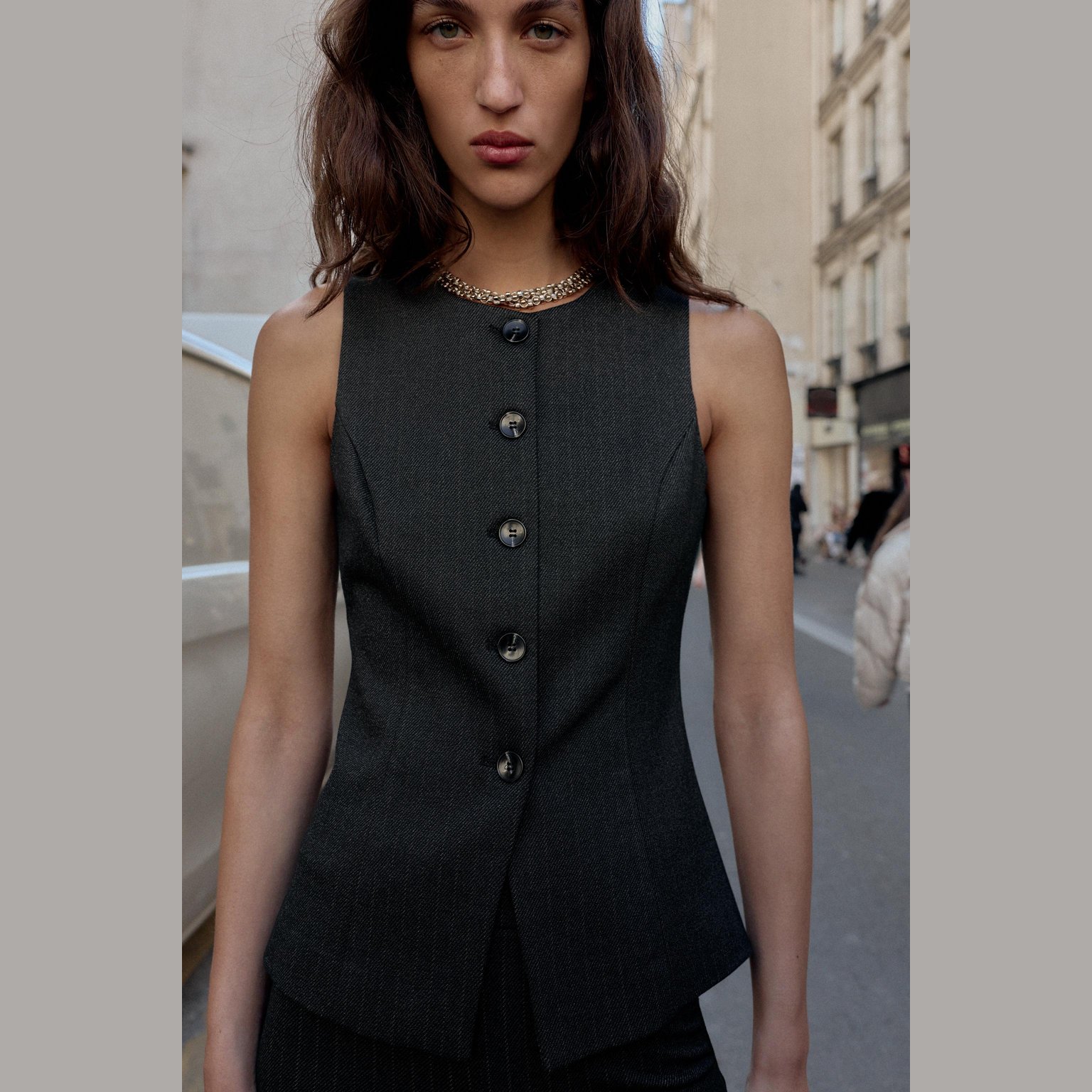 فيست أنيق بلون رمادي غامق طبيعي، مصنوع من خامة ممزوجة تمنح مظهرًا عصريًا وملمسًا عمليًا، مع بطانة داخلية من البوليستر لراحة إضافية. يتميز برقبة مستديرة وتصميم بلا أكمام، مع إغلاق أمامي بأزرار، وحاشية مستقيمة. تصميم مثالي للإطلالات الرسمية أو الكاجوال الأنيقة.