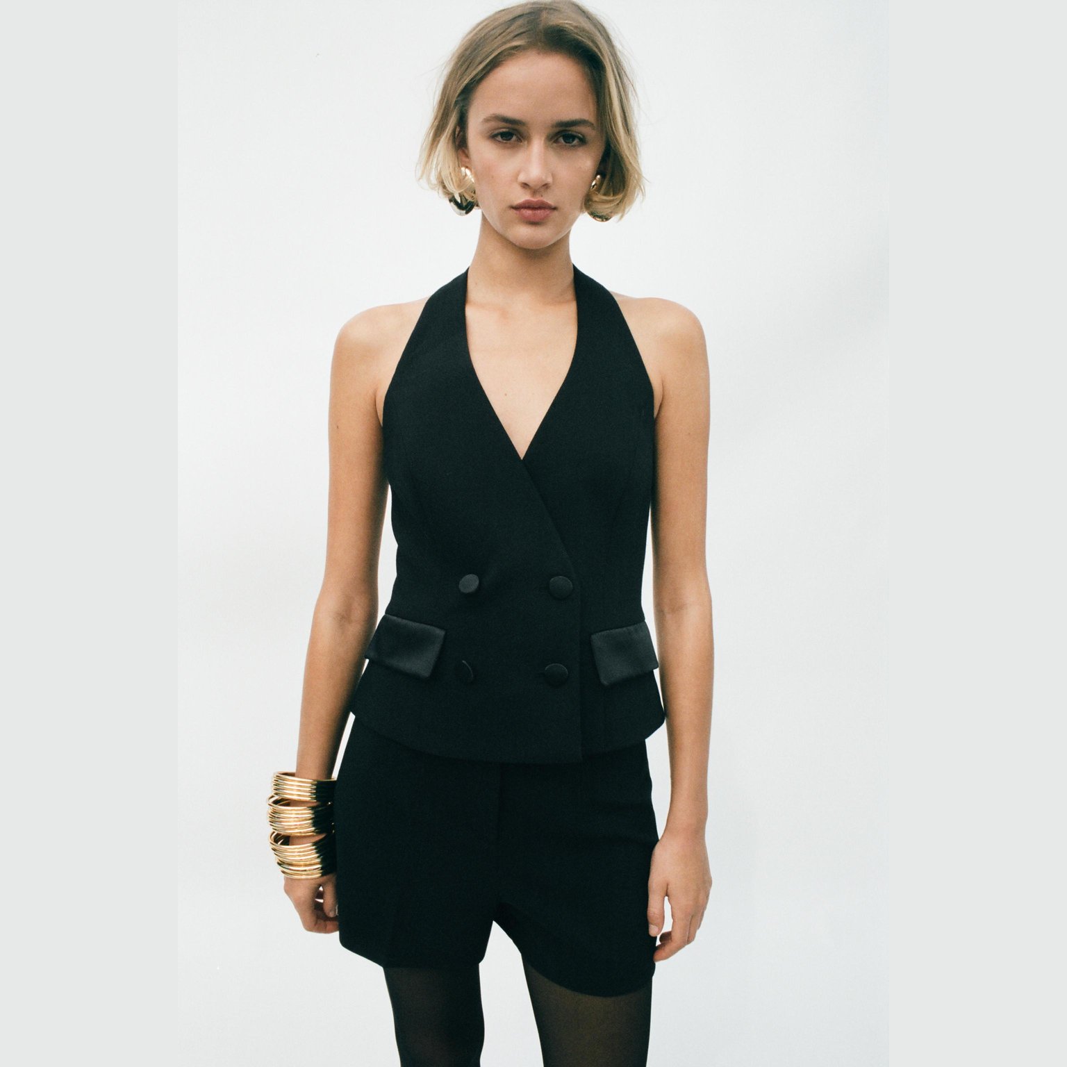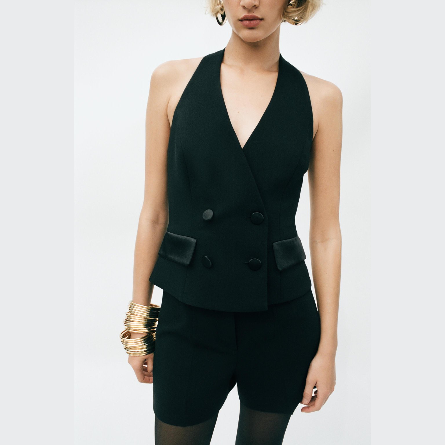 فيست أنيق بتصميم توكسيدو هالتر بلون أسود طبيعي، مصنوع من خامة ممزوجة تمنح مظهرًا كلاسيكيًا وعصريًا في آن واحد. يتميز بياقة على شكل V مع ظهر مفتوح، وجيوب أمامية بغطاء ساتان، وأزرار أمامية مغطاة بالساتان، مع بطانة داخلية من الأسيتات لراحة إضافية. تصميم مثالي للإطلالات الرسمية والمناسبات الخاصة.