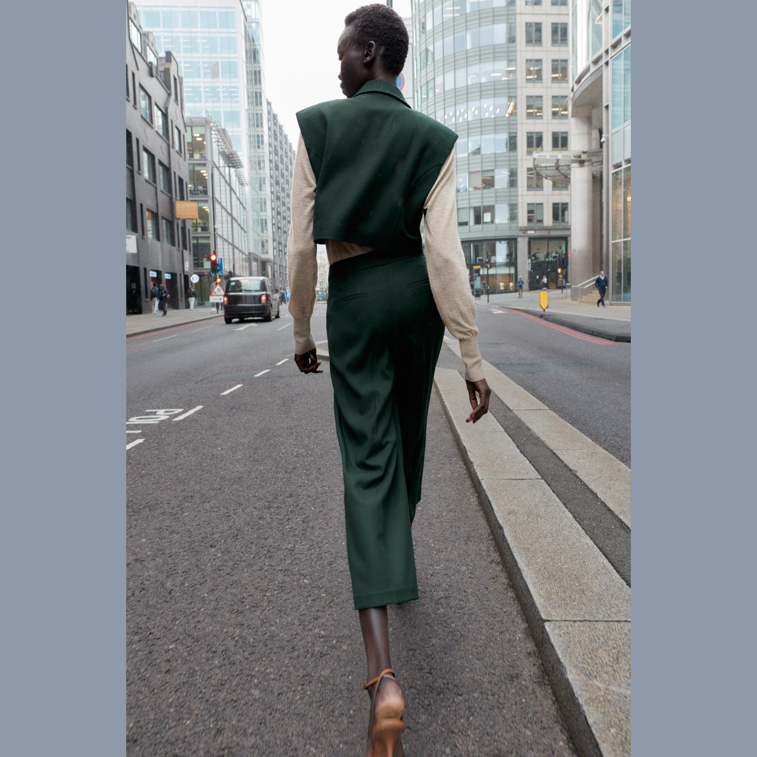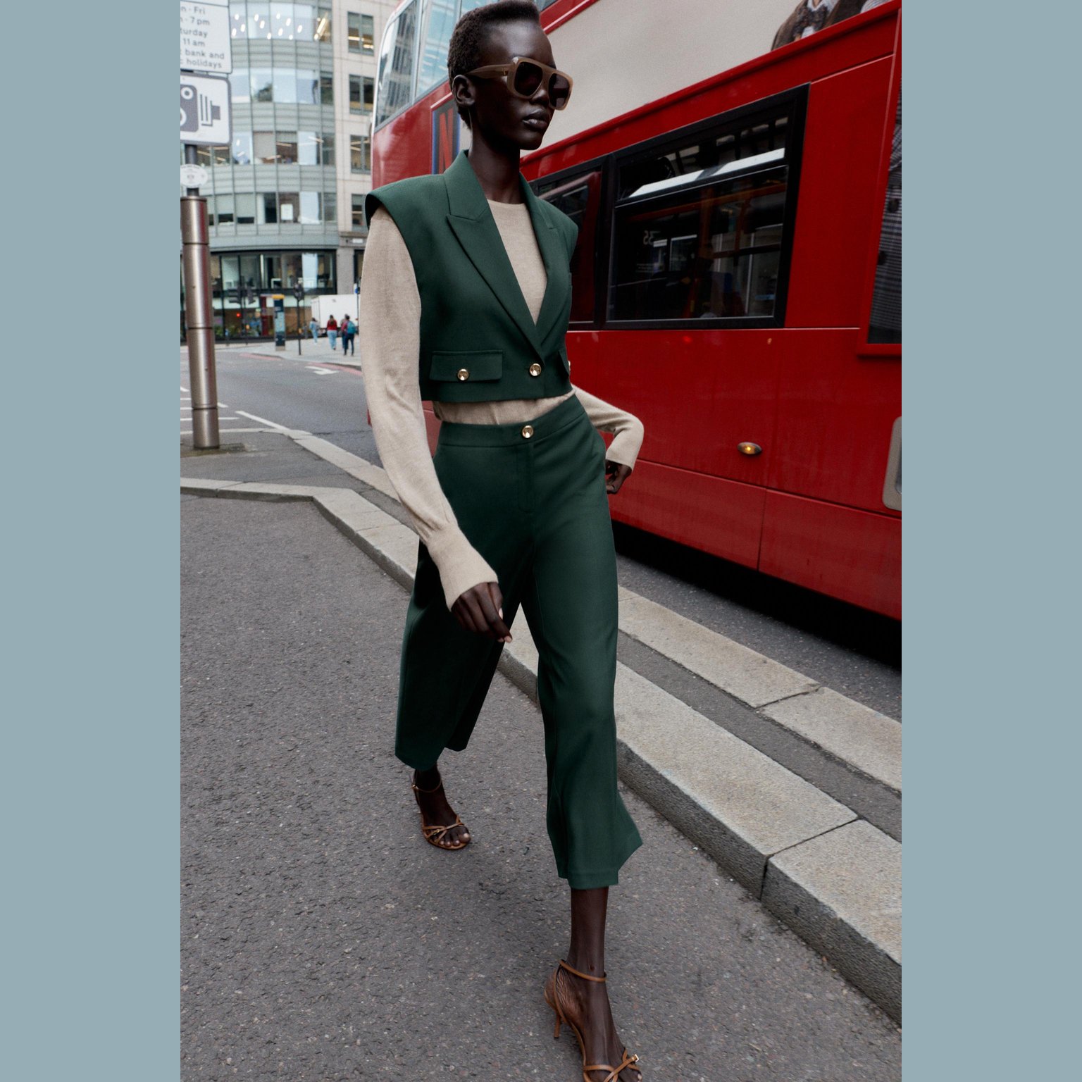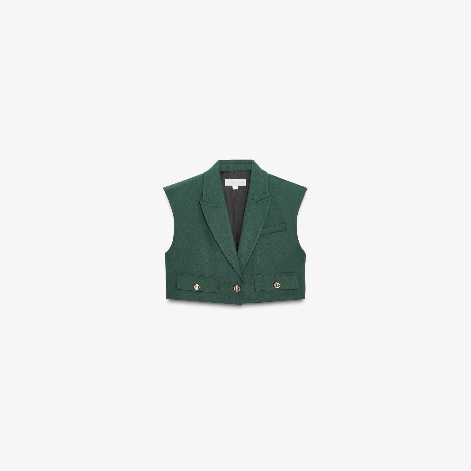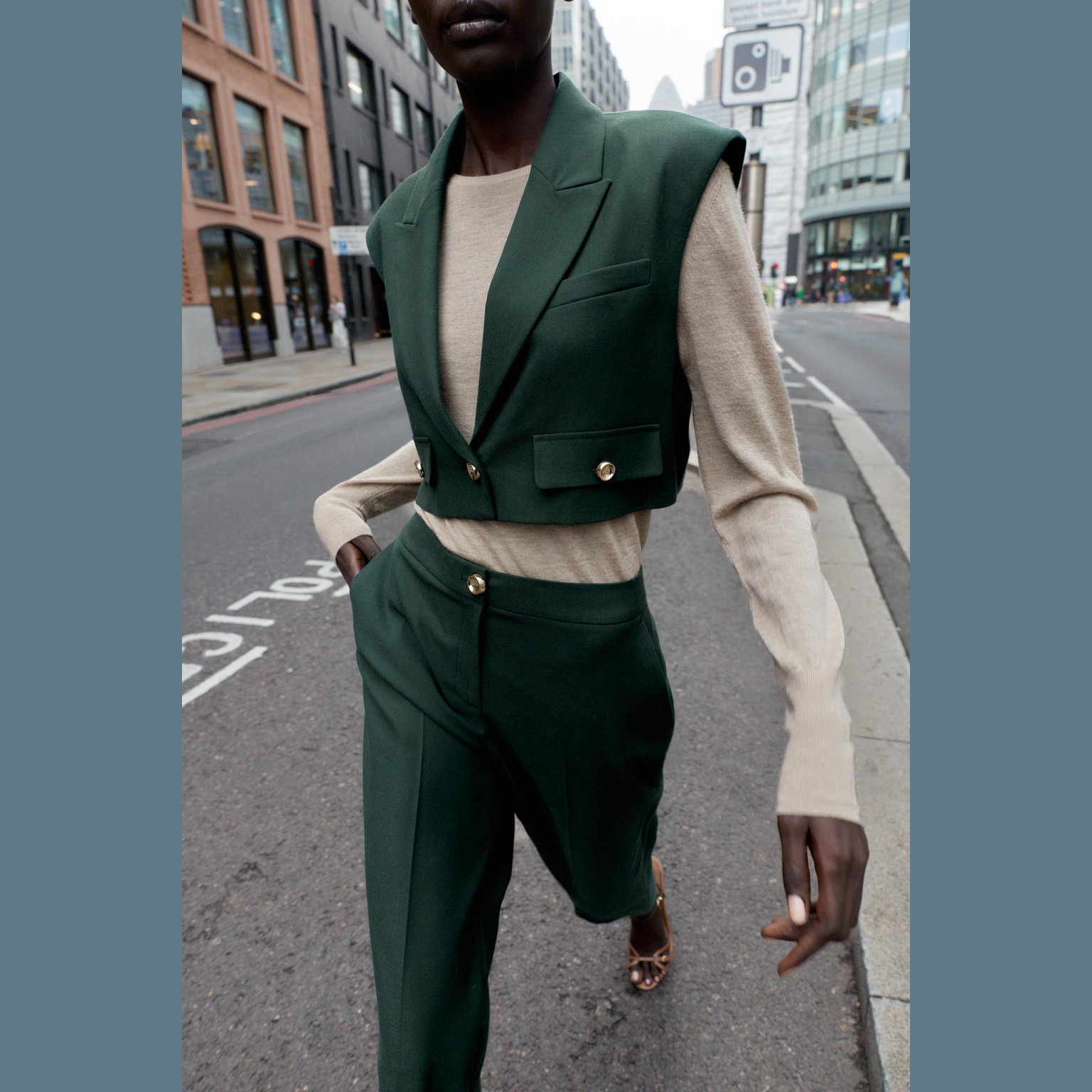 فيست أنيق بلون أخضر غامق طبيعي، مصنوع من خامة ممزوجة تمنح مظهرًا عصريًا وملمسًا عمليًا، مع بطانة داخلية من البوليستر لراحة إضافية. يتميز بياقة عريضة بلا أكمام، مع أكتاف محددة، وجيوب أمامية بغطاء، وإغلاق أمامي بزر واحد. تصميم مثالي للإطلالات الرسمية أو الكاجوال الأنيقة.