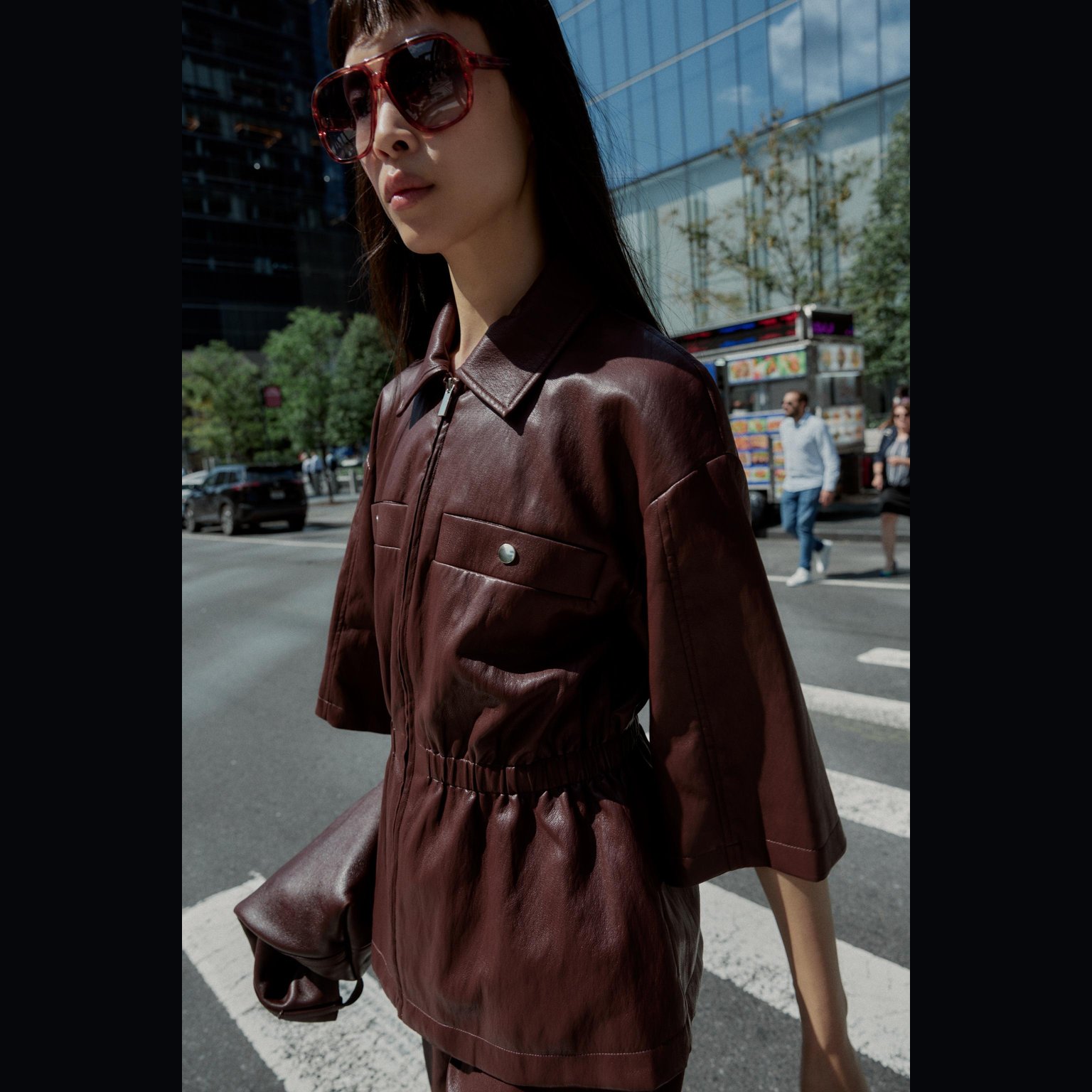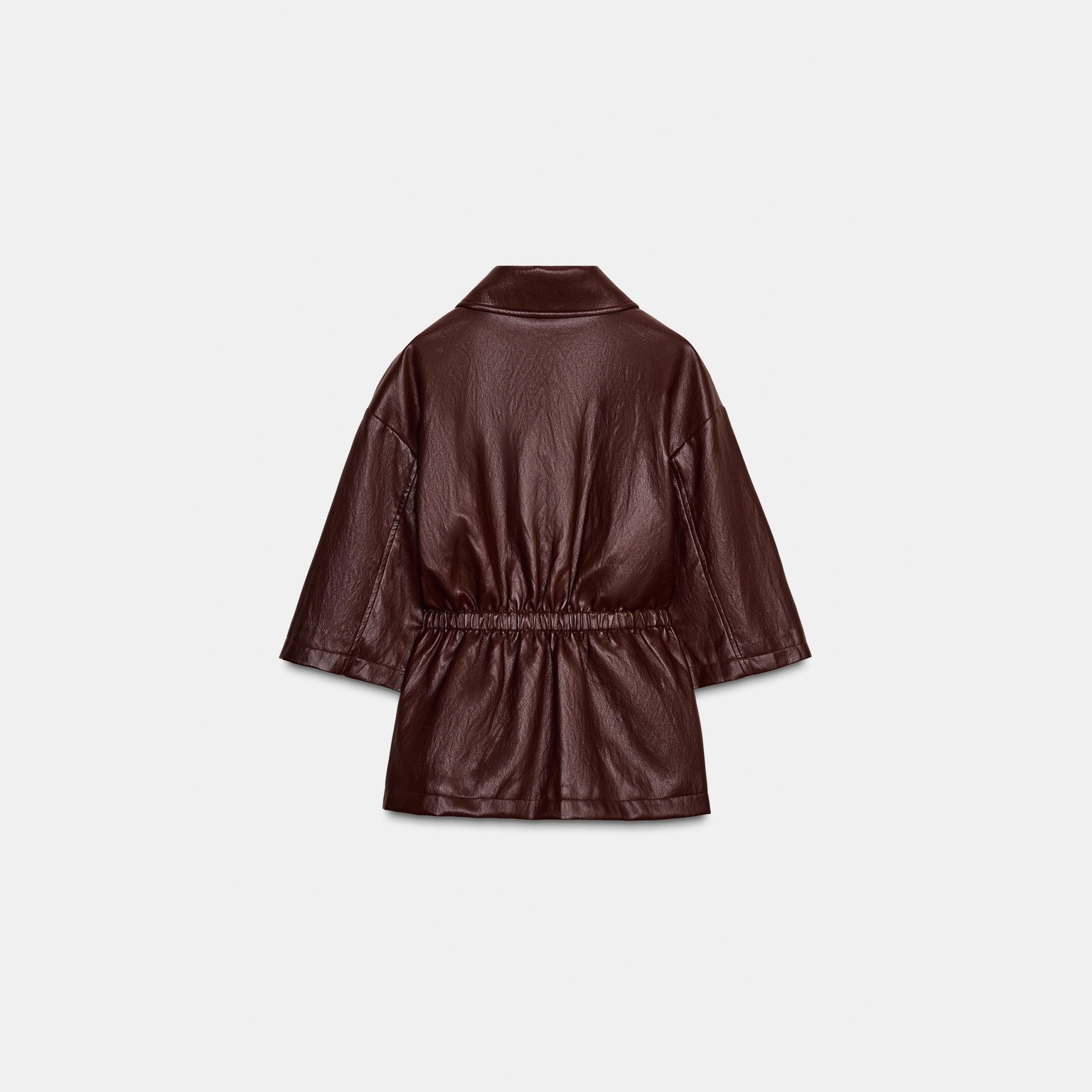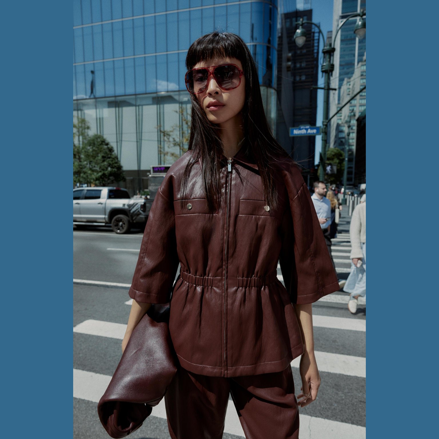 - التصميم: جاكيت جلد صناعي (Faux Leather Jacket)