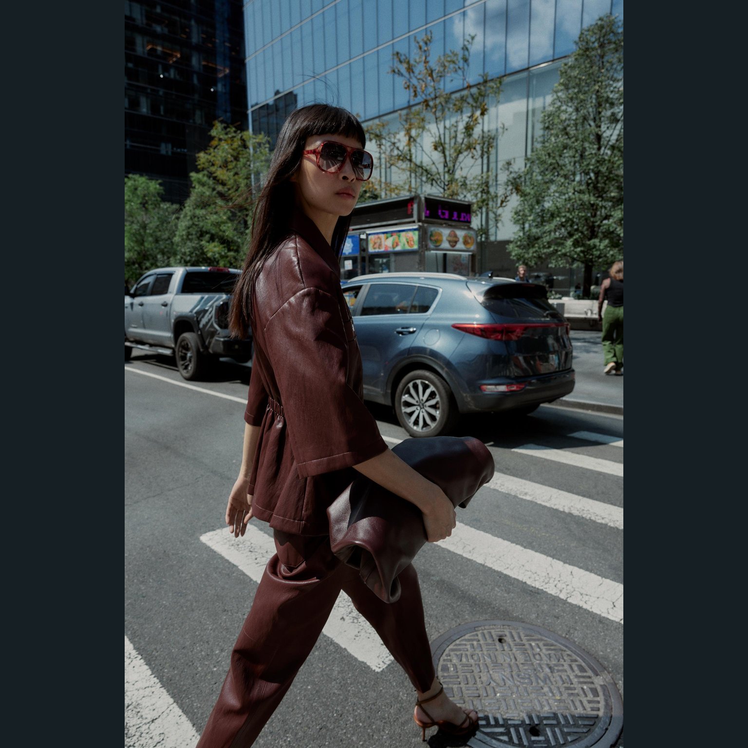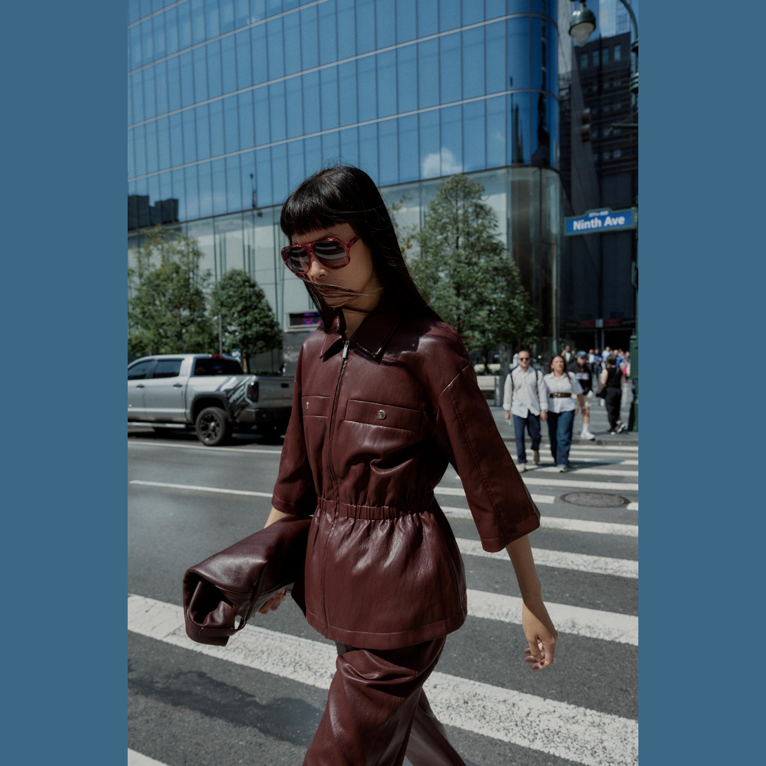 جاكيت أنيق بلون برغندي طبيعي، مصنوع من خامة جلد صناعي عالية الجودة تمنح مظهرًا عصريًا وملمسًا عمليًا، مع بطانة داخلية من البوليستر لراحة إضافية. يتميز بياقة عريضة مع أكمام بطول ما تحت المرفق، خصر مطاطي لمظهر متوازن، إغلاق أمامي بسحاب معدني، وجيوب أمامية وهمية لمسة تصميمية أنيقة. تصميم مثالي للإطلالات الكاجوال الأنيقة أو التنسيقات اليومية.