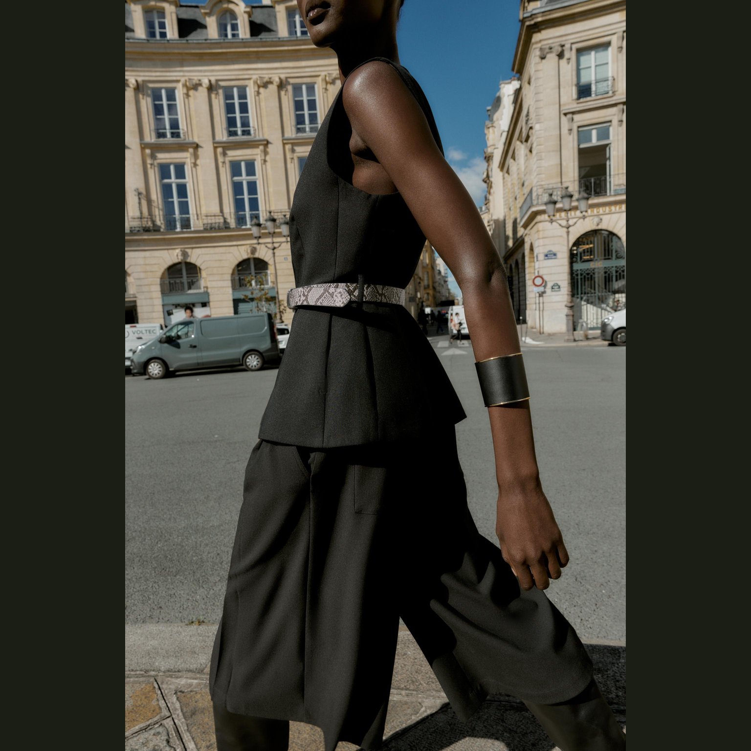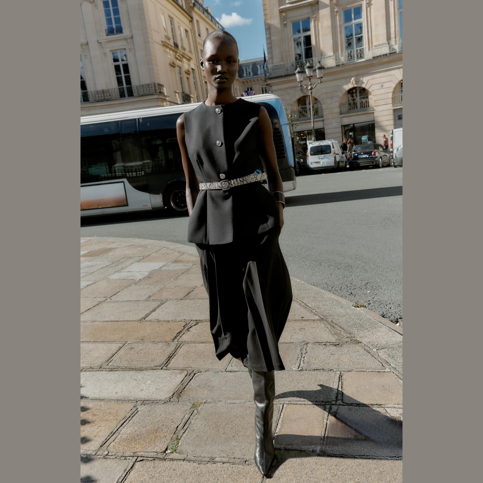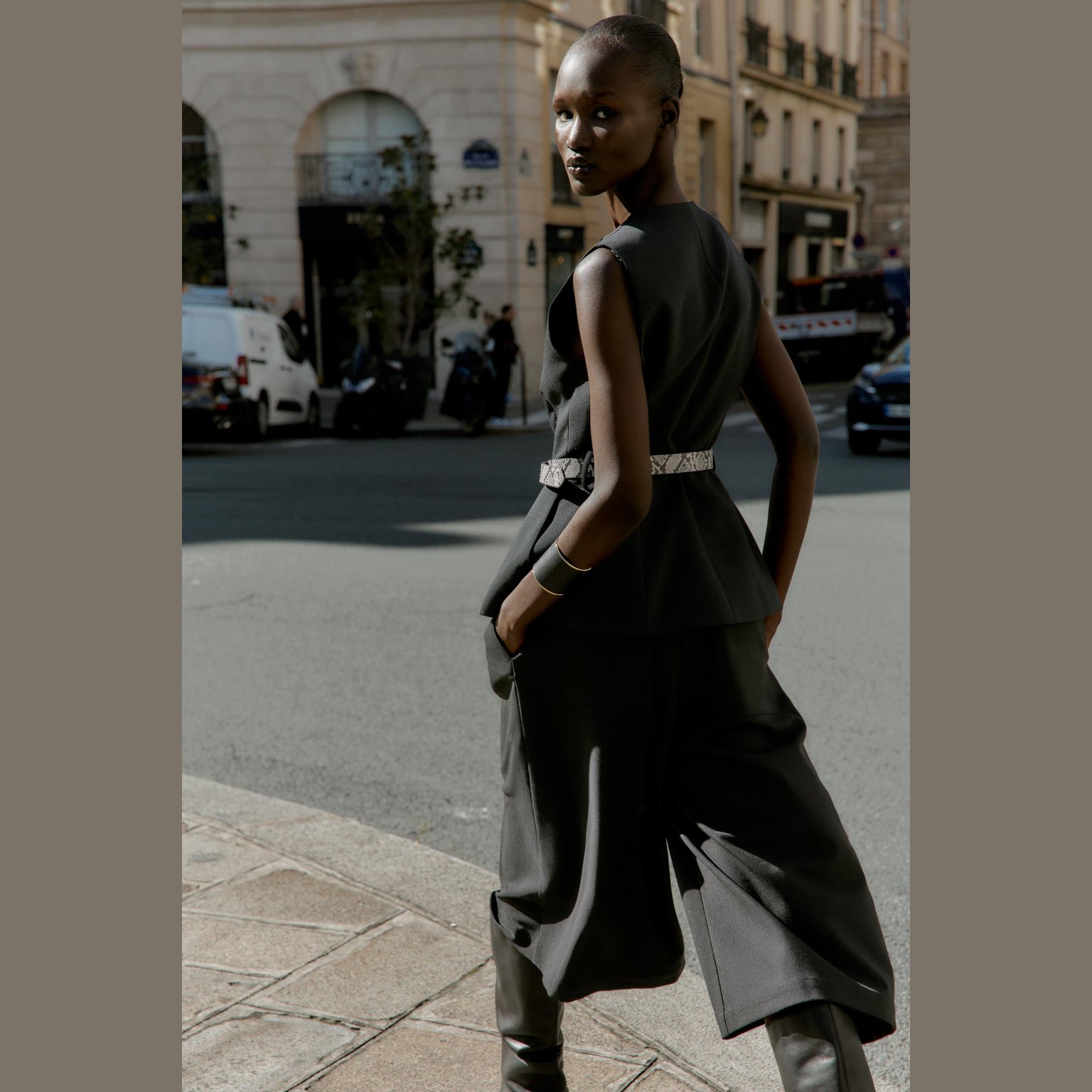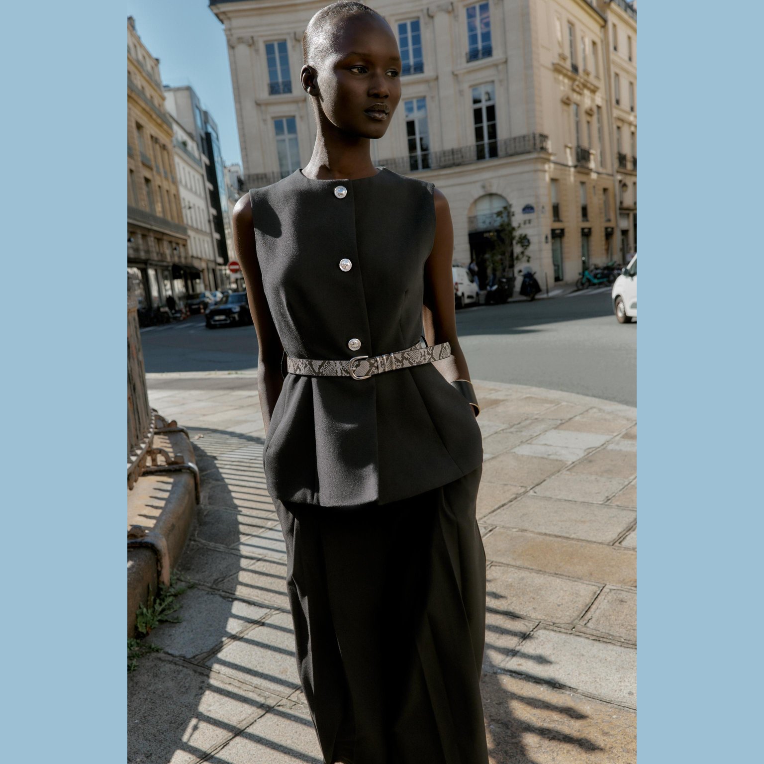فيست أنيق بلون أسود طبيعي، مصنوع من خامة ممزوجة تمنح مظهرًا عصريًا وملمسًا عمليًا، مع بطانة داخلية من البوليستر لراحة إضافية. يتميز برقبة مستديرة بلا أكمام، مع جيوب أمامية، وحزام مطابق من نفس القماش لإبراز الخصر، وإغلاق أمامي بأزرار. تصميم مثالي للإطلالات الرسمية أو الكاجوال الأنيقة.
