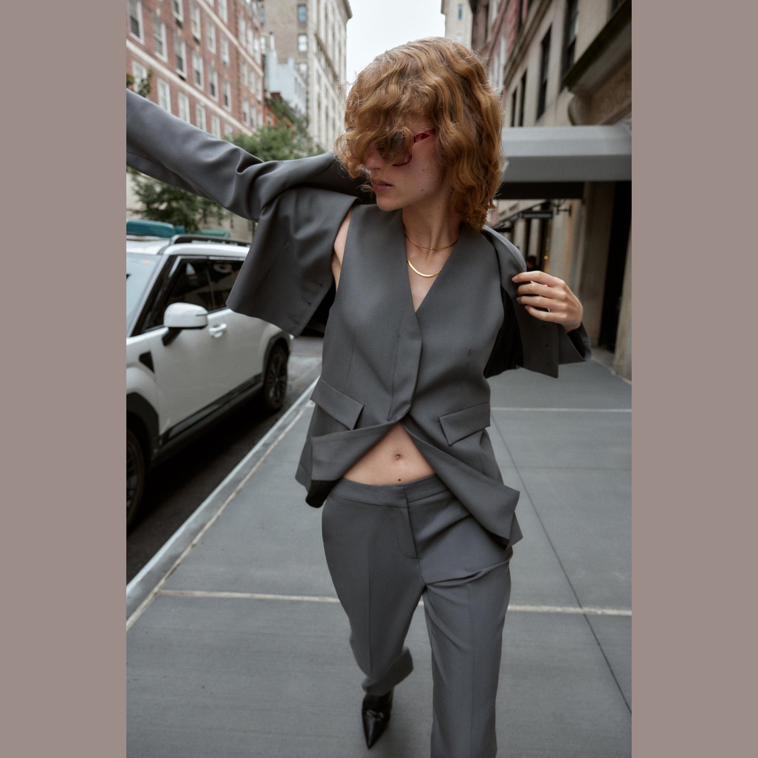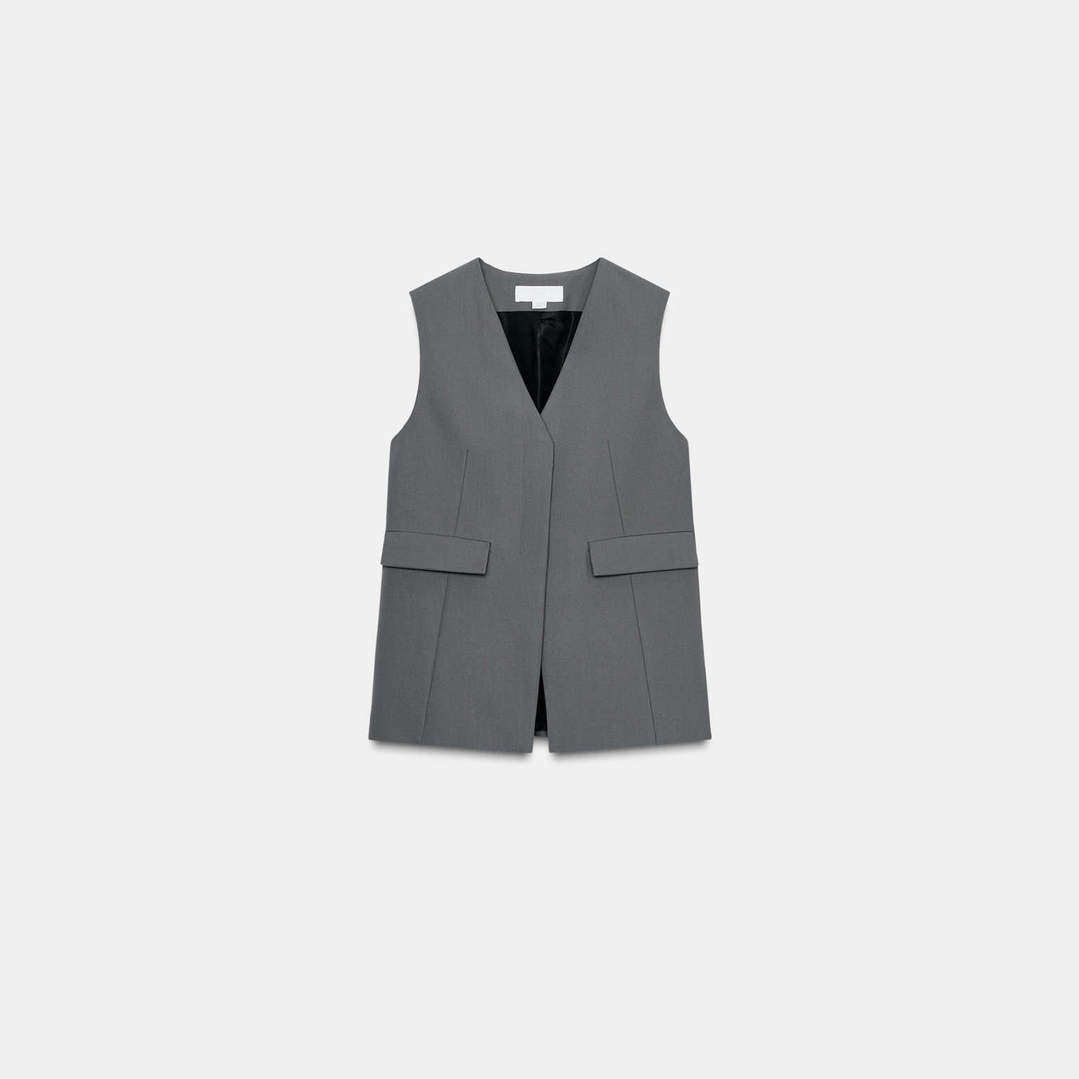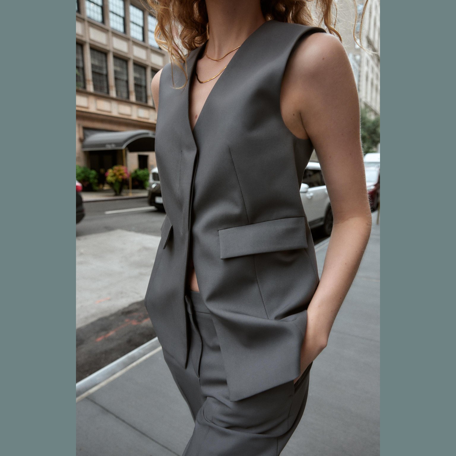 فيست أنيق طويل بلون رمادي طبيعي، مصنوع من خامة ممزوجة تمنح مظهرًا عصريًا وملمسًا عمليًا، مع بطانة داخلية من الأسيتات لراحة إضافية. يتميز بياقة V بلا أكمام، مع جيوب أمامية بغطاء، وإغلاق أمامي مزدوج الأزرار مخفي، وحاشية مستقيمة. تصميم مثالي للإطلالات الرسمية أو الكاجوال الأنيقة.