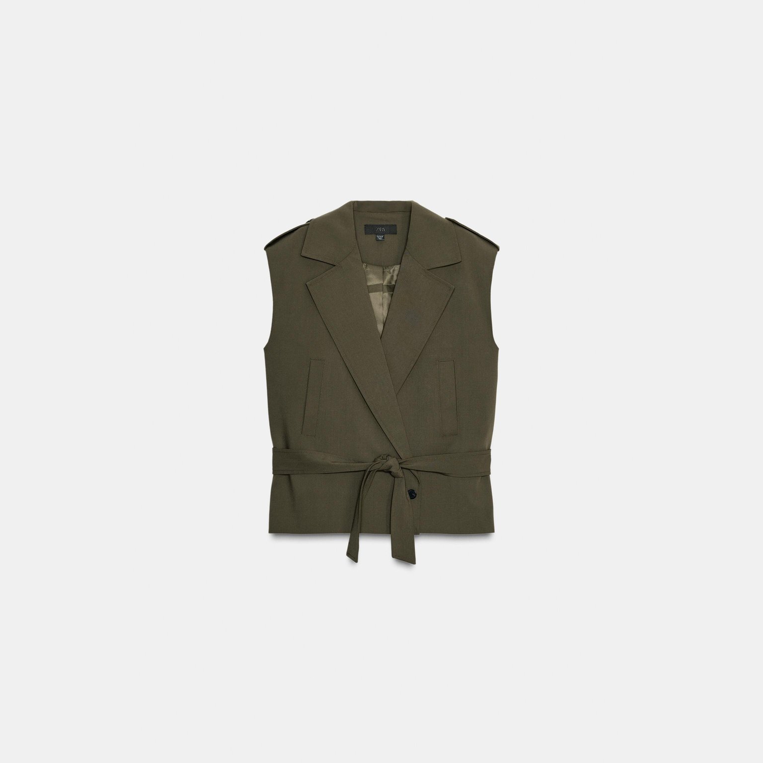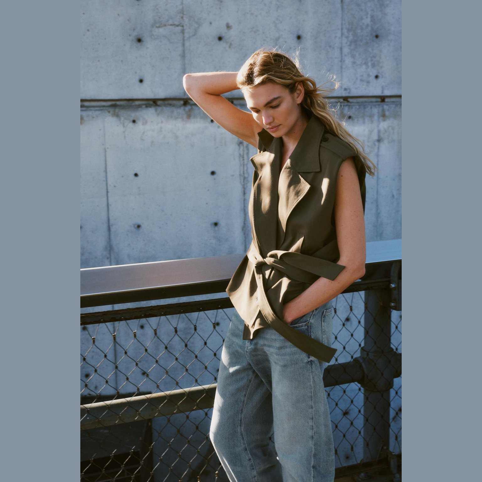 فيست أنيق بلون رمادي تاوپ طبيعي، مصنوع من خامة ممزوجة تمنح مظهرًا عصريًا وملمسًا عمليًا، مع بطانة داخلية من البوليستر لراحة إضافية. يتميز بياقة عريضة على شكل V، تصميم بلا أكمام مع أكتاف بارزة، وحزام مطابق من نفس القماش لإبراز الخصر، وإغلاق أمامي مزدوج الأزرار. تصميم مثالي للإطلالات الرسمية أو الكاجوال الأنيقة.