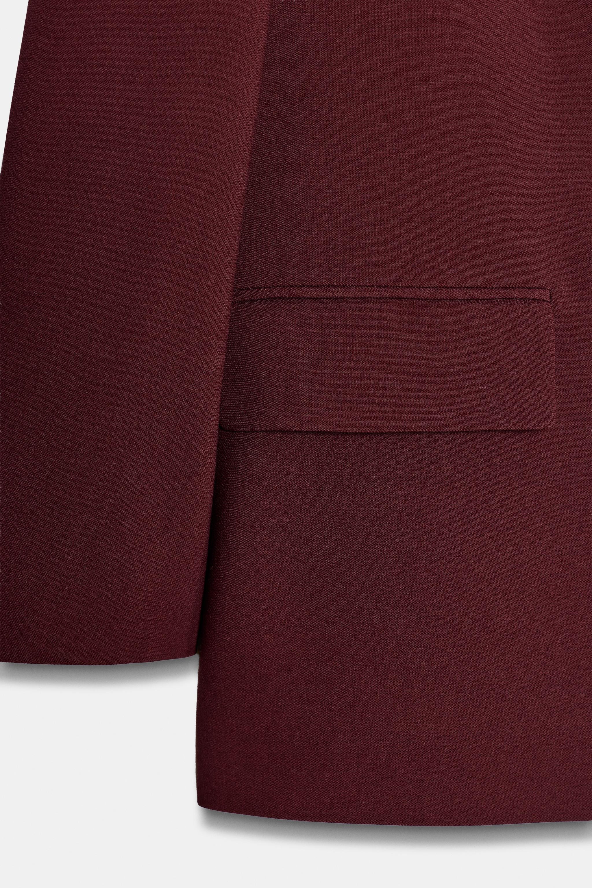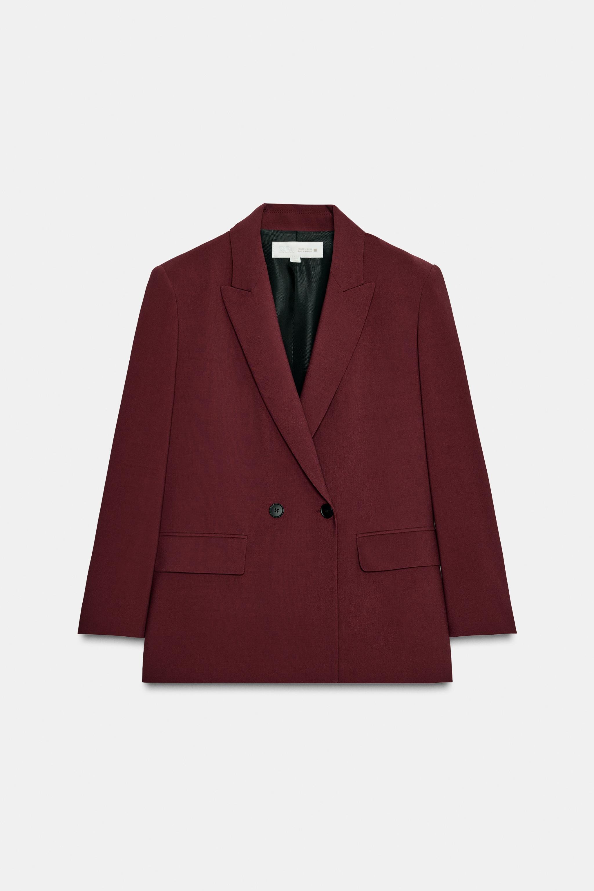 بليزر أنيق أوفرسايز بلون برغندي طبيعي مع خطوط طولية رفيعة (Pinstripes)، مصنوع من خامة ممزوجة تمنح مظهرًا عصريًا وملمسًا عمليًا، مع بطانة داخلية من البوليستر لراحة إضافية. يتميز بياقة عريضة، أكمام طويلة مع أكتاف بارزة، وجيوب أمامية بغطاء، وإغلاق أمامي مزدوج الأزرار. تصميم مثالي للإطلالات الرسمية أو الكاجوال الأنيقة.