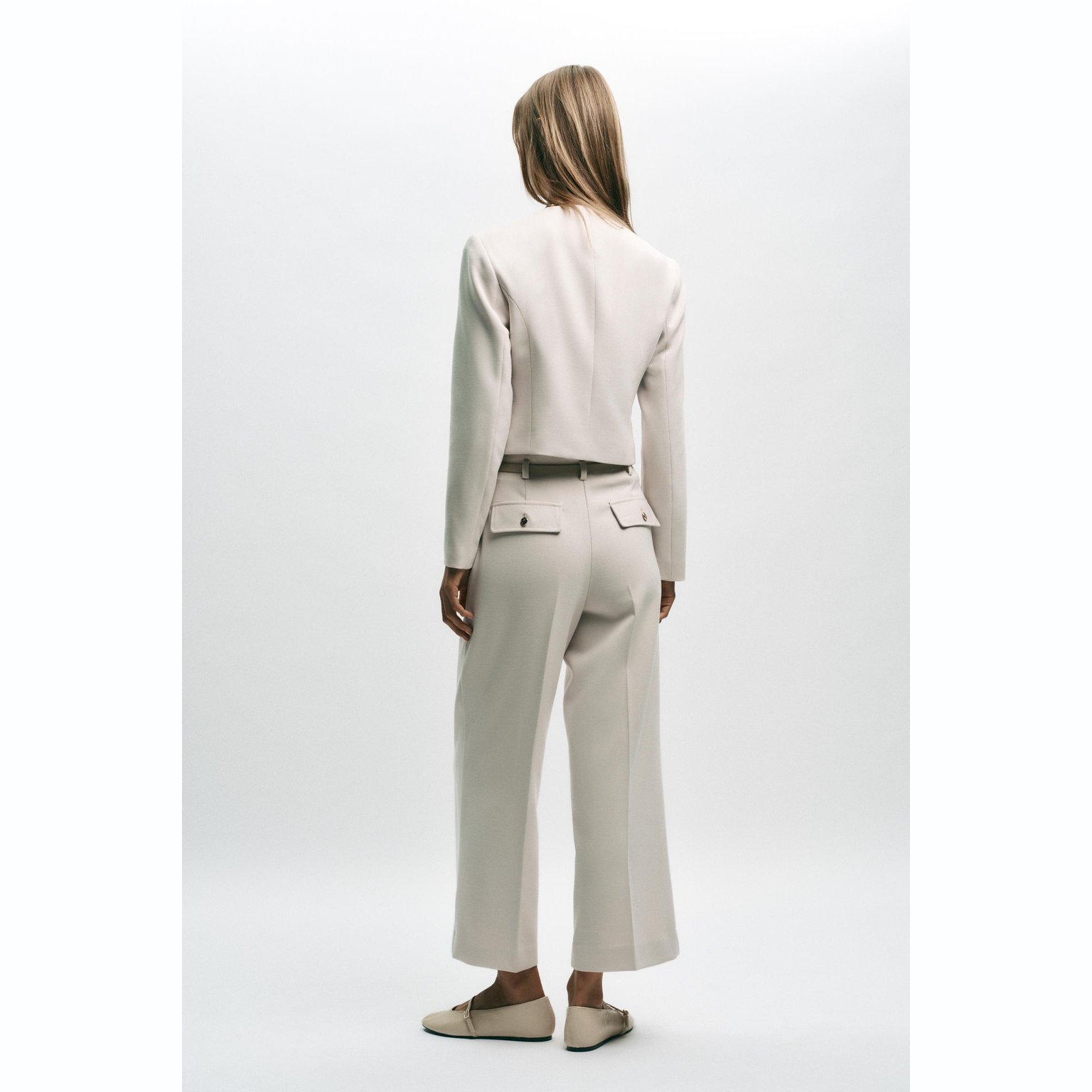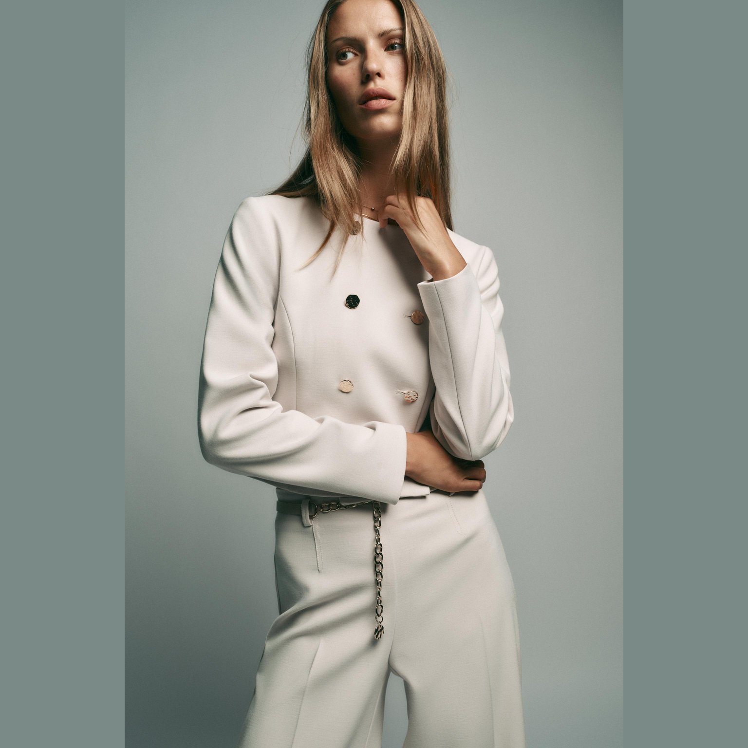 بليزر أنيق قصير بلون أوف وايت طبيعي، مصنوع من خامة ممزوجة تمنح مظهرًا عصريًا وملمسًا عمليًا، مع بطانة داخلية من البوليستر لراحة إضافية. يتميز برقبة مستديرة وأكمام طويلة، مع جيوب أمامية وهمية، وإغلاق أمامي مزدوج الأزرار. تصميم مثالي للإطلالات الرسمية أو الكاجوال الأنيقة.