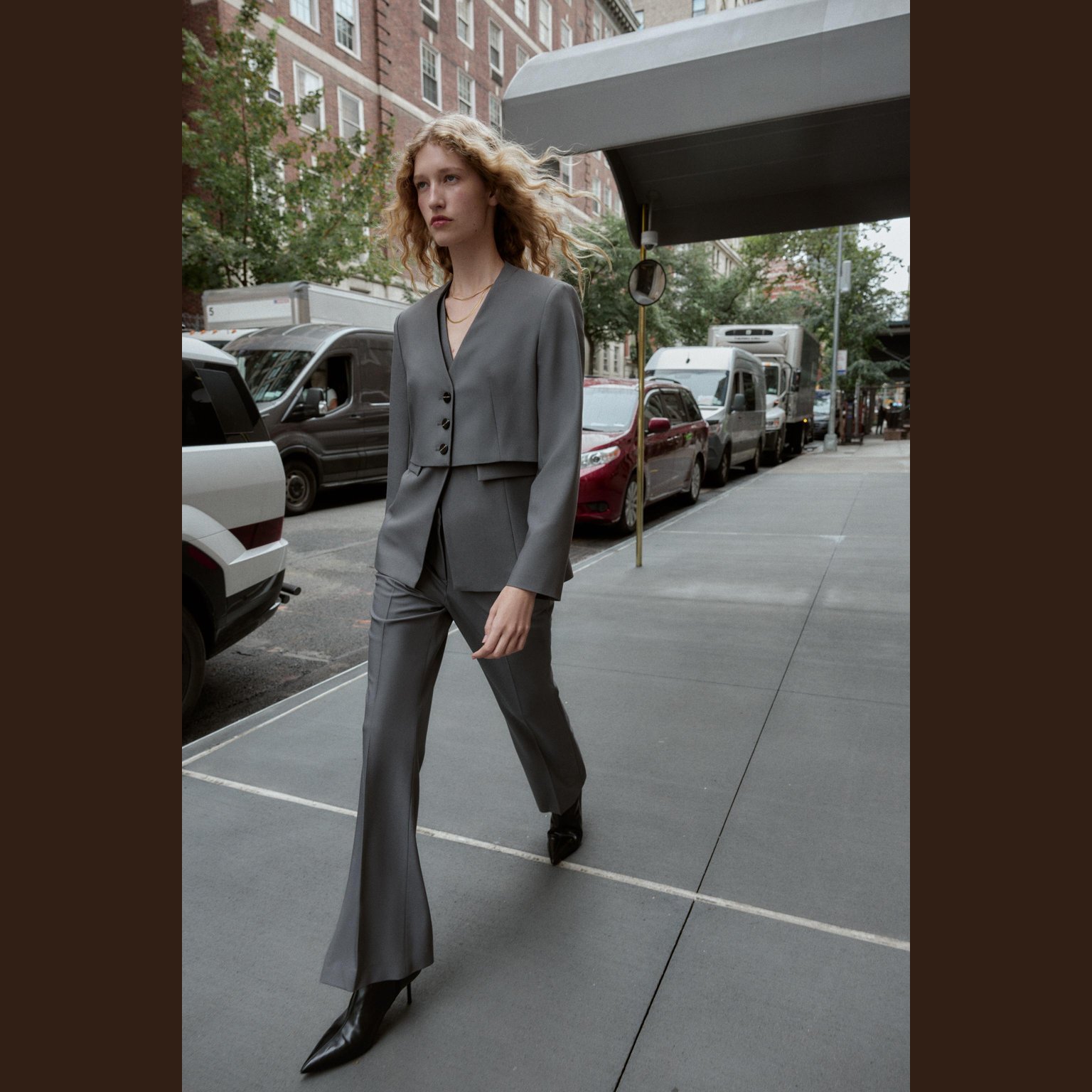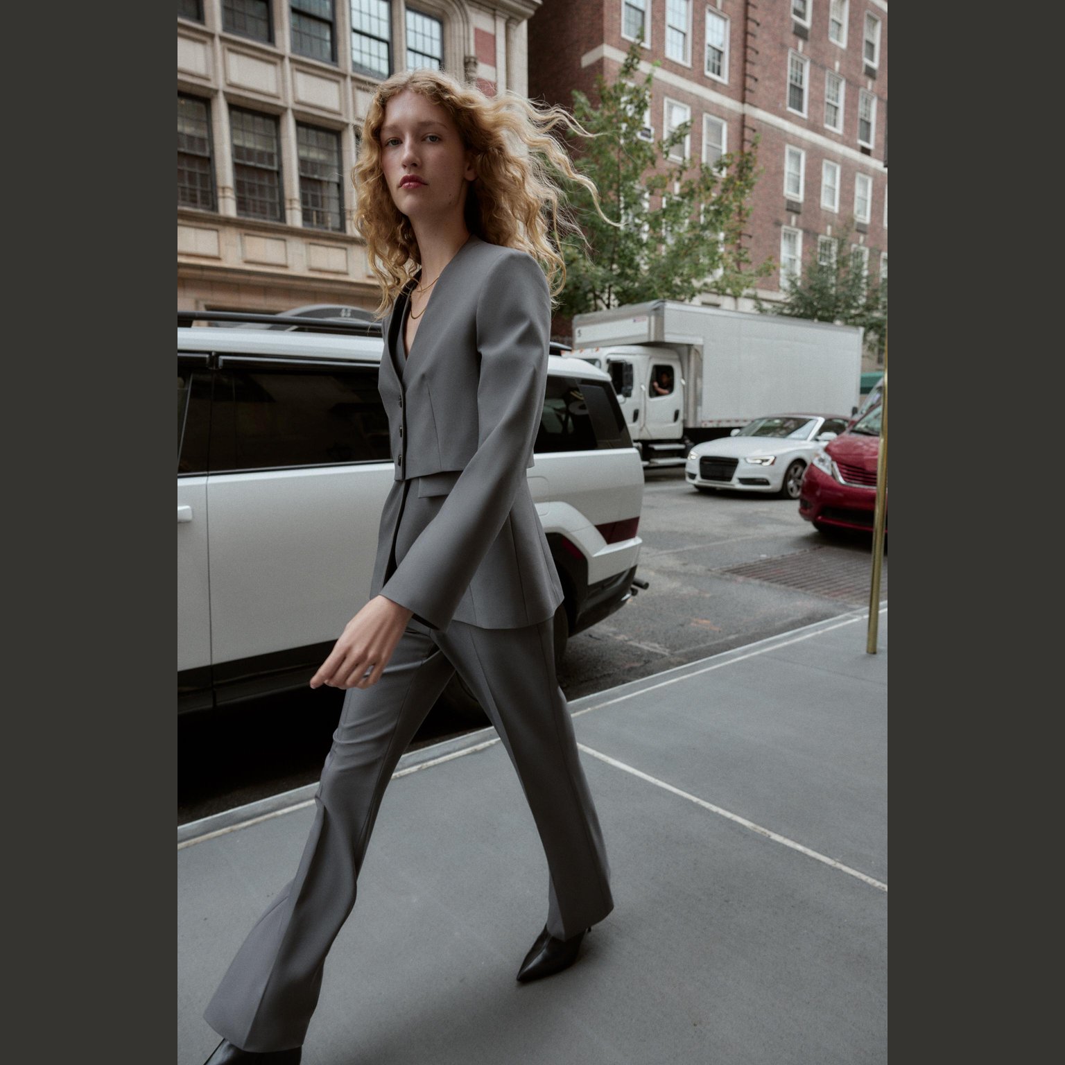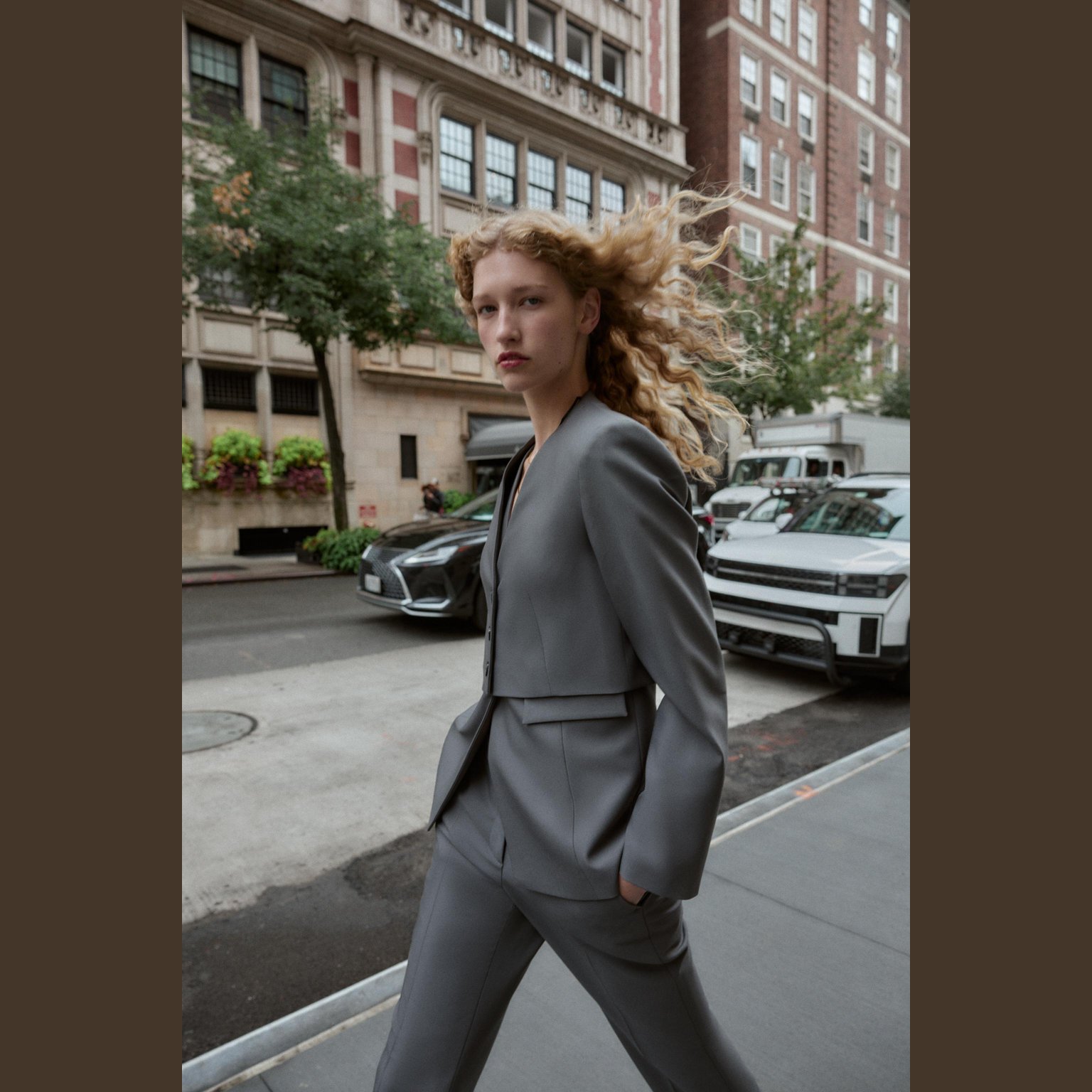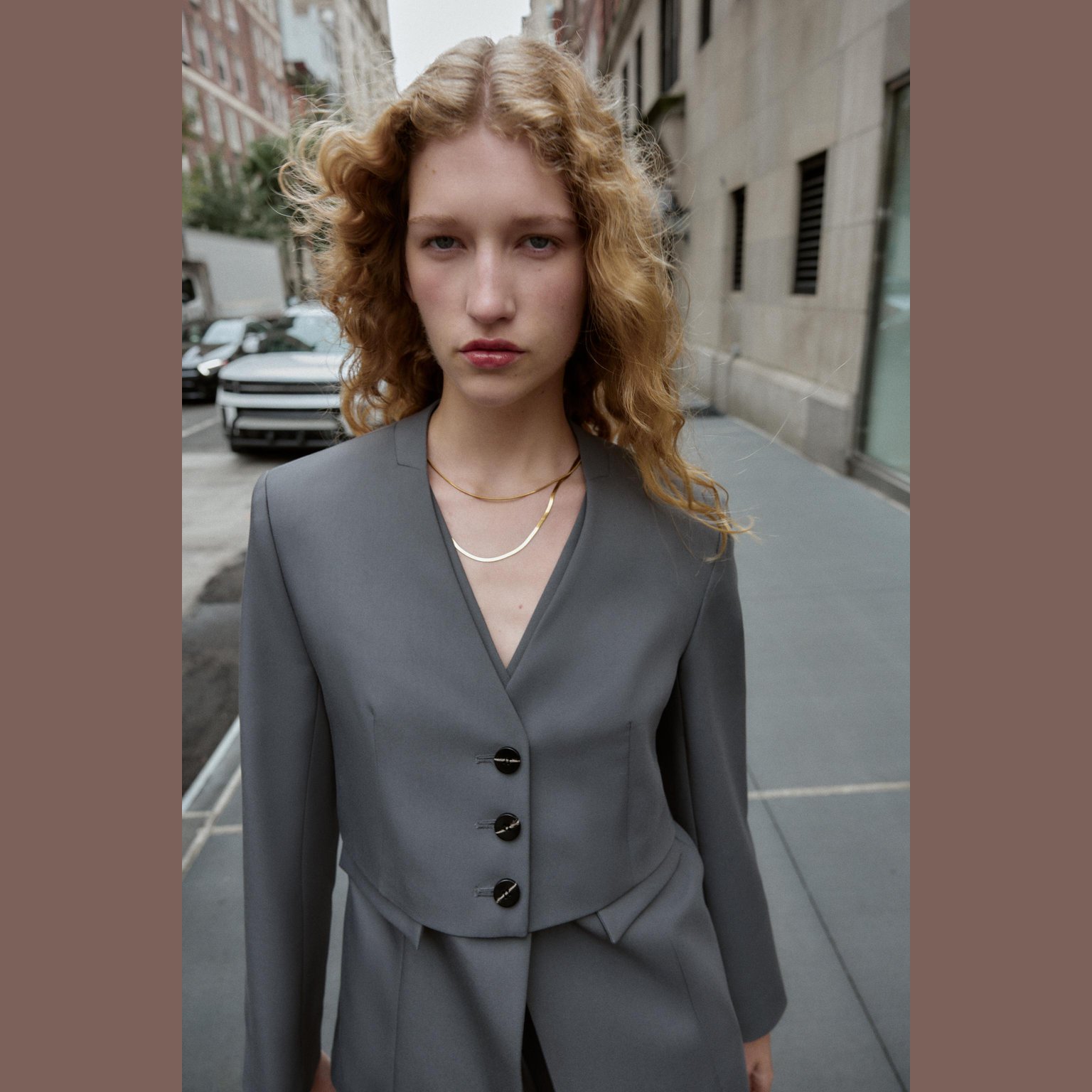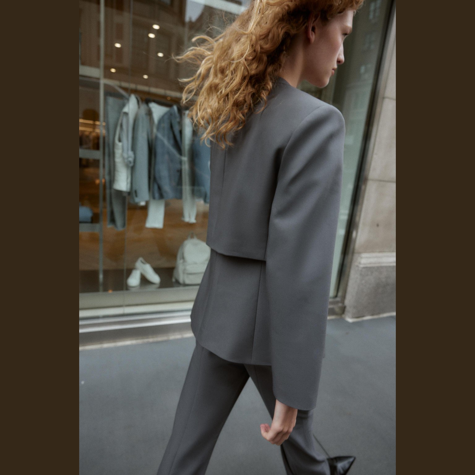 بليزر أنيق قصير بلا ياقة بلون رمادي طبيعي، مصنوع من خامة ممزوجة تمنح مظهرًا عصريًا وملمسًا عمليًا، مع بطانة داخلية من الأسيتات لراحة إضافية. يتميز بأكمام طويلة مع أكتاف بارزة، وإغلاق أمامي بزر واحد. تصميم مثالي للإطلالات الرسمية أو الكاجوال الأنيقة.