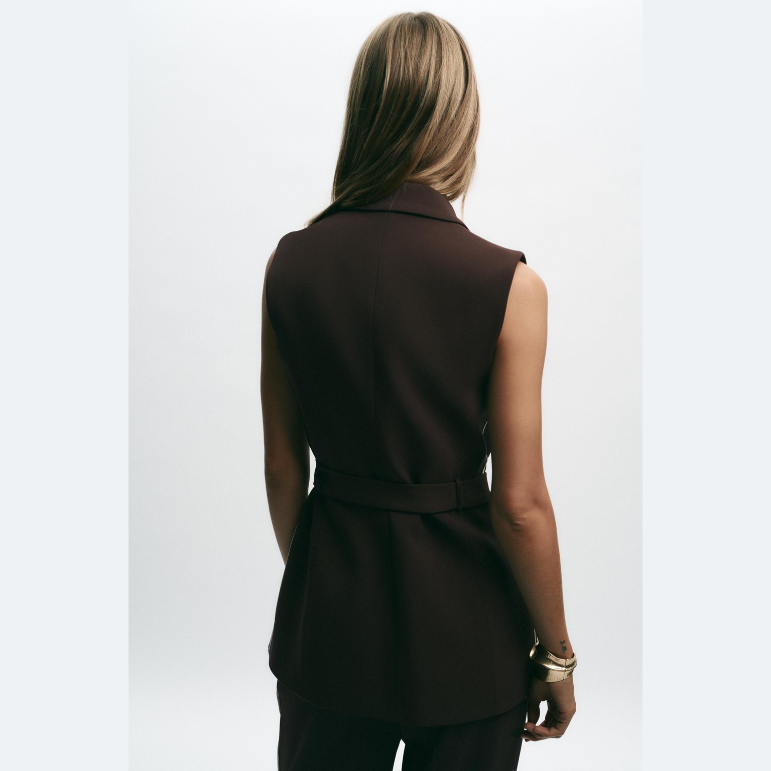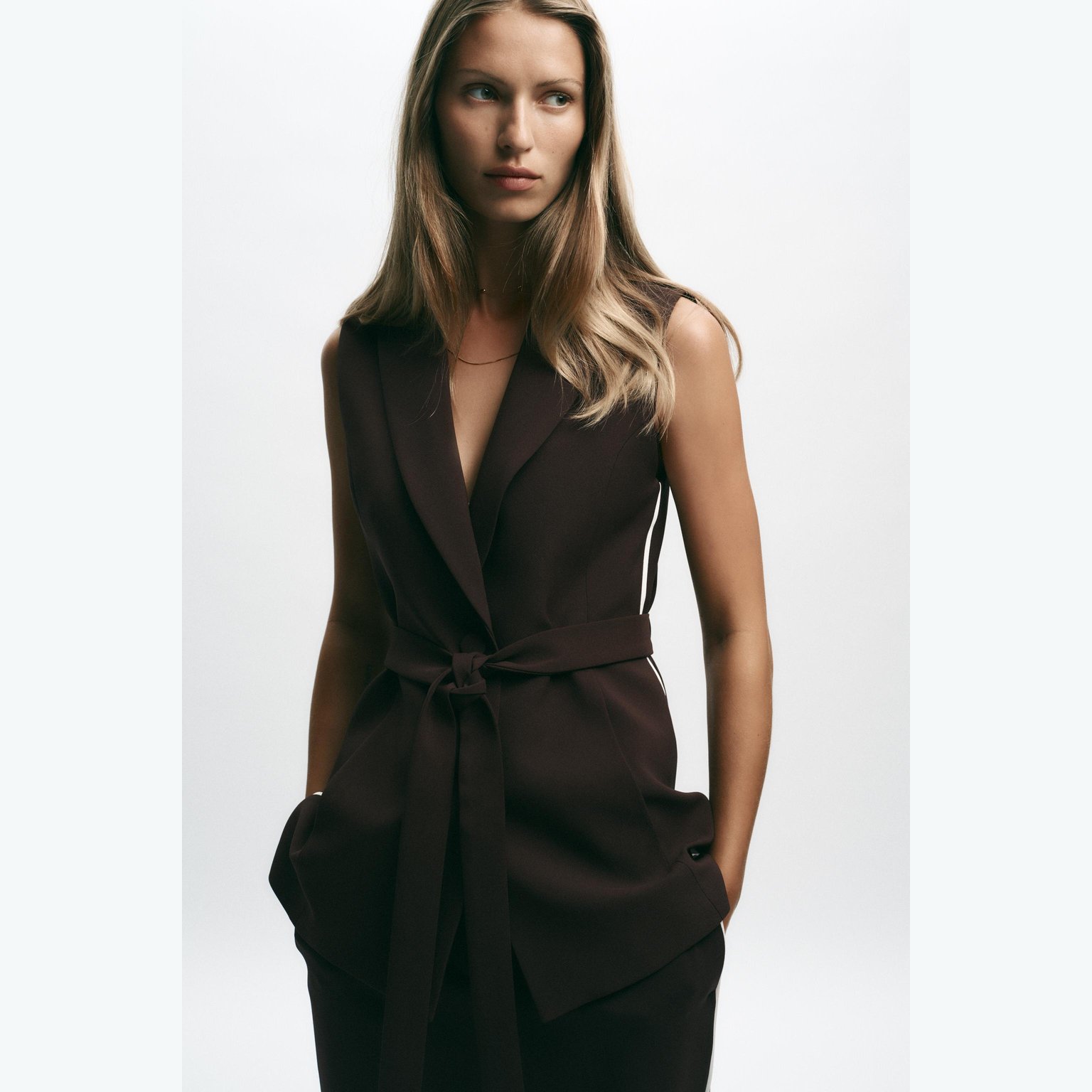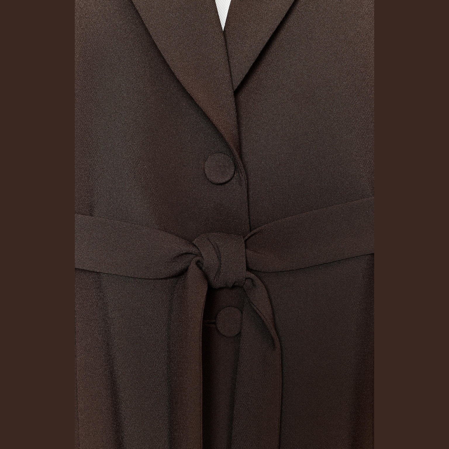 فيست طويل أنيق بلون بني طبيعي، مصنوع من خامة ممزوجة تمنح مظهرًا عصريًا وملمسًا عمليًا، مع بطانة داخلية من الأسيتات لراحة إضافية. يتميز بياقة عريضة على شكل V، جيوب أمامية مخفية في الخياطة، حزام مطابق من نفس القماش، وخط جانبي رفيع متباين، مع إغلاق أمامي بأزرار مغطاة. تصميم مثالي للإطلالات الرسمية أو الكاجوال الأنيقة.