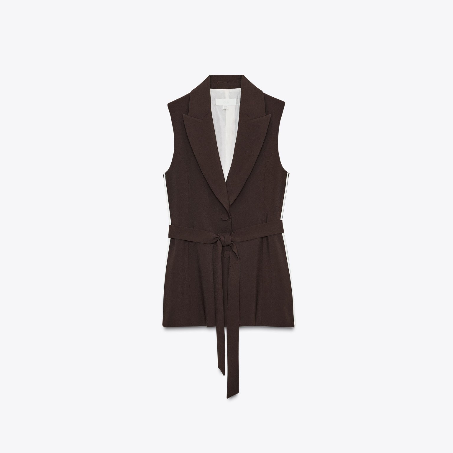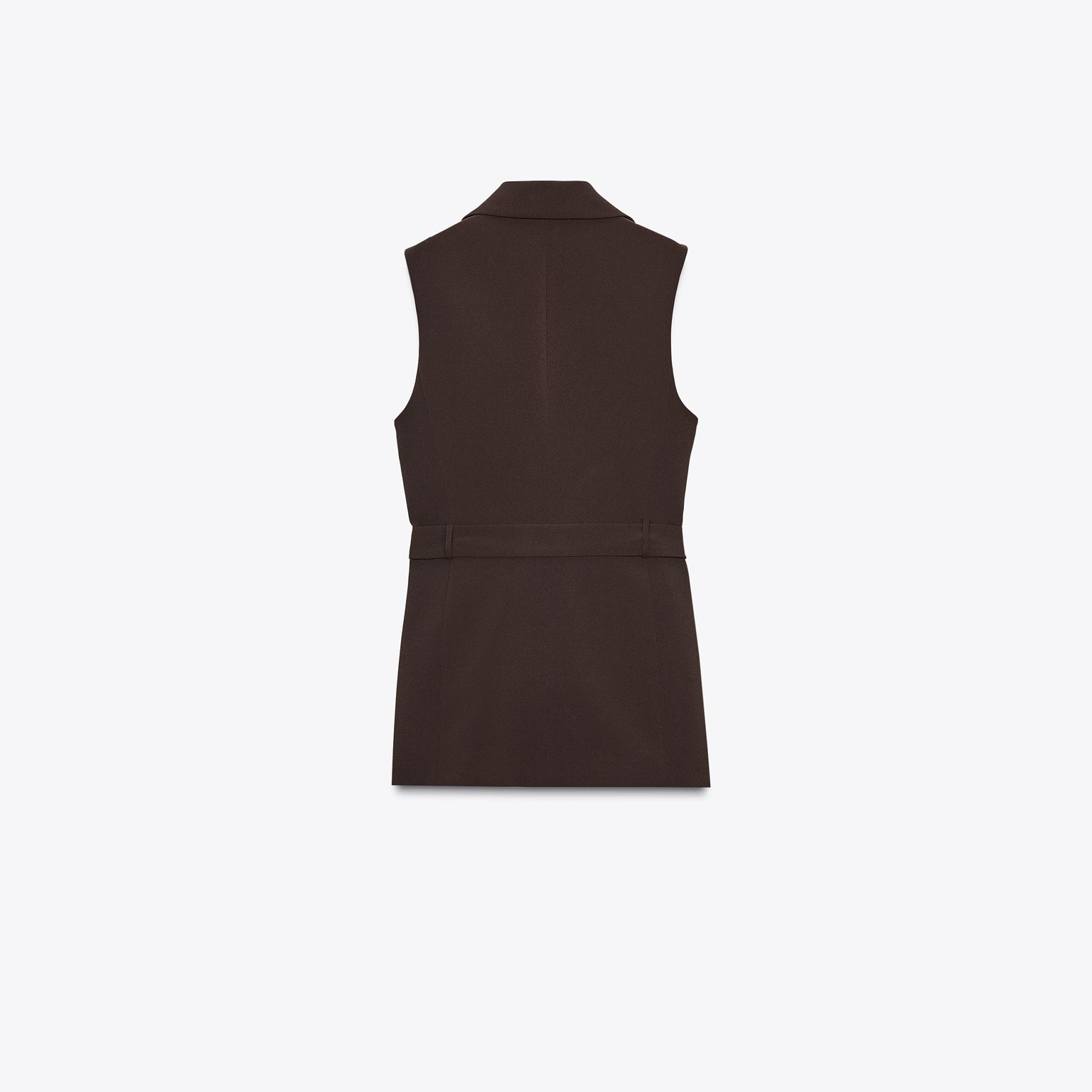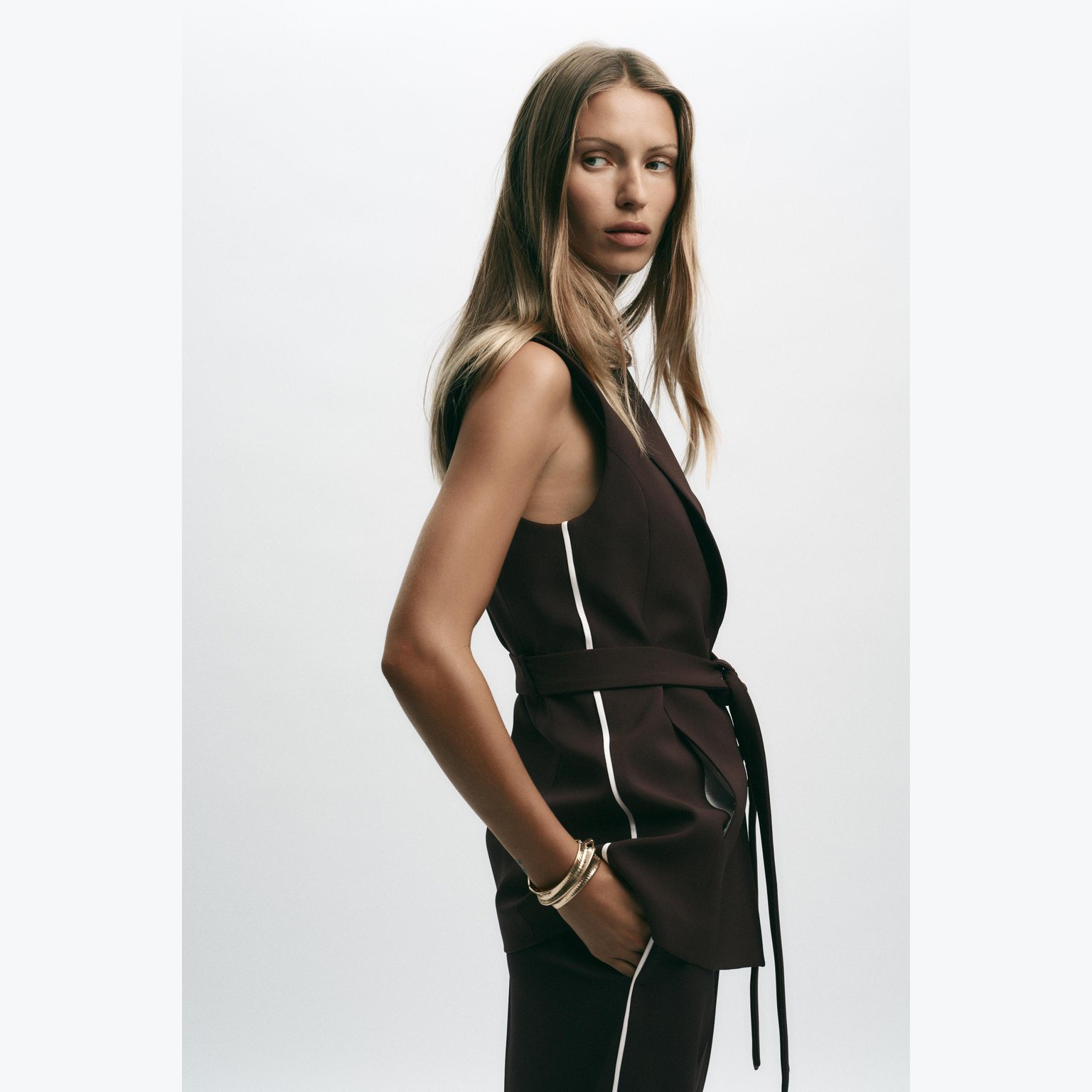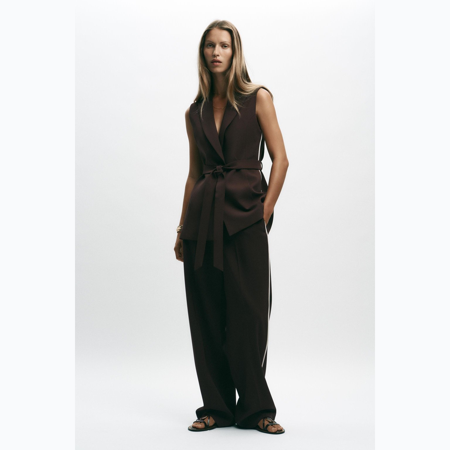 فيست طويل أنيق بلون بني طبيعي، مصنوع من خامة ممزوجة تمنح مظهرًا عصريًا وملمسًا عمليًا، مع بطانة داخلية من الأسيتات لراحة إضافية. يتميز بياقة عريضة على شكل V، جيوب أمامية مخفية في الخياطة، حزام مطابق من نفس القماش، وخط جانبي رفيع متباين، مع إغلاق أمامي بأزرار مغطاة. تصميم مثالي للإطلالات الرسمية أو الكاجوال الأنيقة.