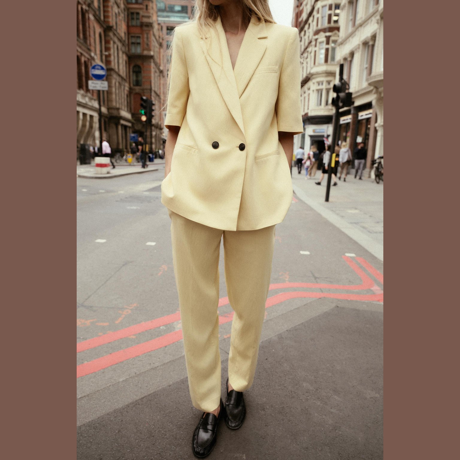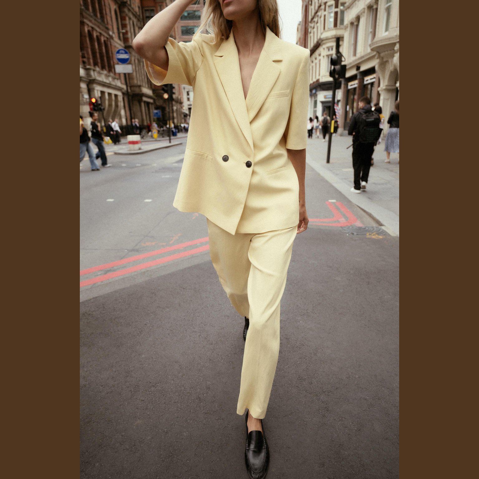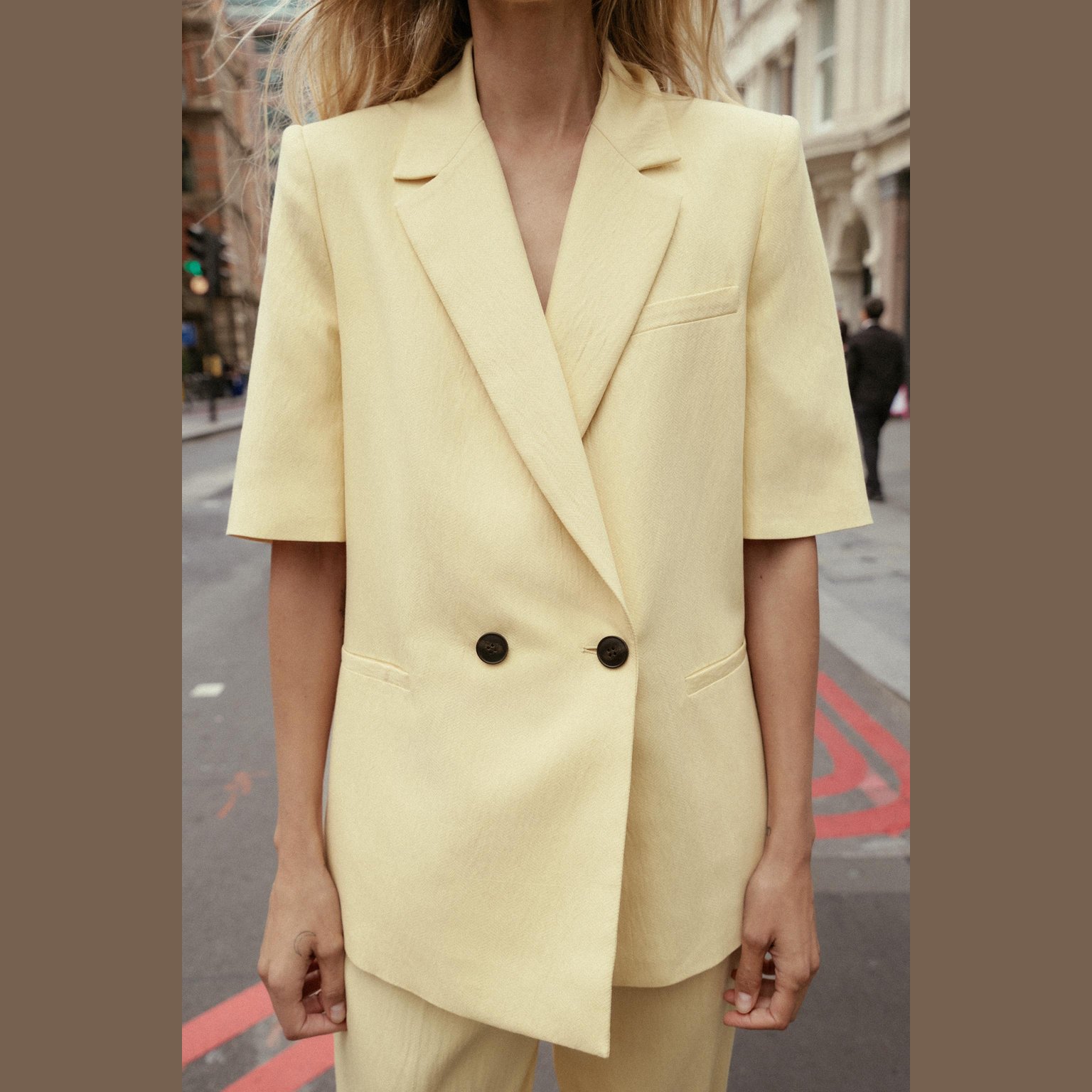 بليزر أنيق قصير الأكمام بلون أصفر فاتح طبيعي، مصنوع من خامة ممزوجة تمنح مظهرًا عصريًا وملمسًا عمليًا، مع بطانة داخلية من البوليستر لراحة إضافية. يتميز بياقة عريضة، أكتاف بارزة، أكمام قصيرة، وجيوب أمامية وهمية، مع إغلاق أمامي مزدوج الأزرار. تصميم مثالي للإطلالات الصيفية الرسمية أو الكاجوال الأنيقة.