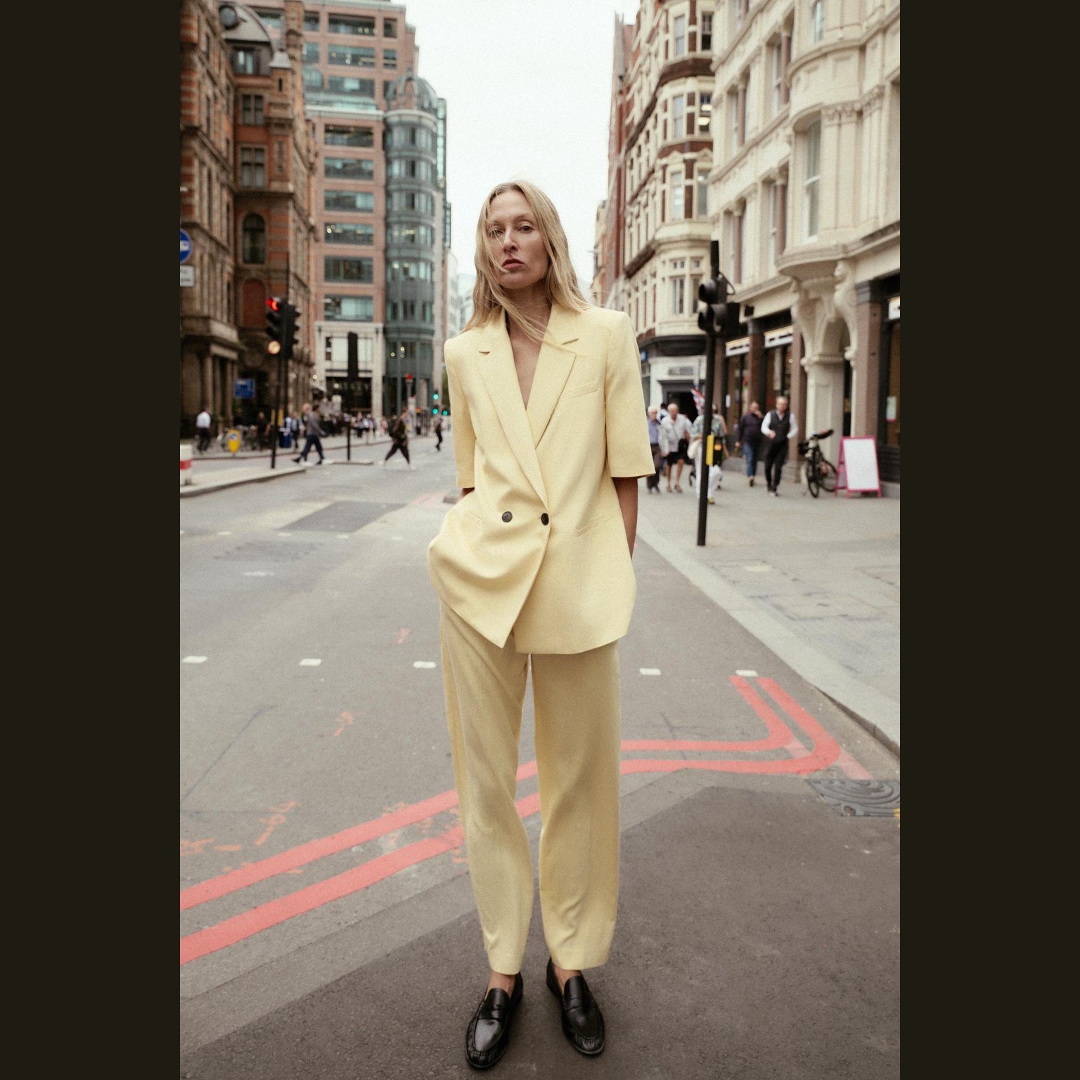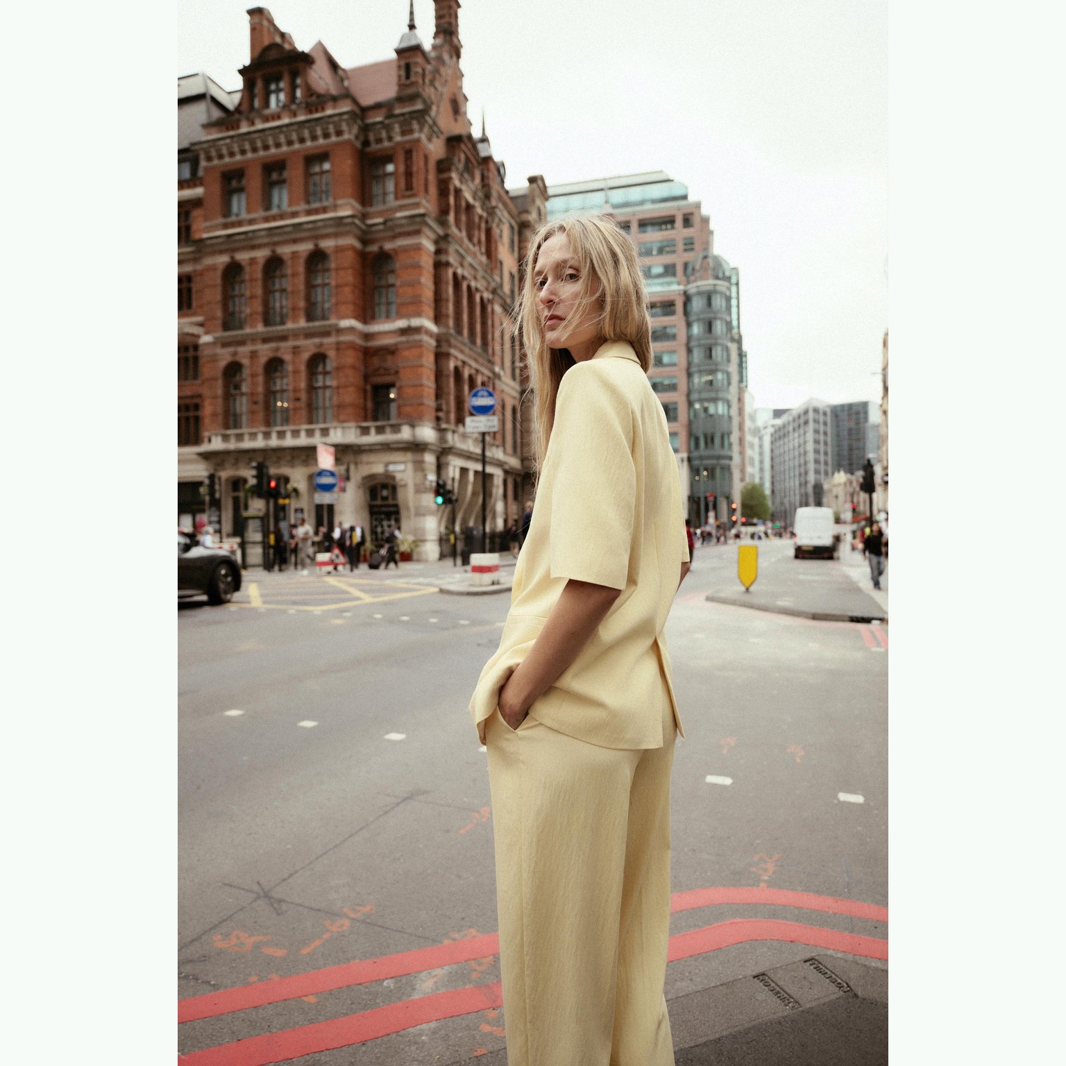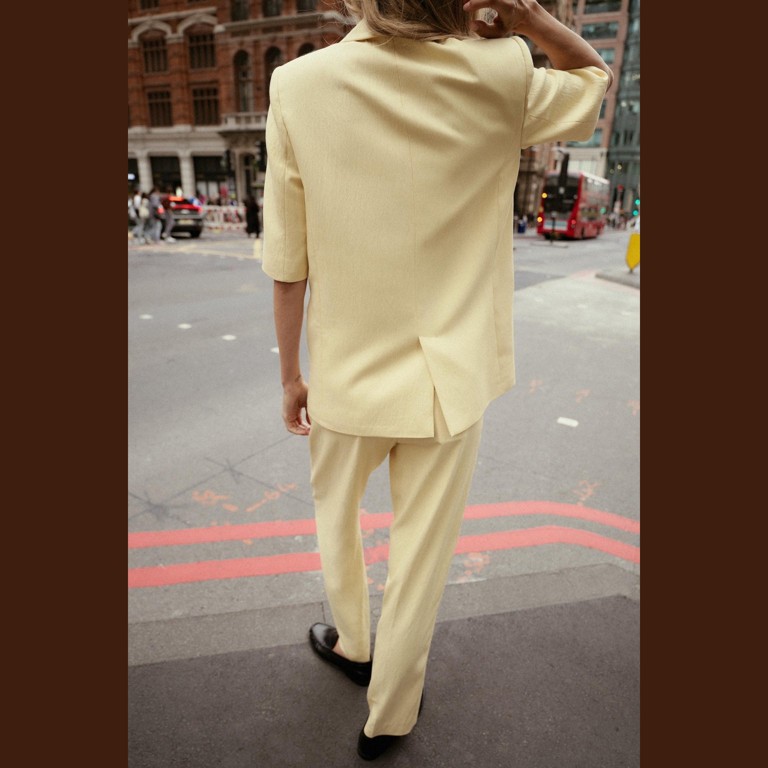 بليزر أنيق قصير الأكمام بلون أصفر فاتح طبيعي، مصنوع من خامة ممزوجة تمنح مظهرًا عصريًا وملمسًا عمليًا، مع بطانة داخلية من البوليستر لراحة إضافية. يتميز بياقة عريضة، أكتاف بارزة، أكمام قصيرة، وجيوب أمامية وهمية، مع إغلاق أمامي مزدوج الأزرار. تصميم مثالي للإطلالات الصيفية الرسمية أو الكاجوال الأنيقة.