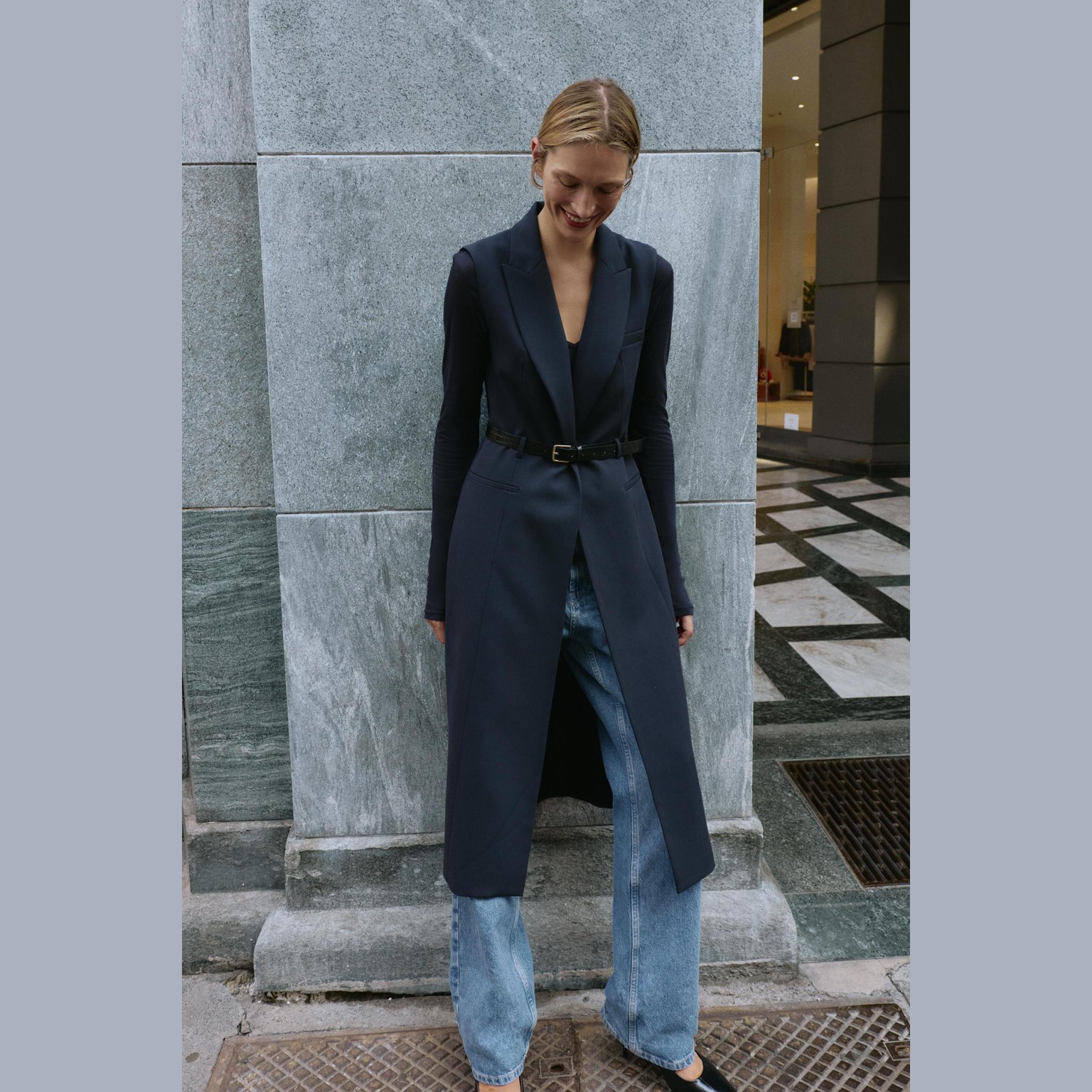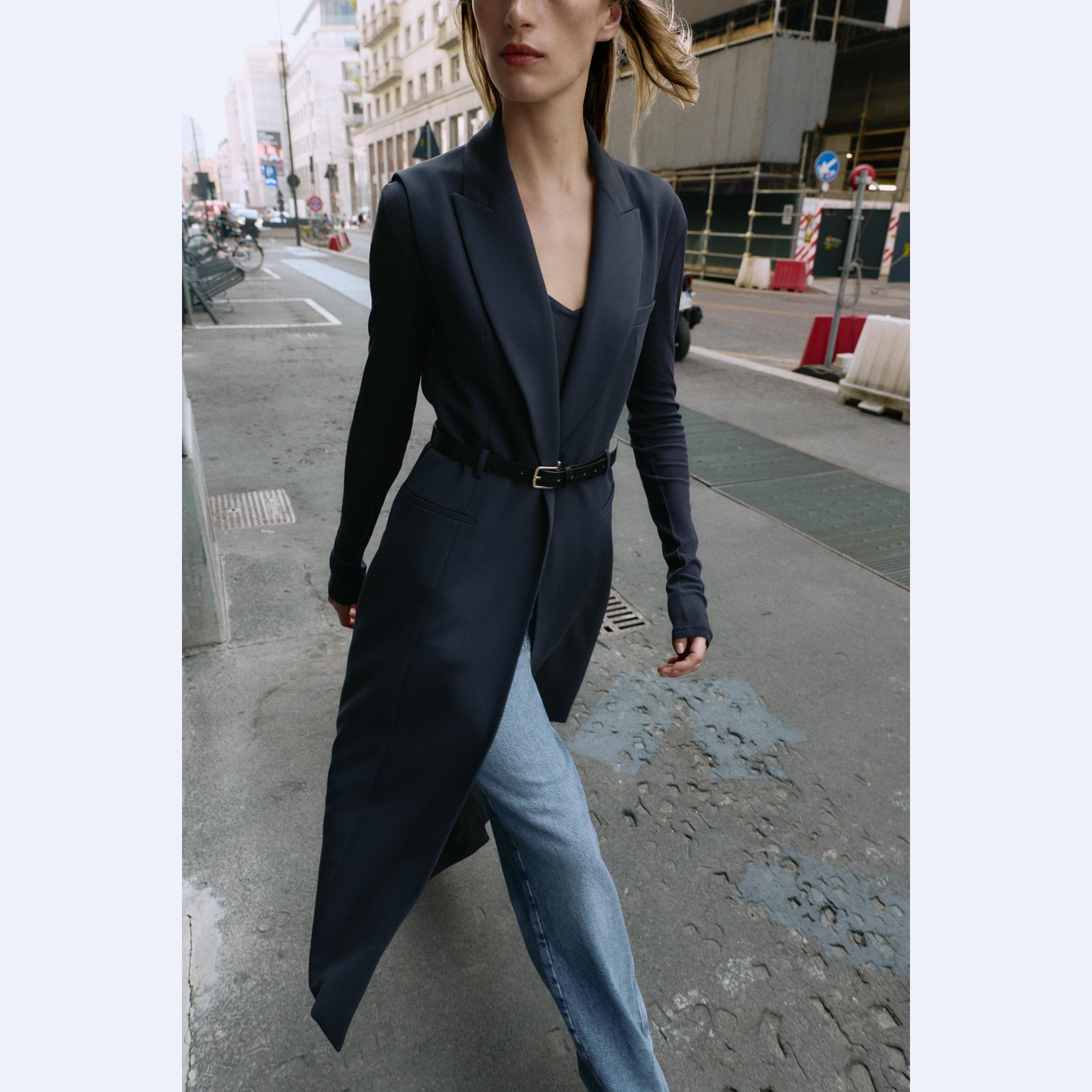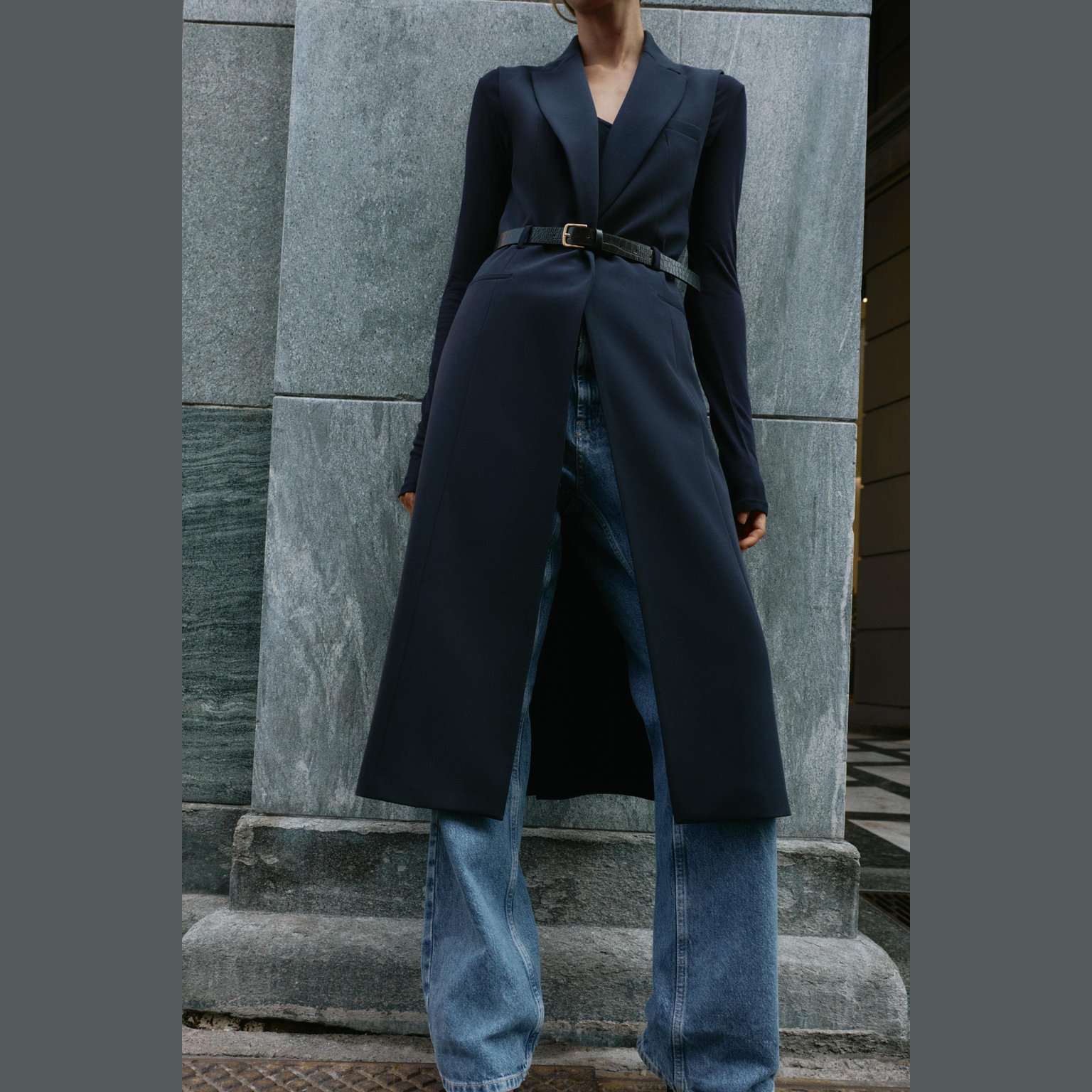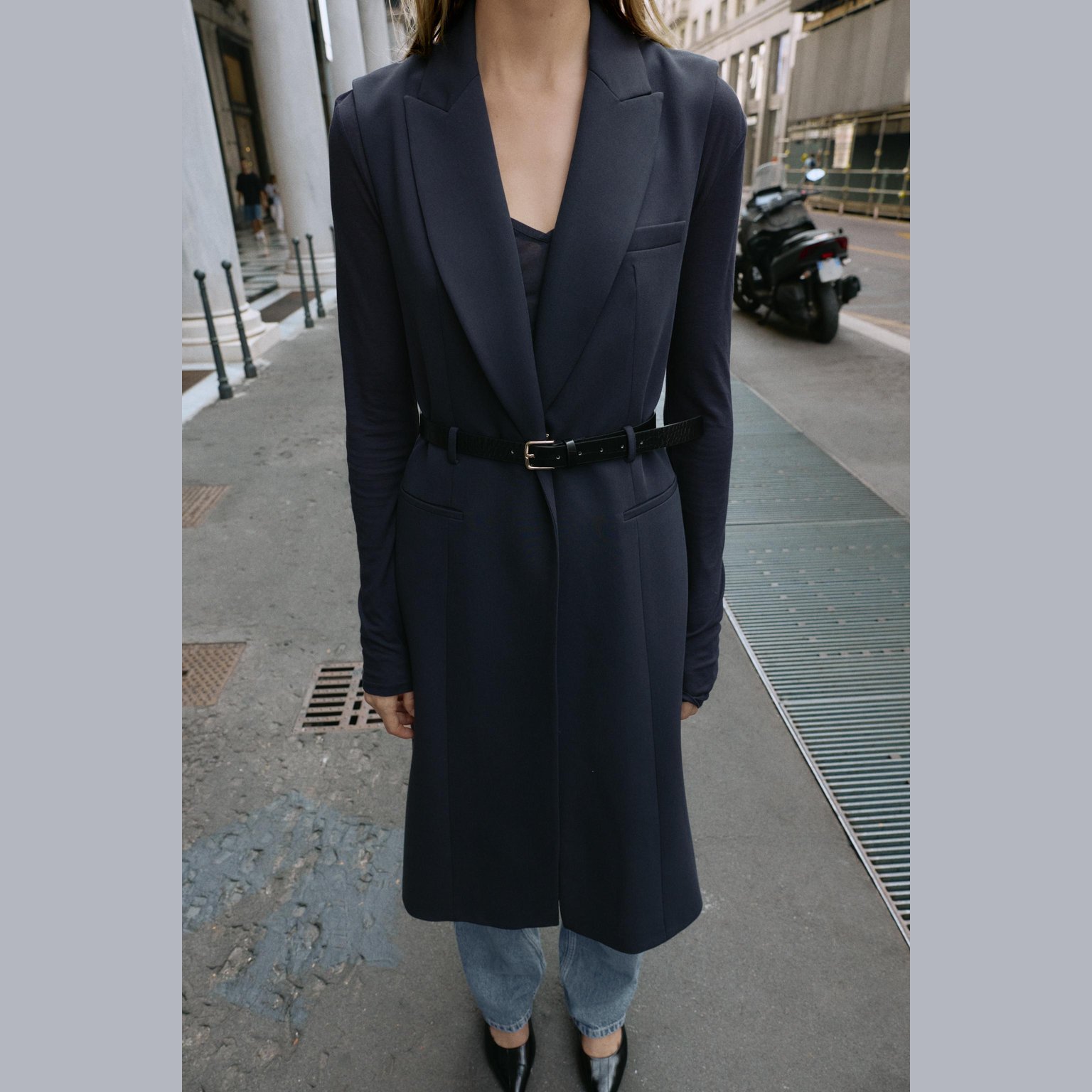 فيست طويل أنيق بلون كحلي طبيعي، مصنوع من خامة ممزوجة تمنح مظهرًا عصريًا وملمسًا عمليًا، مع بطانة داخلية من الأسيتات لراحة إضافية. يتميز بياقة عريضة بلا أكمام، جيوب أمامية مخفية في الخياطة، فتحة خلفية عند الحاشية، وحزام مطابق من نفس القماش، مع إغلاق أمامي بأزرار مخفية. تصميم مثالي للإطلالات الرسمية أو الكاجوال الأنيقة.