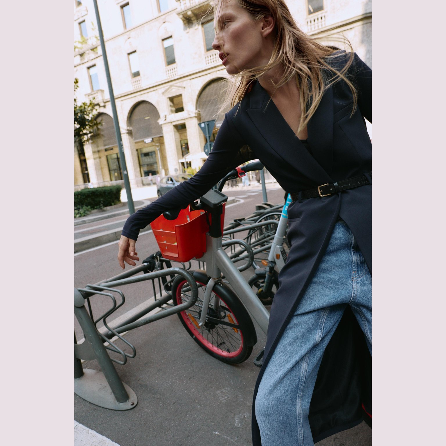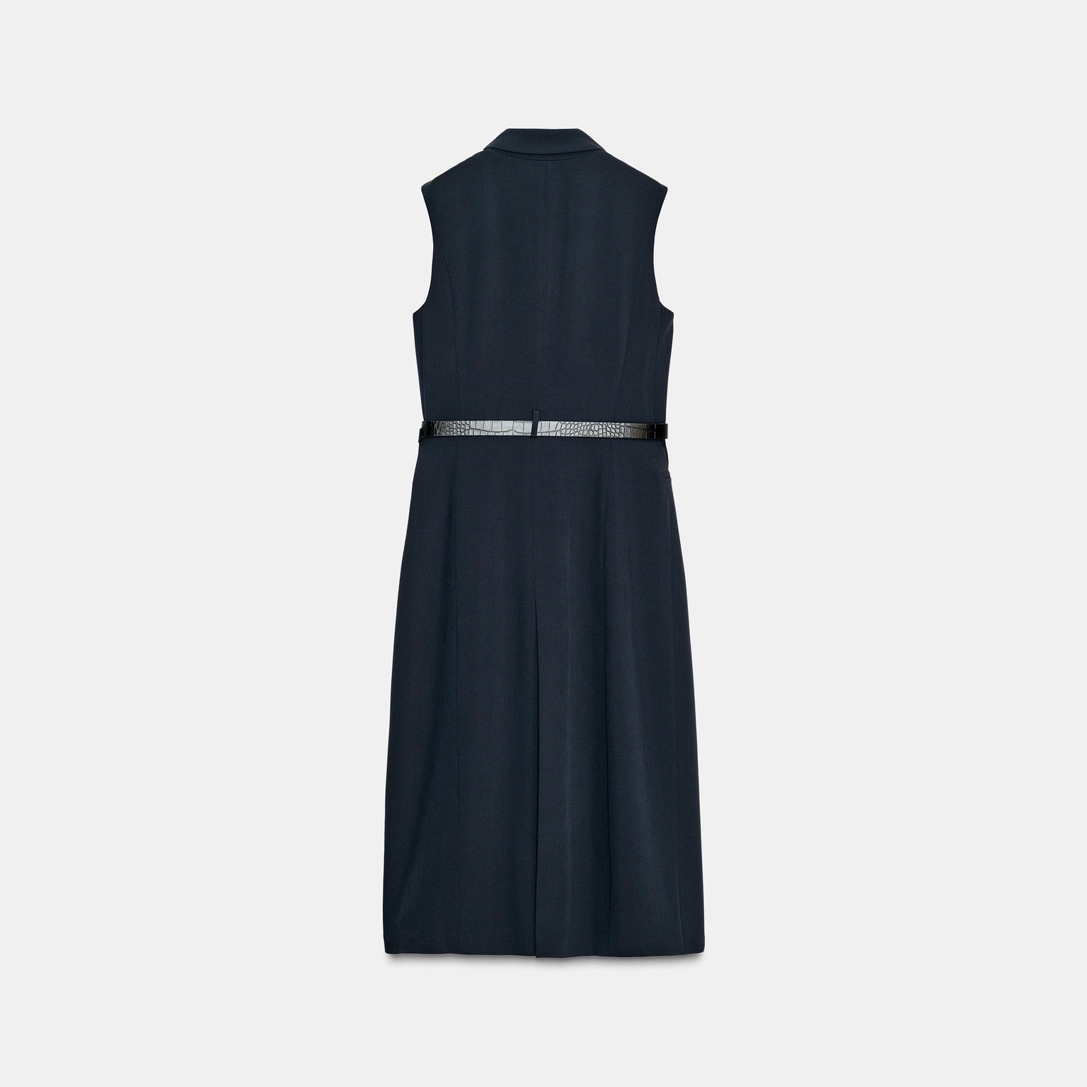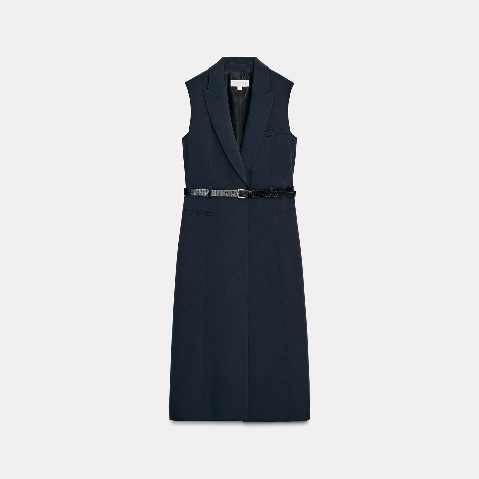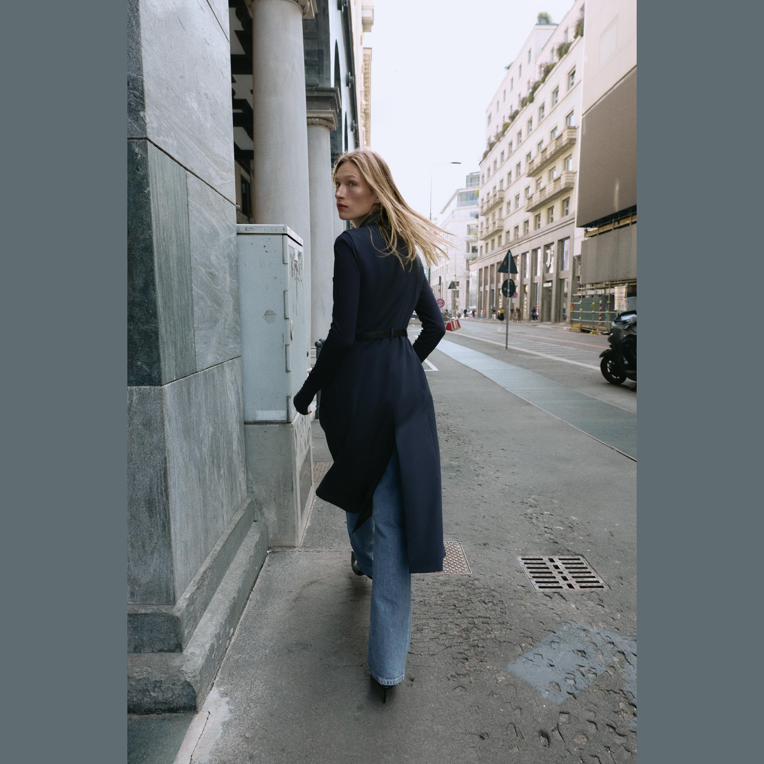 فيست طويل أنيق بلون كحلي طبيعي، مصنوع من خامة ممزوجة تمنح مظهرًا عصريًا وملمسًا عمليًا، مع بطانة داخلية من الأسيتات لراحة إضافية. يتميز بياقة عريضة بلا أكمام، جيوب أمامية مخفية في الخياطة، فتحة خلفية عند الحاشية، وحزام مطابق من نفس القماش، مع إغلاق أمامي بأزرار مخفية. تصميم مثالي للإطلالات الرسمية أو الكاجوال الأنيقة.