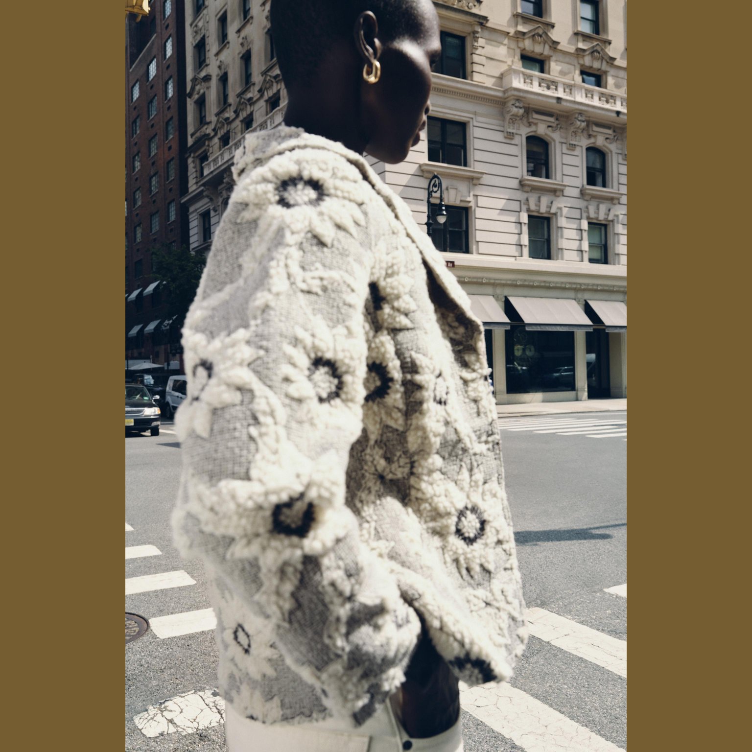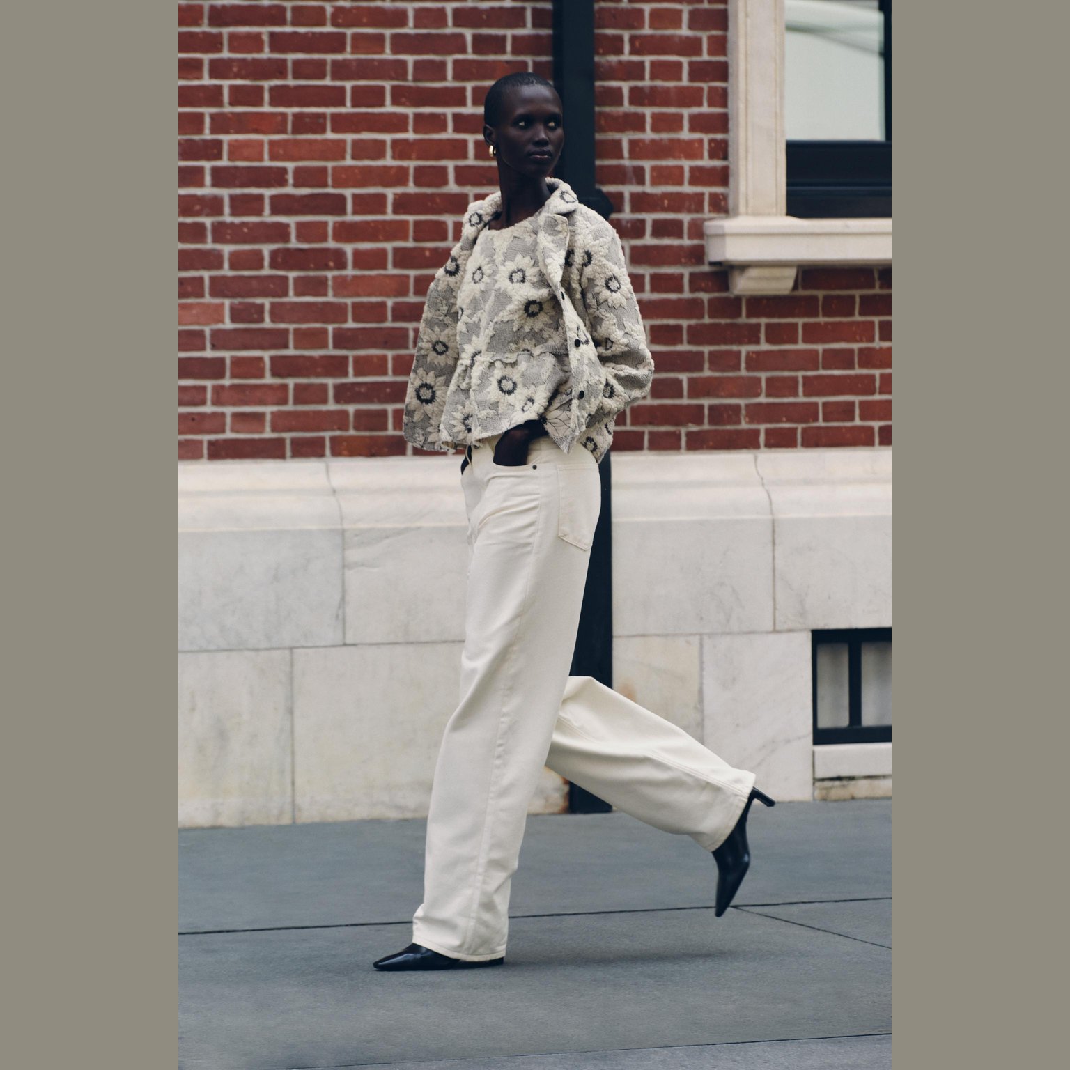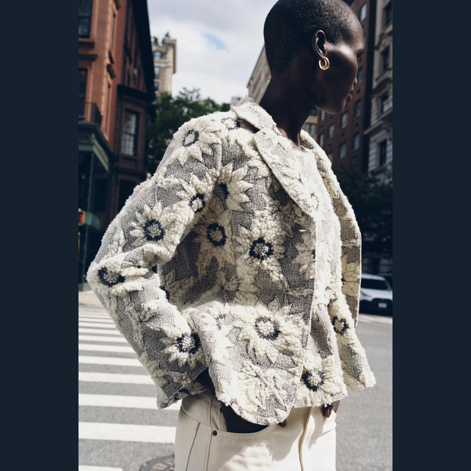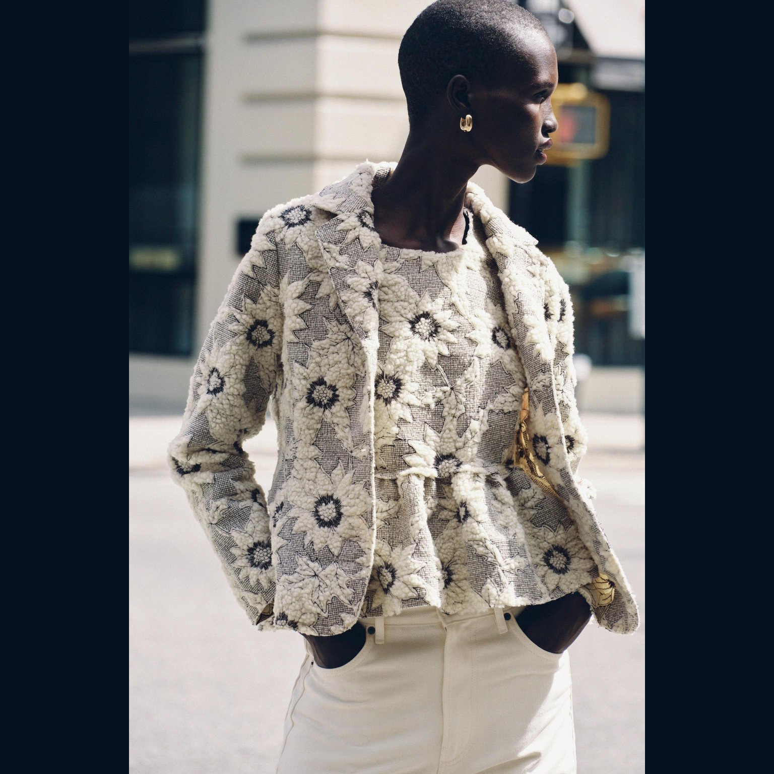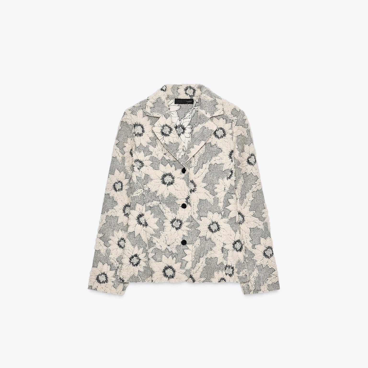 - التصميم: بليزر منسوج مزين بنقشة زهور (Floral Textured Blazer)