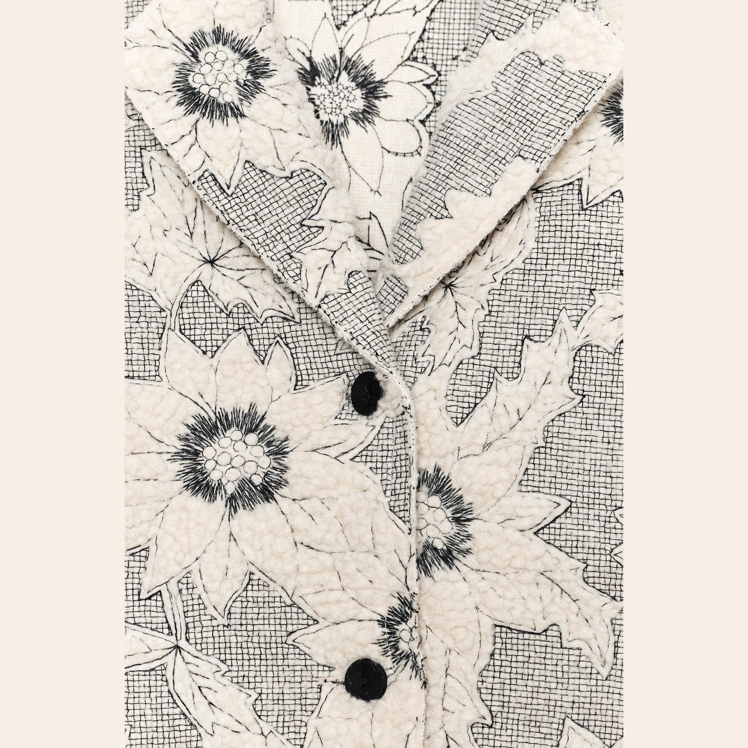 بليزر أنيق بلون أوف وايت مع تفاصيل زهور سوداء طبيعية، مصنوع من خامة منسوجة تمنح مظهرًا عصريًا وملمسًا عمليًا، مع بطانة داخلية من البوليستر لراحة إضافية. يتميز بياقة عريضة، أكمام طويلة، وتفاصيل تطريز زهور متباينة، مع إغلاق أمامي بأزرار. تصميم مثالي للإطلالات الرسمية أو الكاجوال الأنيقة.