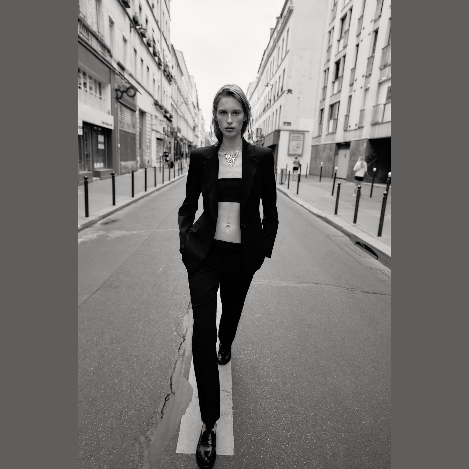 بليزر أنيق بلون أسود طبيعي، مصنوع من خامة ممزوجة تمنح مظهرًا عصريًا وملمسًا عمليًا، مع بطانة داخلية من الأسيتات لراحة إضافية. يتميز بياقة عريضة، أكمام طويلة مع أكتاف بارزة، وجيوب أمامية بغطاء، مع إغلاق أمامي بزر واحد. تصميم مثالي للإطلالات الرسمية أو الكاجوال الأنيقة.