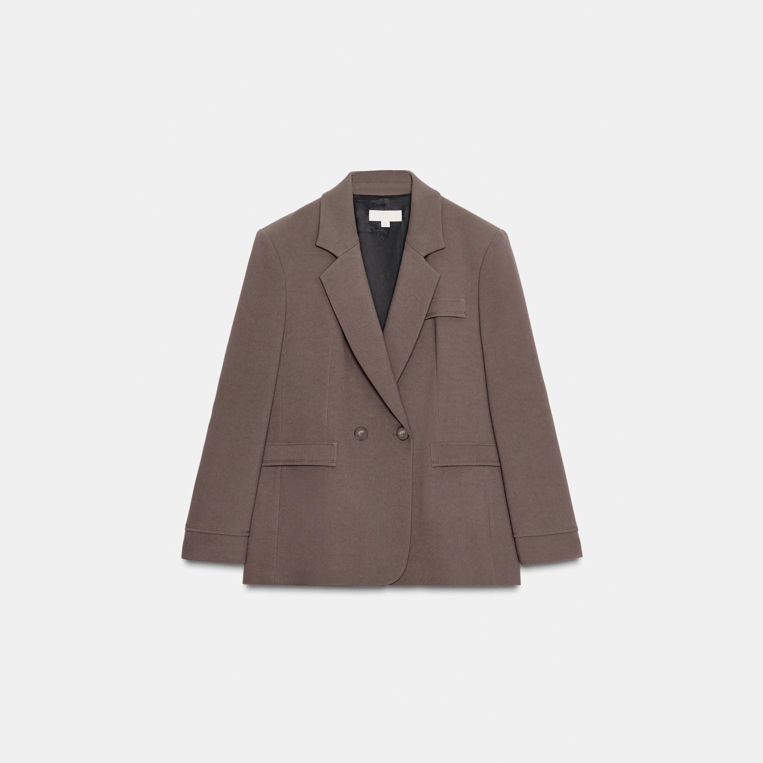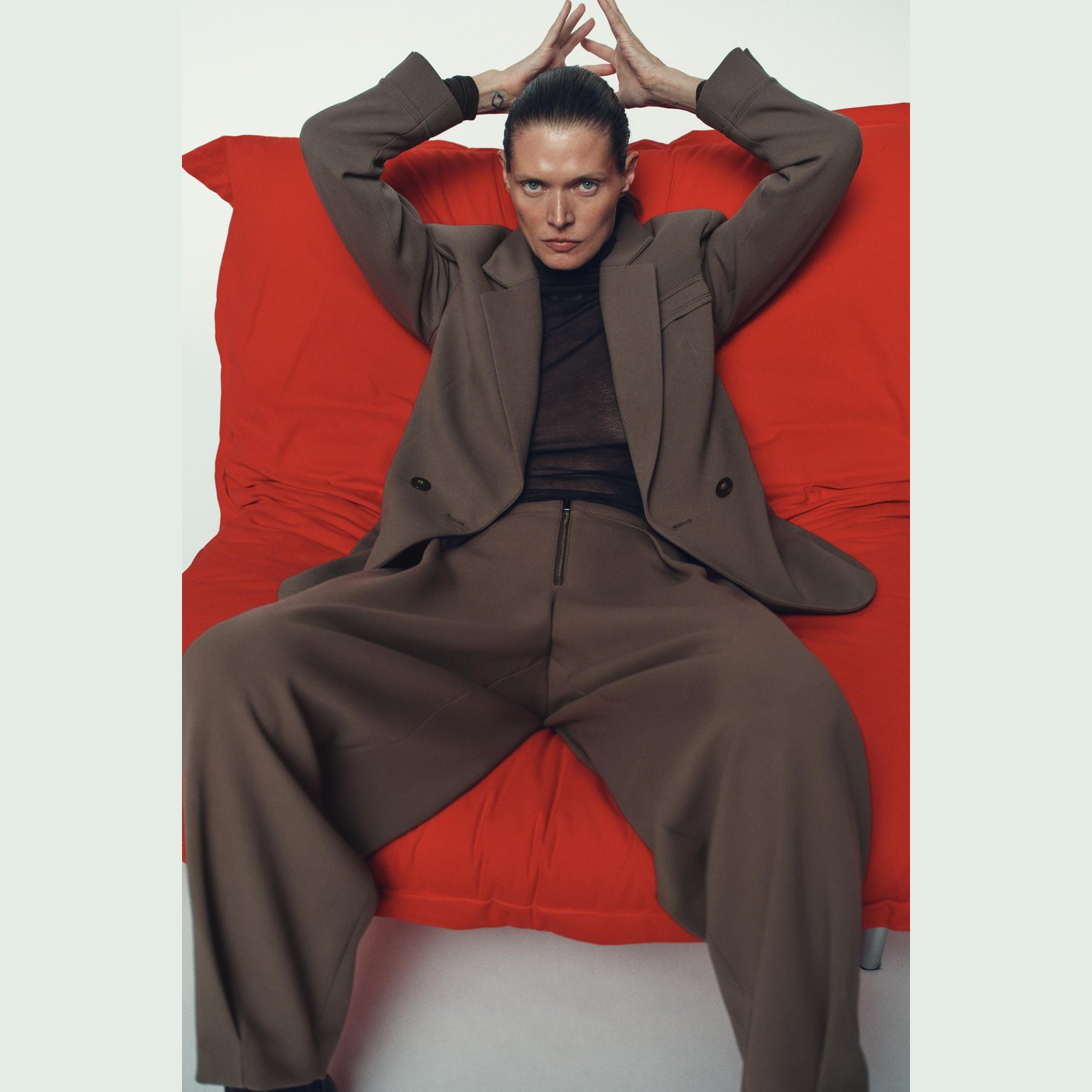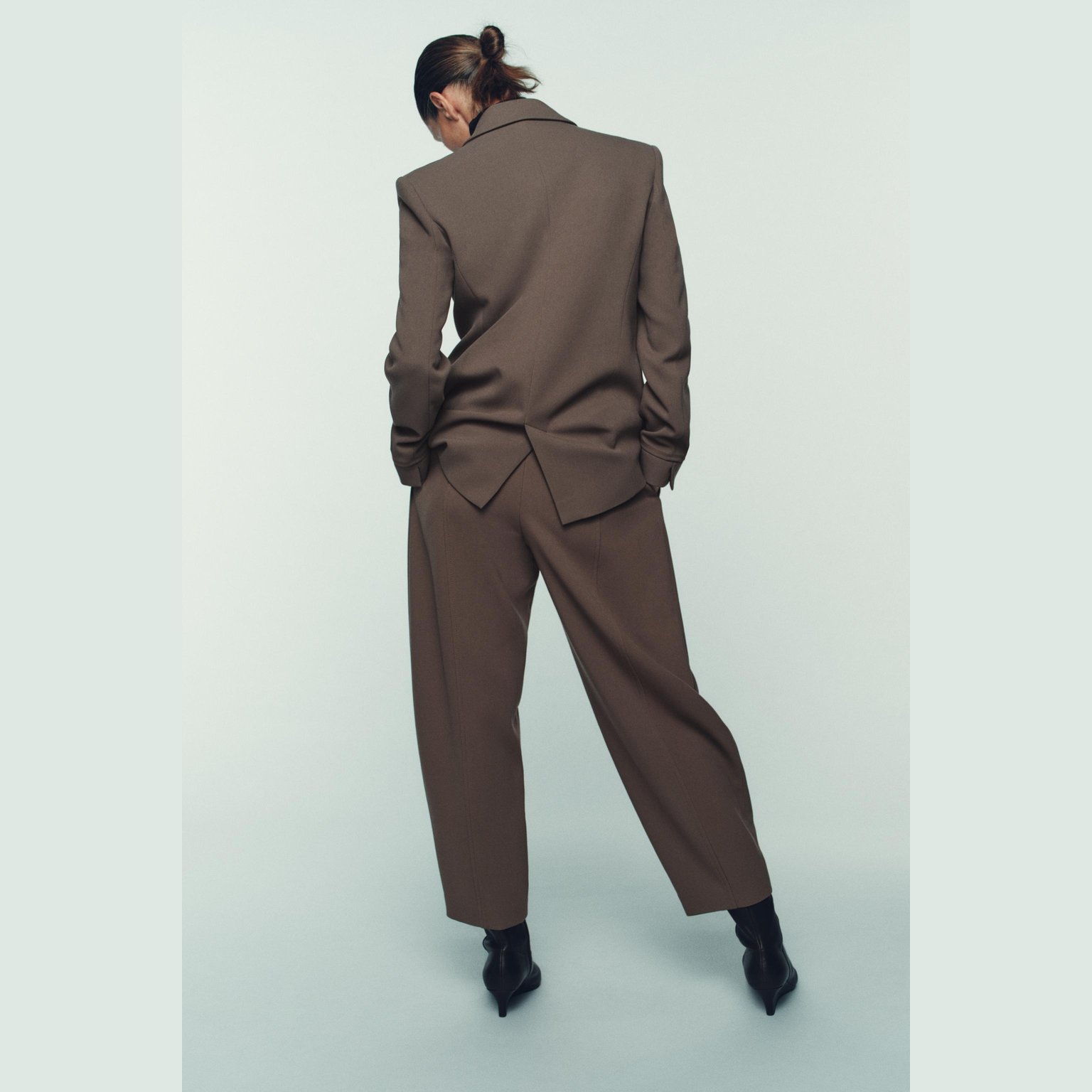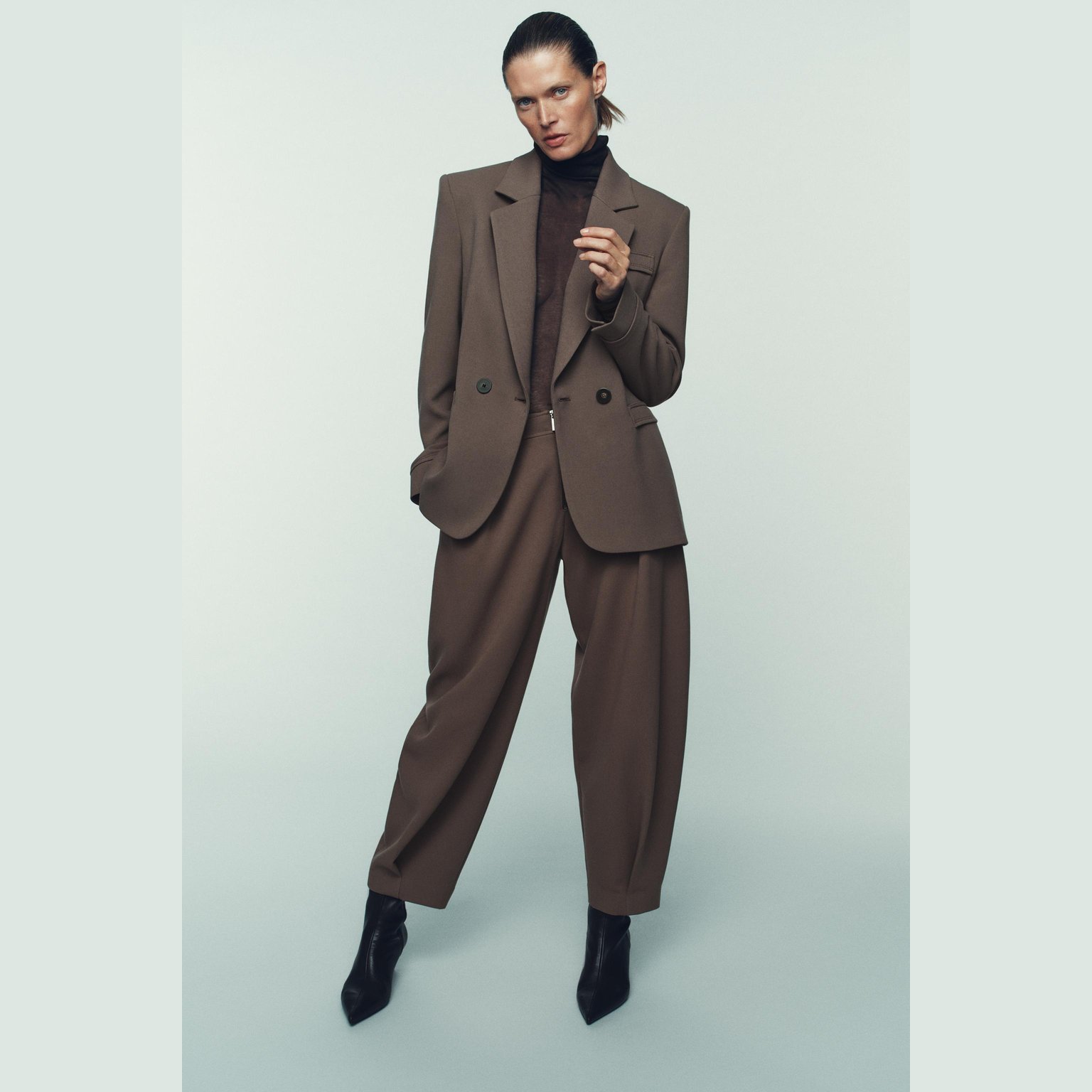 - التصميم: بليزر مزدوج الأزرار مع أكتاف بارزة (Double-Breasted Blazer with Shoulder Pads)