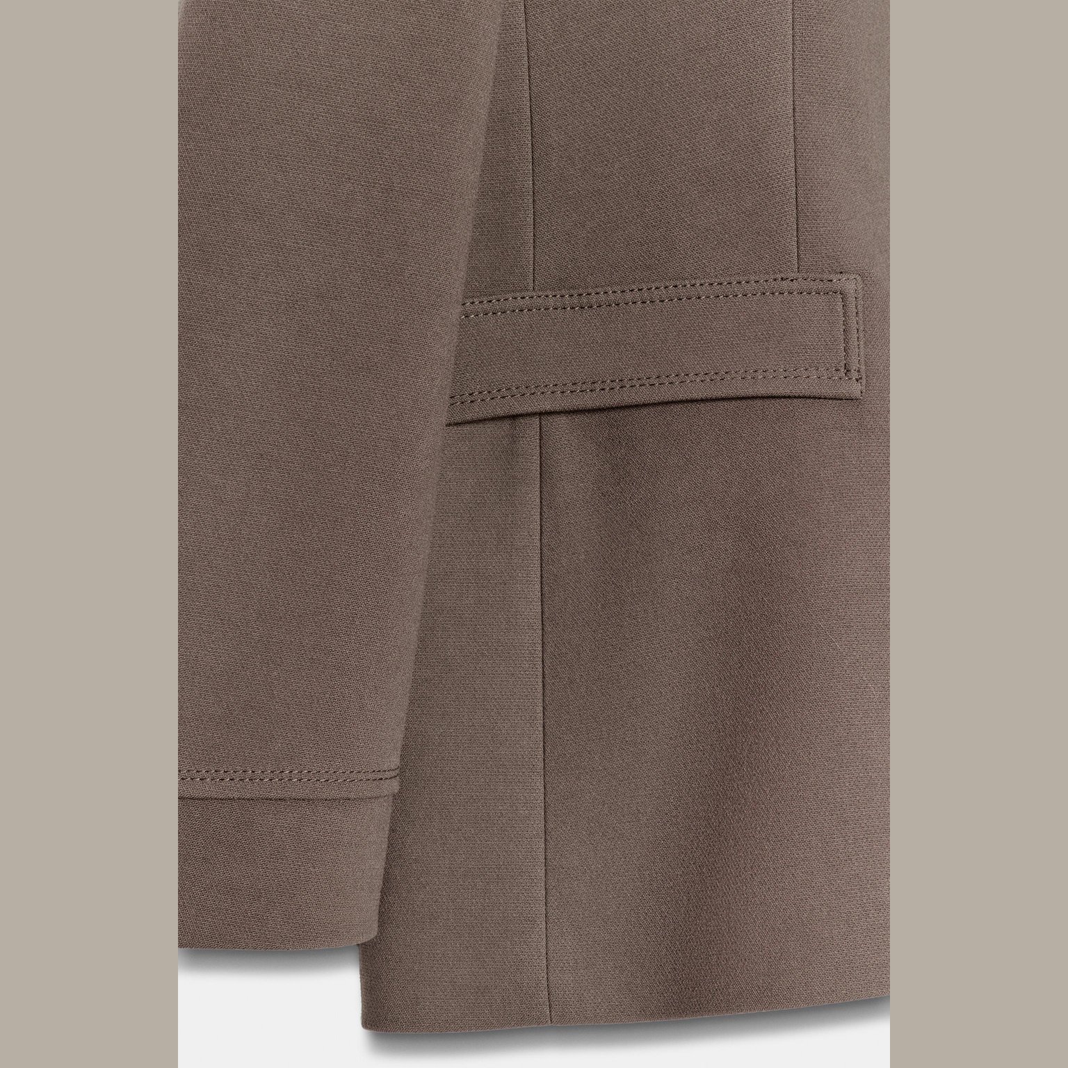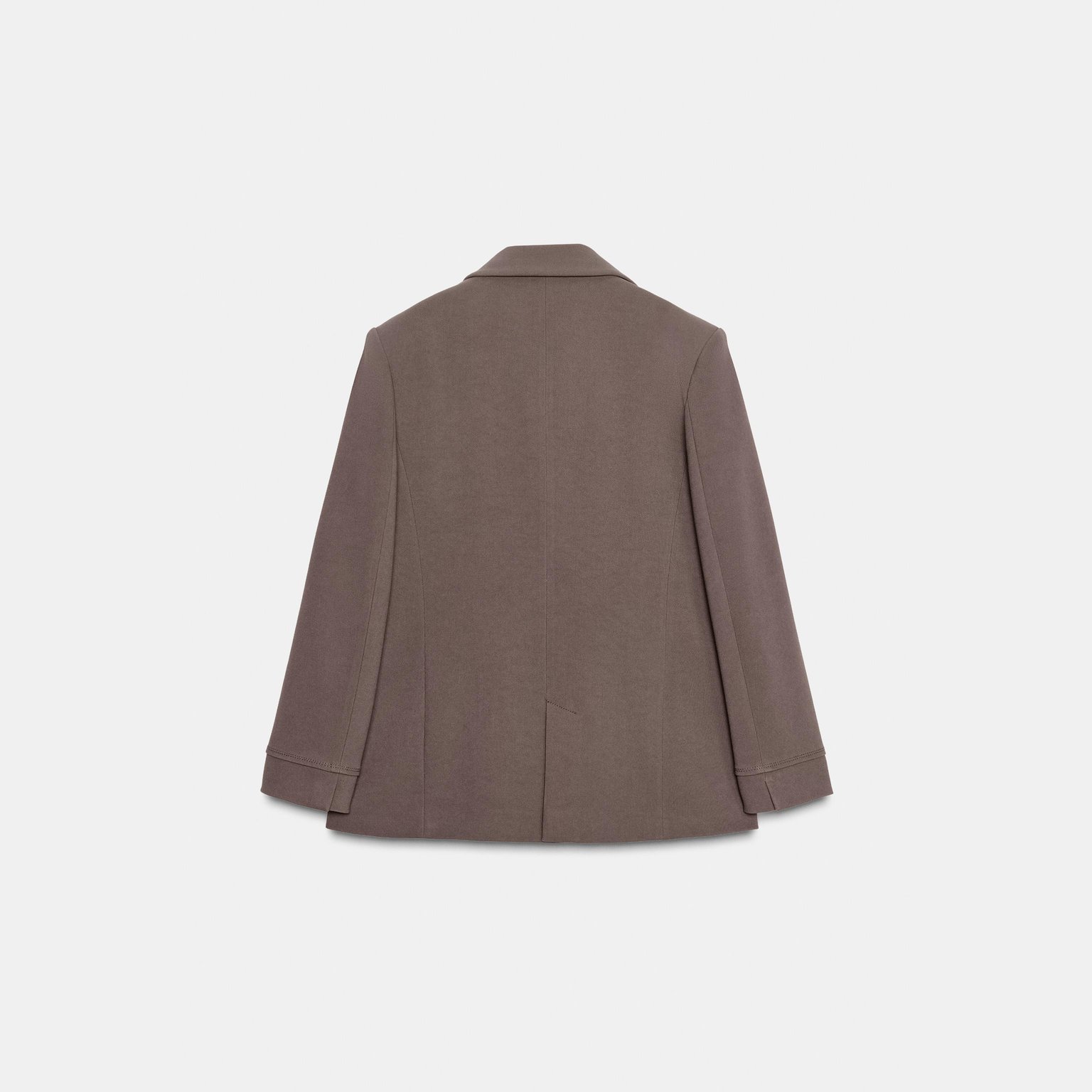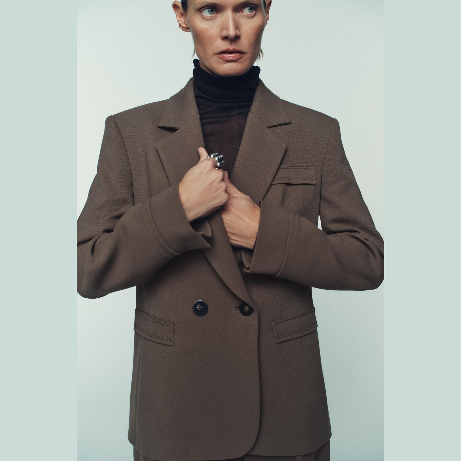 بليزر أنيق بلون جملي طبيعي، مصنوع من خامة ممزوجة تمنح مظهرًا عصريًا وملمسًا عمليًا، مع بطانة داخلية من الأسيتات لراحة إضافية. يتميز بياقة عريضة، أكمام طويلة مع أكتاف بارزة، جيوب أمامية بغطاء، فتحة خلفية عند الحاشية، وإغلاق أمامي مزدوج الأزرار. تصميم مثالي للإطلالات الرسمية أو الكاجوال الأنيقة.