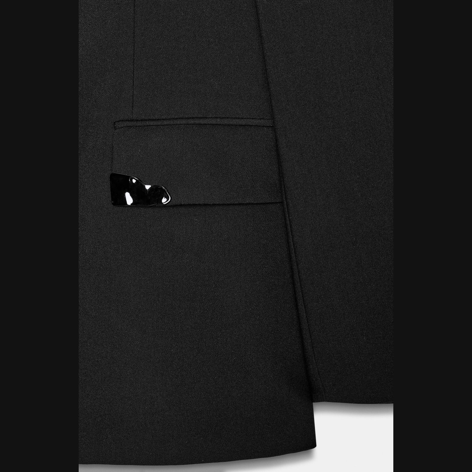 - الياقة: عريضة مزينة بتطريز لامع (Lapel Collar with Sparkly Appliqués)