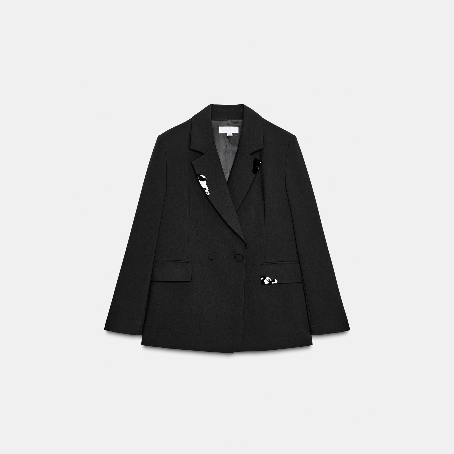 بليزر أوفرسايز مزدوج الأزرار مزين بتطريز على الياقة – لون طبيعي (أسود) – Black (Oversize Double-Breasted Blazer with Lapel Appliqués)